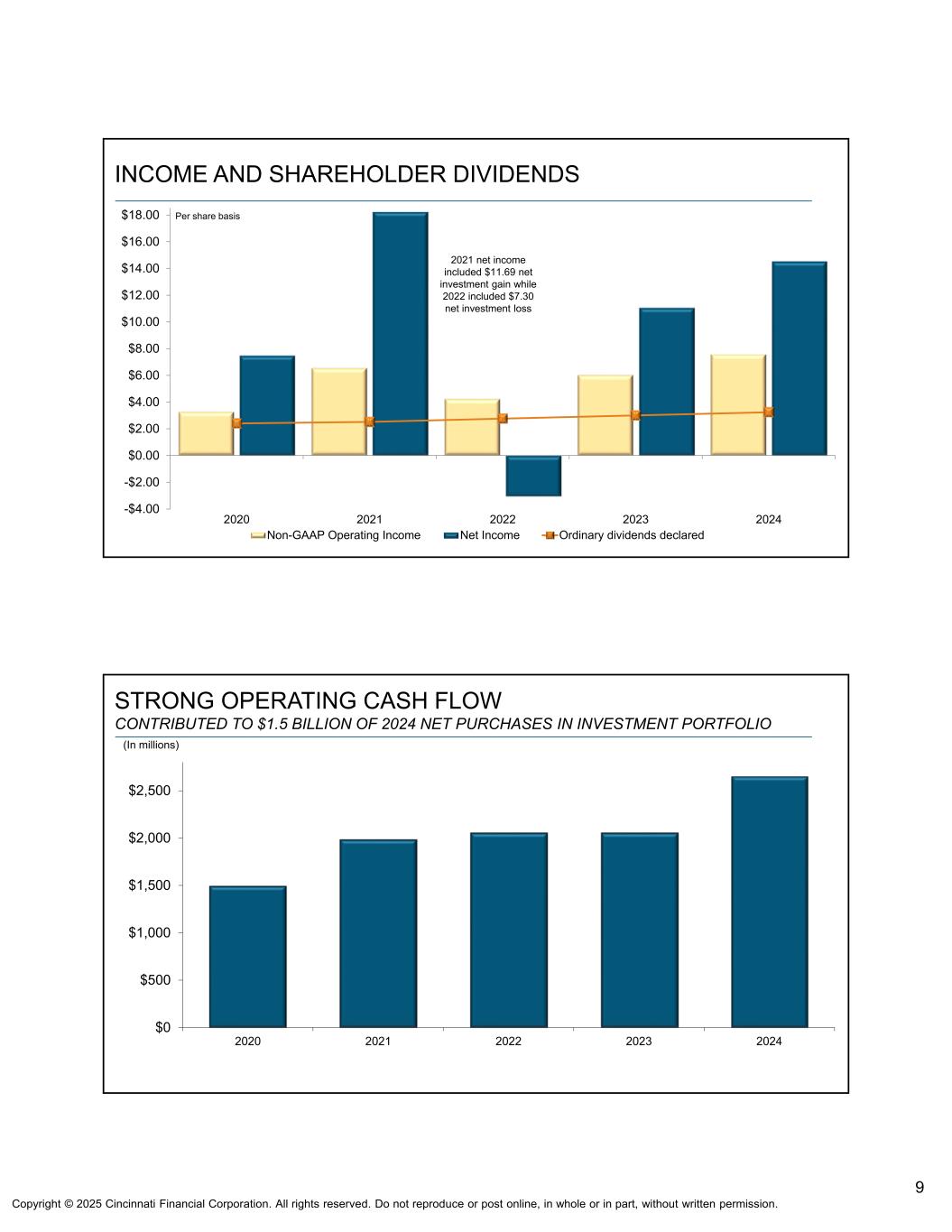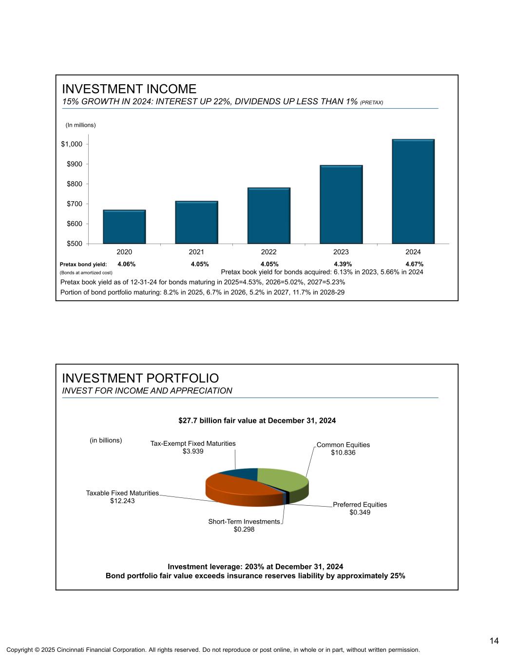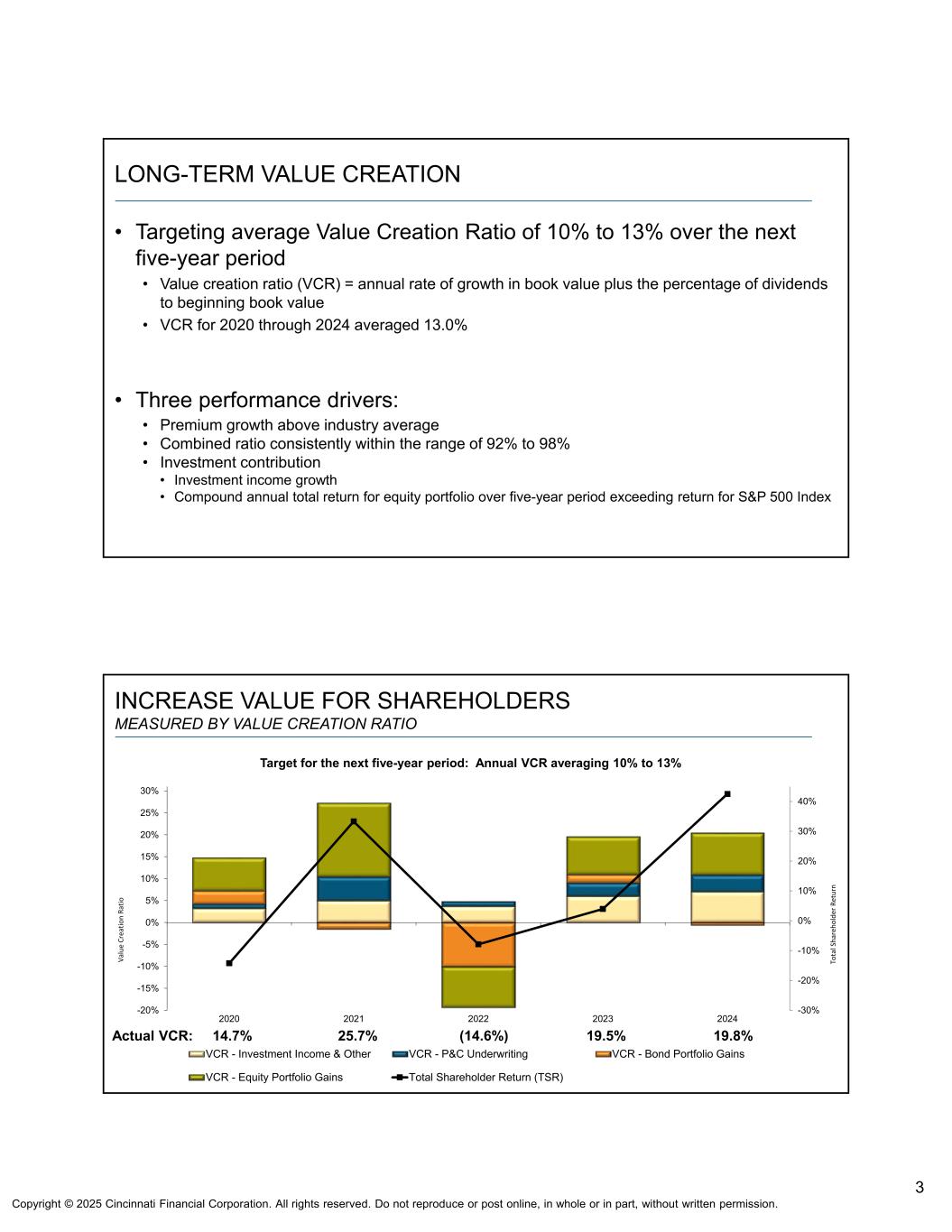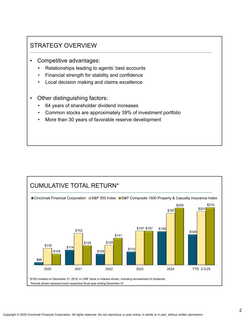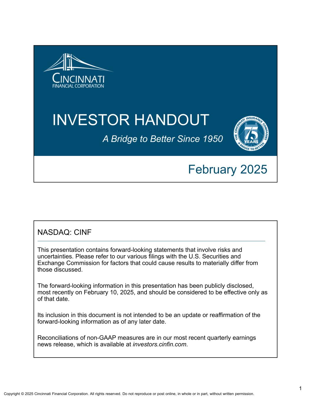 1 Copyright © 2025 Cincinnati Financial Corporation. All rights reserved. Do not reproduce or post online, in whole or in part, without written permission. INVESTOR HANDOUT A Bridge to Better Since 1950 February 2025 NASDAQ: CINF This presentation contains forward-looking statements that involve risks and uncertainties. Please refer to our various filings with the U.S. Securities and Exchange Commission for factors that could cause results to materially differ from those discussed. The forward-looking information in this presentation has been publicly disclosed, most recently on February 10, 2025, and should be considered to be effective only as of that date. Its inclusion in this document is not intended to be an update or reaffirmation of the forward-looking information as of any later date. Reconciliations of non-GAAP measures are in our most recent quarterly earnings news release, which is available at investors.cinfin.com.