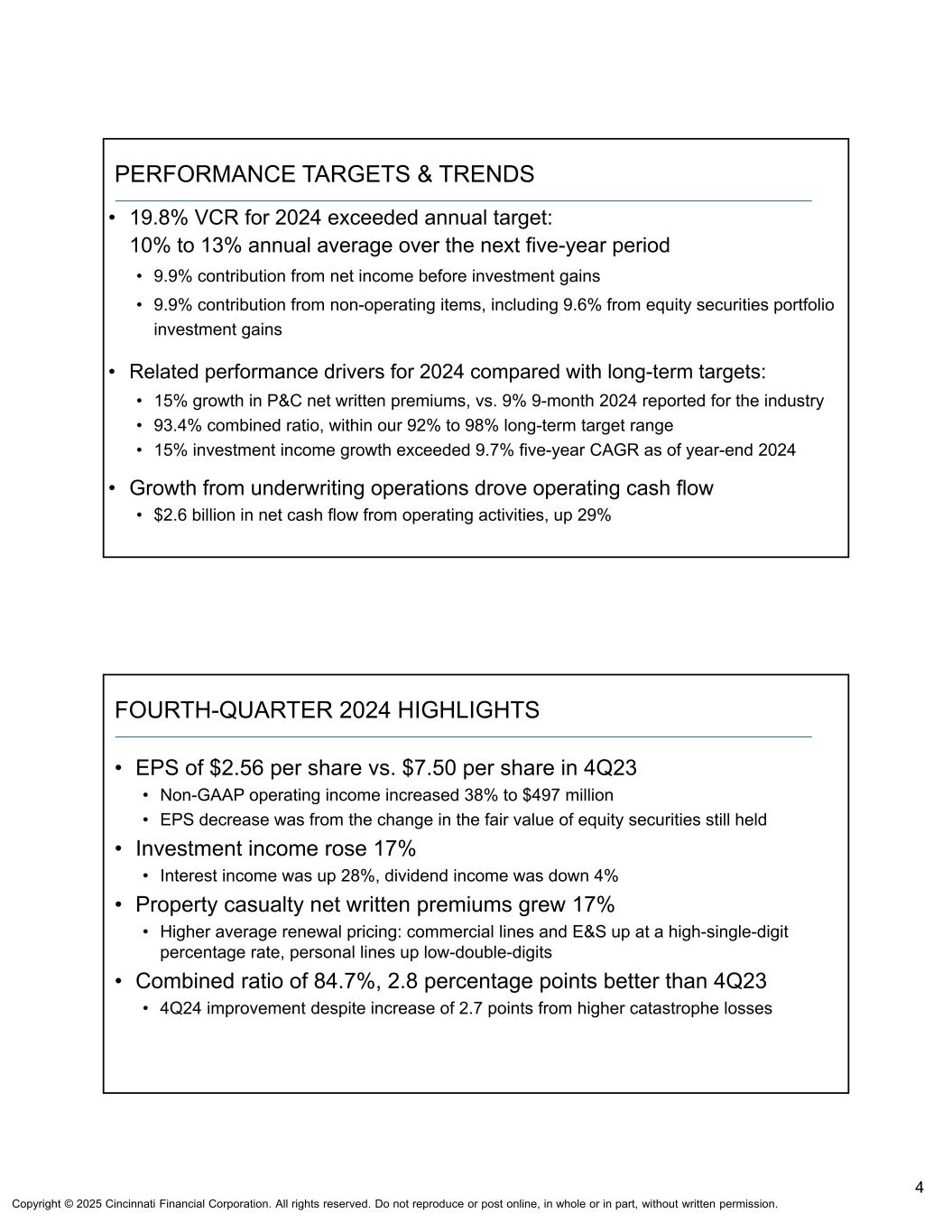3 Copyright © 2025 Cincinnati Financial Corporation. All rights reserved. Do not reproduce or post online, in whole or in part, without written permission. LONG-TERM VALUE CREATION • Targeting average Value Creation Ratio of 10% to 13% over the next five-year period • Value creation ratio (VCR) = annual rate of growth in book value plus the percentage of dividends to beginning book value • VCR for 2020 through 2024 averaged 13.0% • Three performance drivers: • Premium growth above industry average • Combined ratio consistently within the range of 92% to 98% • Investment contribution • Investment income growth • Compound annual total return for equity portfolio over five-year period exceeding return for S&P 500 Index INCREASE VALUE FOR SHAREHOLDERS MEASURED BY VALUE CREATION RATIO -30% -20% -10% 0% 10% 20% 30% 40% -20% -15% -10% -5% 0% 5% 10% 15% 20% 25% 30% 2020 2021 2022 2023 2024 VCR - Investment Income & Other VCR - P&C Underwriting VCR - Bond Portfolio Gains VCR - Equity Portfolio Gains Total Shareholder Return (TSR) Actual VCR: 14.7% 25.7% (14.6%) 19.5% 19.8% Target for the next five-year period: Annual VCR averaging 10% to 13% V al u e C re at io n R at io To ta l S h ar eh o ld er R et u rn