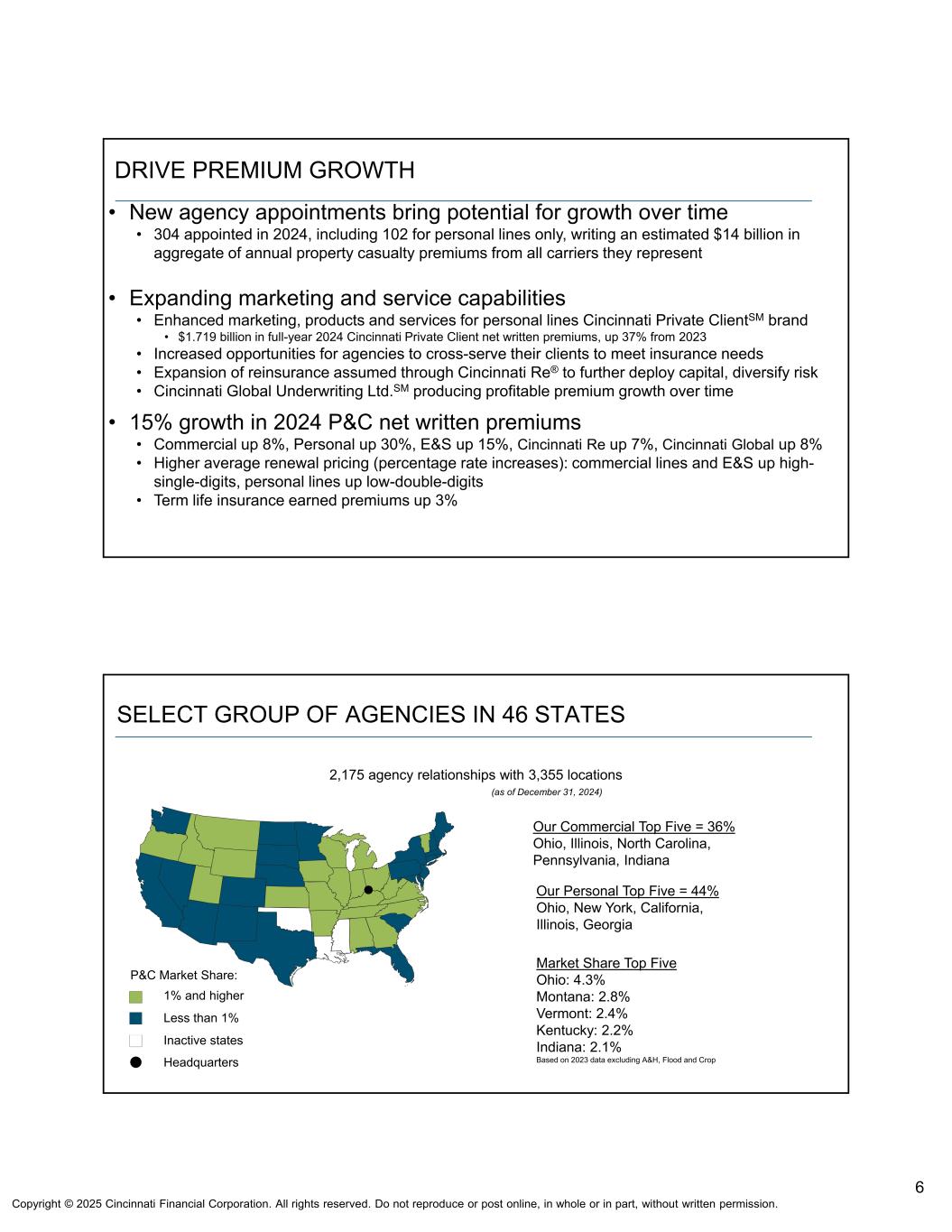 5 Copyright © 2025 Cincinnati Financial Corporation. All rights reserved. Do not reproduce or post online, in whole or in part, without written permission. STRATEGIES FOR LONG-TERM SUCCESS • Financial strength for consistent support to agencies • Diversified fixed-maturity portfolio, laddered maturity structure • No corporate exposure exceeded 0.6% of total bond portfolio at 12-31-24, no municipal exposure exceeded 0.1% • 39.2% of investment portfolio in common stocks to grow book value • No single security exceeded 8.3% of publicly traded common stock portfolio • Portfolio composition helps mitigate anticipated effects of inflation and a rise in interest rates • Low reliance on debt, with 5.5% debt-to-total-capital at 12-31-24 • Nonconvertible, noncallable debentures due in 2028 and 2034 • Capacity for growth with premiums-to-surplus at 1.0-to-1 • Operating structure reflects agency-centered model • Field focus – staffed for local decision making, agency support • Superior claims service and broad insurance product offerings • Profit improvement and premium growth initiatives MANAGE INSURANCE PROFITABILITY • Ongoing underwriting expertise enhancement • Predictive modeling tools and analytics to improve property casualty pricing precision and segmentation on an individual policy basis • Data management for better underwriting and more granular pricing decisions • Associate specialization and augmentation aimed at lowering loss ratios • Improving efficiencies and ease of use with technology • Streamlines processing for agencies and the company • Helps optimize personalized service • Investing for the future • To improve profitability with rate adequacy and risk selection/loss control initiatives • To diversify risk by expanding operations into new geographies and product areas • Strategic investments with modest short-term effects on expense ratios • 15% increase in field associates since the end of 2019, supporting healthy premium growth