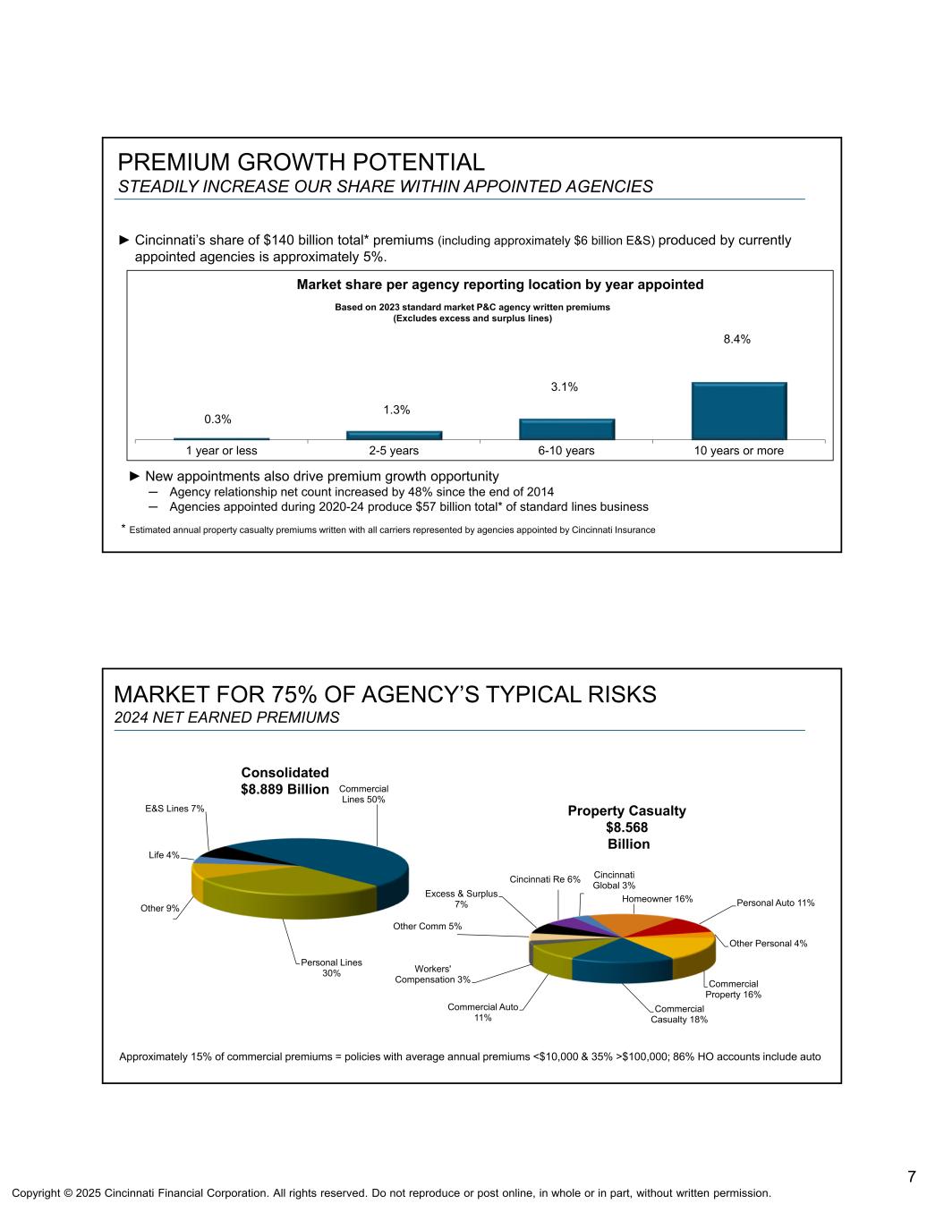 6 Copyright © 2025 Cincinnati Financial Corporation. All rights reserved. Do not reproduce or post online, in whole or in part, without written permission. DRIVE PREMIUM GROWTH • New agency appointments bring potential for growth over time • 304 appointed in 2024, including 102 for personal lines only, writing an estimated $14 billion in aggregate of annual property casualty premiums from all carriers they represent • Expanding marketing and service capabilities • Enhanced marketing, products and services for personal lines Cincinnati Private ClientSM brand • $1.719 billion in full-year 2024 Cincinnati Private Client net written premiums, up 37% from 2023 • Increased opportunities for agencies to cross-serve their clients to meet insurance needs • Expansion of reinsurance assumed through Cincinnati Re® to further deploy capital, diversify risk • Cincinnati Global Underwriting Ltd.SM producing profitable premium growth over time • 15% growth in 2024 P&C net written premiums • Commercial up 8%, Personal up 30%, E&S up 15%, Cincinnati Re up 7%, Cincinnati Global up 8% • Higher average renewal pricing (percentage rate increases): commercial lines and E&S up high- single-digits, personal lines up low-double-digits • Term life insurance earned premiums up 3% SELECT GROUP OF AGENCIES IN 46 STATES P&C Market Share: 2,175 agency relationships with 3,355 locations Our Commercial Top Five = 36% Ohio, Illinois, North Carolina, Pennsylvania, Indiana Our Personal Top Five = 44% Ohio, New York, California, Illinois, Georgia 1% and higher Less than 1% Inactive states Headquarters (as of December 31, 2024) Market Share Top Five Ohio: 4.3% Montana: 2.8% Vermont: 2.4% Kentucky: 2.2% Indiana: 2.1% Based on 2023 data excluding A&H, Flood and Crop
