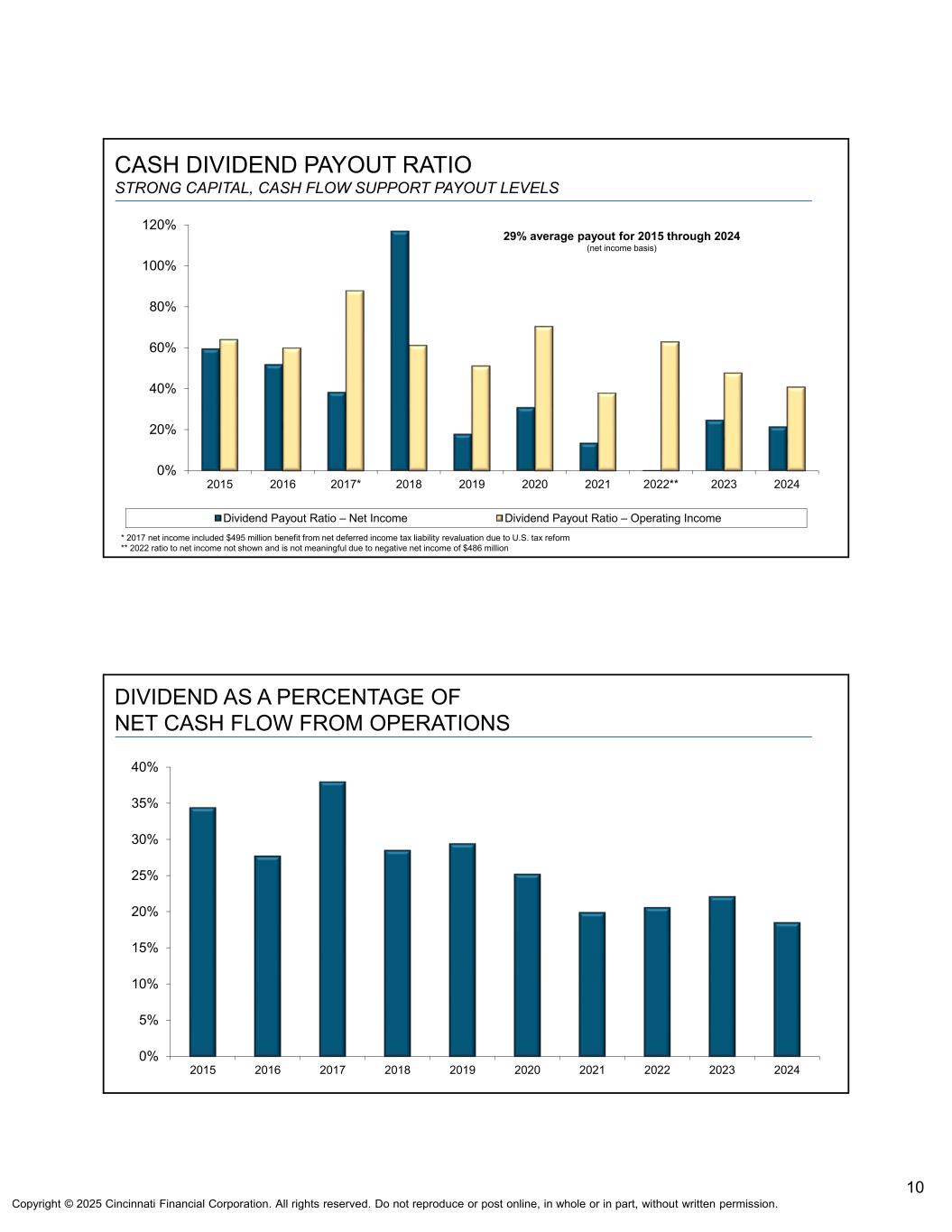 9 Copyright © 2025 Cincinnati Financial Corporation. All rights reserved. Do not reproduce or post online, in whole or in part, without written permission. INCOME AND SHAREHOLDER DIVIDENDS -$4.00 -$2.00 $0.00 $2.00 $4.00 $6.00 $8.00 $10.00 $12.00 $14.00 $16.00 $18.00 2020 2021 2022 2023 2024 Non-GAAP Operating Income Net Income Ordinary dividends declared Per share basis 2021 net income included $11.69 net investment gain while 2022 included $7.30 net investment loss STRONG OPERATING CASH FLOW CONTRIBUTED TO $1.5 BILLION OF 2024 NET PURCHASES IN INVESTMENT PORTFOLIO $0 $500 $1,000 $1,500 $2,000 $2,500 2020 2021 2022 2023 2024 (In millions)
