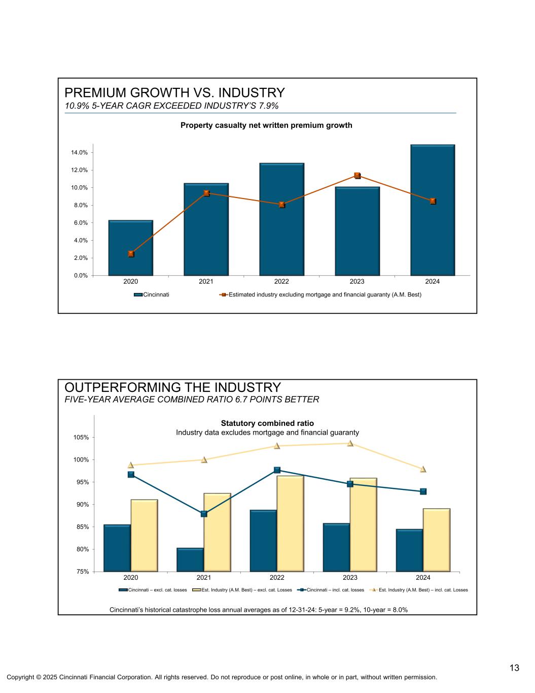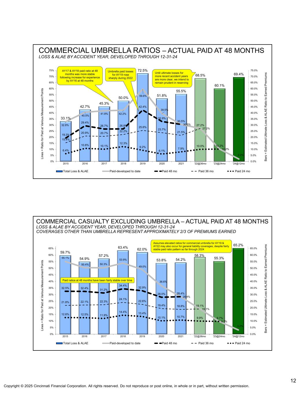 12 Copyright © 2025 Cincinnati Financial Corporation. All rights reserved. Do not reproduce or post online, in whole or in part, without written permission. COMMERCIAL UMBRELLA RATIOS – ACTUAL PAID AT 48 MONTHS LOSS & ALAE BY ACCIDENT YEAR, DEVELOPED THROUGH 12-31-24 L in e s = R a tio fo r P a id a t V a rio u s M e a su re m en t P o in ts B a rs = E st im a te d U lti m a te L o ss & A L A E R a tio to E a rn e d P re m iu m s 33.1% 42.7% 45.3% 50.0% 72.5% 51.8% 55.5% 68.5% 60.1% 69.4% 32.8% 40.5% 41.8% 42.2% 59.6% 39.5% 30.5% 27.2% 10.2% 2.0% 19.3% 29.4% 26.7% 26.8% 42.4% 32.9% 30.5% 15.4% 20.9% 20.7% 22.2% 25.6% 23.7% 21.5% 27.2% 6.4% 10.8% 10.1% 12.3% 9.2% 6.1% 7.9% 10.0% 10.2% 0.0% 5.0% 10.0% 15.0% 20.0% 25.0% 30.0% 35.0% 40.0% 45.0% 50.0% 55.0% 60.0% 65.0% 70.0% 75.0% 0% 5% 10% 15% 20% 25% 30% 35% 40% 45% 50% 55% 60% 65% 70% 75% 2015 2016 2017 2018 2019 2020 2021 '22@36mo '23@24mo '24@12mo Total Loss & ALAE Paid-developed to date Paid 48 mo Paid 36 mo Paid 24 mo AY17 & AY18 paid ratio at 48 months was more stable following increase for experience by AY16 at 48 months Umbrella paid losses for AY19 rose sharply during 2022 Until ultimate losses for more recent accident years are more clear, we intend to remain prudent in reserving COMMERCIAL CASUALTY EXCLUDING UMBRELLA – ACTUAL PAID AT 48 MONTHS LOSS & ALAE BY ACCIDENT YEAR, DEVELOPED THROUGH 12-31-24 COVERAGES OTHER THAN UMBRELLA REPRESENT APPROXIMATELY 2/3 OF PREMIUMS EARNED L in e s = R a tio fo r P a id a t V a rio u s M e a su re m en t P o in ts B a rs = E st im a te d U lti m a te L o ss & A L A E R a tio to E a rn e d P re m iu m s 59.7% 54.9% 57.2% 63.4% 62.0% 53.8% 54.2% 58.3% 55.3% 65.2% 55.1% 50.4% 50.3% 53.9% 49.0% 36.6% 28.4% 19.1% 9.7% 3.2% 32.5% 32.4% 31.2% 34.4% 32.9% 28.0% 28.4% 21.8% 22.1% 22.3% 24.1% 22.6% 19.4% 18.8% 19.1% 12.6% 12.5% 11.9% 14.4% 13.4% 10.1% 10.7% 9.9% 9.7% 0.0% 5.0% 10.0% 15.0% 20.0% 25.0% 30.0% 35.0% 40.0% 45.0% 50.0% 55.0% 60.0% 65.0% 0% 5% 10% 15% 20% 25% 30% 35% 40% 45% 50% 55% 60% 65% 2015 2016 2017 2018 2019 2020 2021 '22@36mo '23@24mo '24@12mo Total Loss & ALAE Paid-developed to date Paid 48 mo Paid 36 mo Paid 24 mo Paid ratios at 48 months have been fairly stable over time Assumes elevated ratios for commercial umbrella for AY19 & AY22 may also occur for general liability coverages, despite fairly stable paid ratio pattern so far through 2024