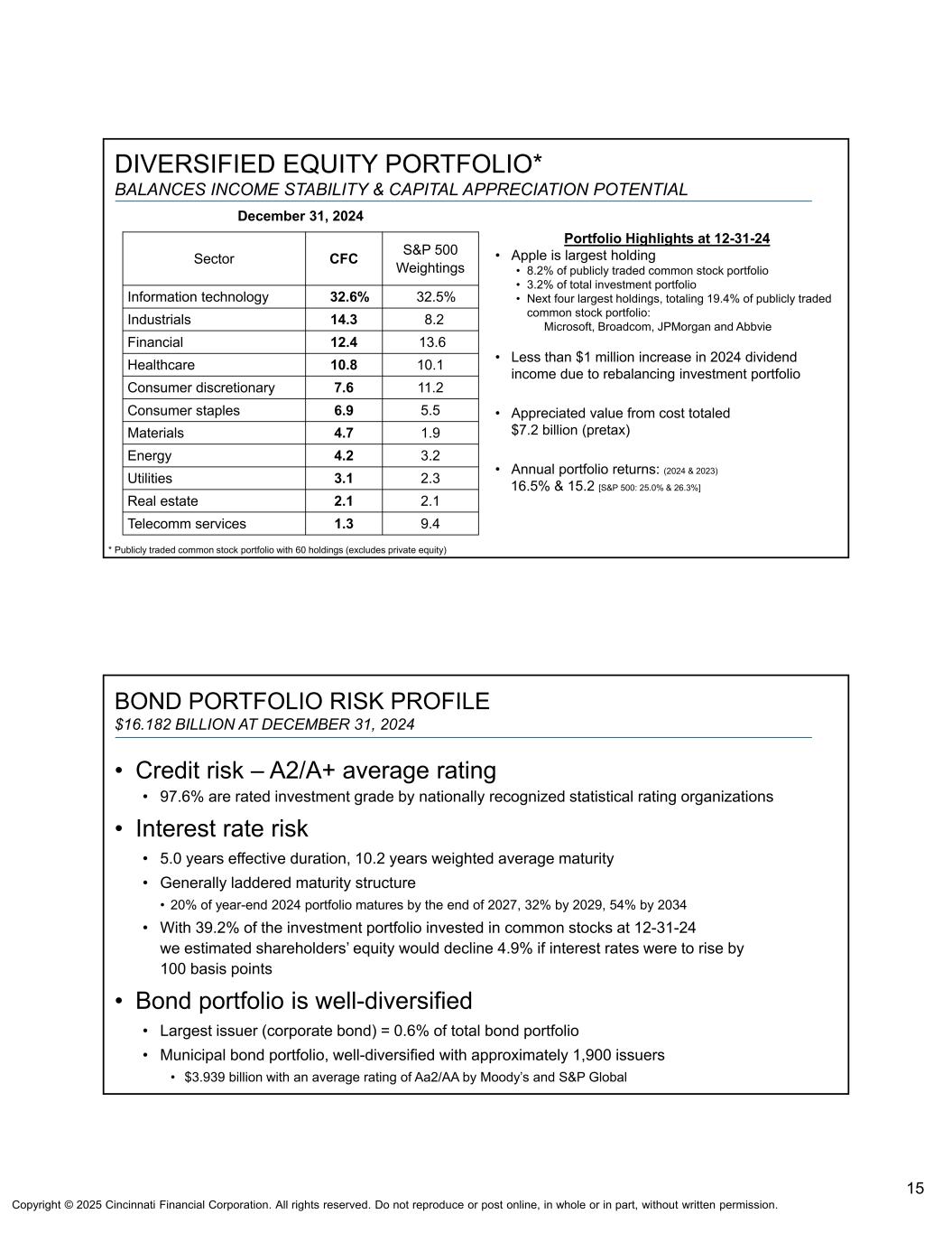 14 Copyright © 2025 Cincinnati Financial Corporation. All rights reserved. Do not reproduce or post online, in whole or in part, without written permission. INVESTMENT INCOME 15% GROWTH IN 2024: INTEREST UP 22%, DIVIDENDS UP LESS THAN 1% (PRETAX) $500 $600 $700 $800 $900 $1,000 2020 2021 2022 2023 2024 (In millions) Pretax bond yield: 4.06% 4.05% 4.05% 4.39% 4.67% (Bonds at amortized cost) Pretax book yield for bonds acquired: 6.13% in 2023, 5.66% in 2024 Pretax book yield as of 12-31-24 for bonds maturing in 2025=4.53%, 2026=5.02%, 2027=5.23% Portion of bond portfolio maturing: 8.2% in 2025, 6.7% in 2026, 5.2% in 2027, 11.7% in 2028-29 INVESTMENT PORTFOLIO INVEST FOR INCOME AND APPRECIATION Taxable Fixed Maturities $12.243 Tax-Exempt Fixed Maturities $3.939 Common Equities $10.836 Preferred Equities $0.349 Short-Term Investments $0.298 Investment leverage: 203% at December 31, 2024 Bond portfolio fair value exceeds insurance reserves liability by approximately 25% $27.7 billion fair value at December 31, 2024 (in billions)