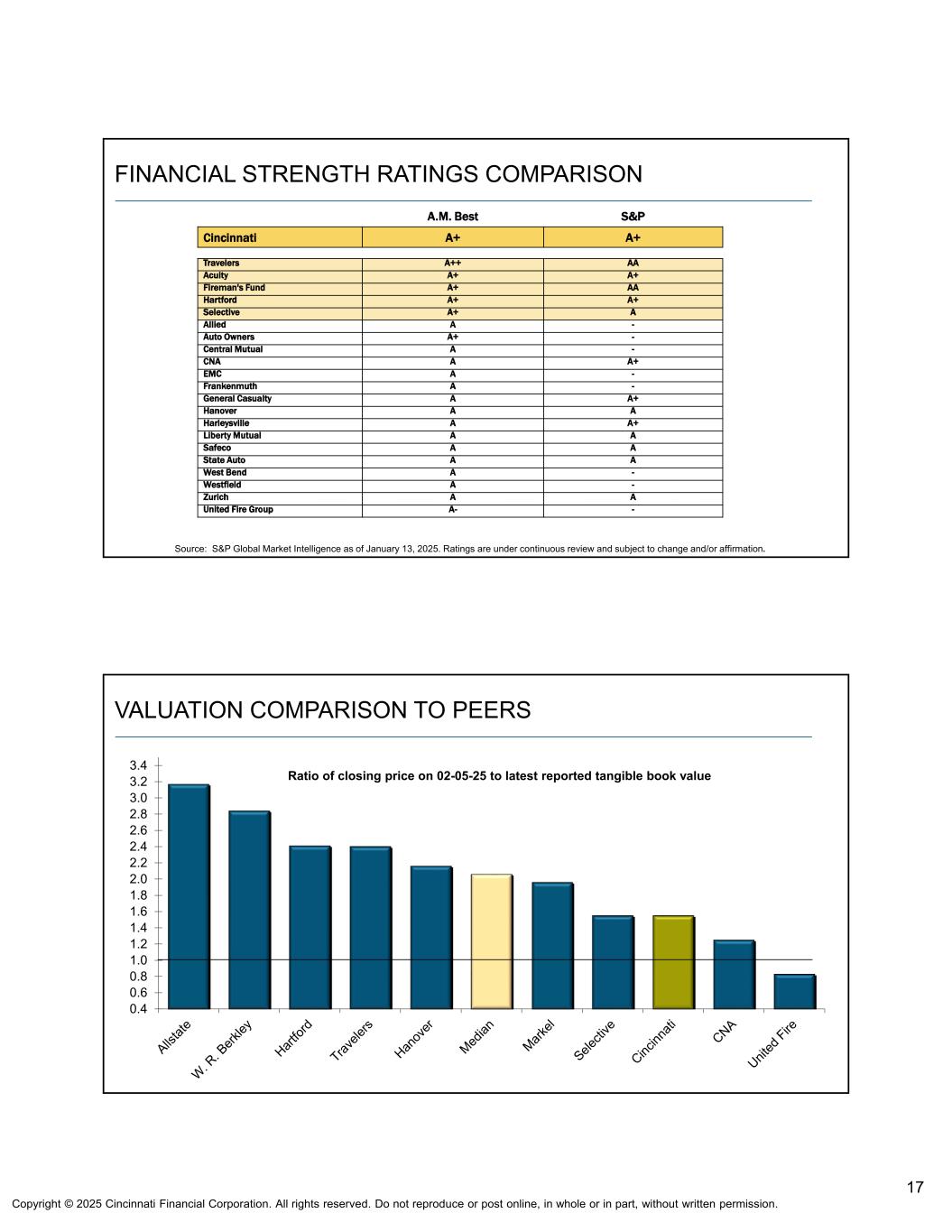 16 Copyright © 2025 Cincinnati Financial Corporation. All rights reserved. Do not reproduce or post online, in whole or in part, without written permission. SOLID REINSURANCE CEDED PROGRAM BALANCES COSTS WITH SHAREHOLDERS’ EQUITY PROTECTION Coverage & Retention Summary (As of January 1, 2025) Major Treaties (Estimated 2025 ceded premiums) For a single event: • Retain 100% of first $200 million in losses • Retention varies between $200 million & $1.5 billion • Max exposure for $1.5 billion event = $431 million • PML – combined including Cincinnati Re & Cincinnati Global 1-in-100 year event = 4.5% 1-in-250 year = 6.8% (% of shareholders’ equity at 12-31-24) Property catastrophe ($98 million) • Treaty has one reinstatement provision • Cincinnati Re has separate catastrophe excess of loss coverage • $60 million total available aggregate limit in excess of $80 million per loss • Cincinnati Global has separate treaties for reinsurance For a single loss: • Retain 100% of first $15 million in losses • Retain 0% of losses $15-110 million • Facultative reinsurance for >$110 million Property per risk & $75 million property excess treaties ($66 million) For a single loss: • Retain 100% of first $10 million in losses • Retain 0% of losses $10-25 million • Facultative reinsurance for >$25 million Casualty per occurrence ($21 million) Workers’ comp, extra-contractual & clash coverage: • $25 million excess of $25 million (first excess treaty) • $30 million excess of $50 million (second treaty) Casualty excess treaties ($5 million for two treaties combined) Primary reinsurers are Swiss Re, Munich Re, Hannover Ruck, Partner Re, TransRe and Lloyd’s of London ADDITIONAL AGENCY STATISTICS • 46% of 3,355 year-end 2024 reporting locations include: • 29% private equity, 13% national brokers, 4% banks • Private equity percentage more than doubled compared with year-end 2018 • National brokers up 4 percentage points, banks down 1 point compared with year-end 2018 • 2024 contribution to new business written premiums (standard lines market) • 31% private equity-owned agencies 15% national brokers • 3% bank-owned 51% privately-owned or regional/cluster agencies • 5.7% for largest contributor, among the largest are: • Acrisure, A.J. Gallagher, Assured Partners, BroadStreet Partners, HUB, Keystone, MMA, SecureRisk, USI • 89 locations acquired during 2024, including: • 48 by a private equity firm, 12 by a regional or national broker, 26 by another Cincinnati agency and 3 by a non-Cincinnati agency