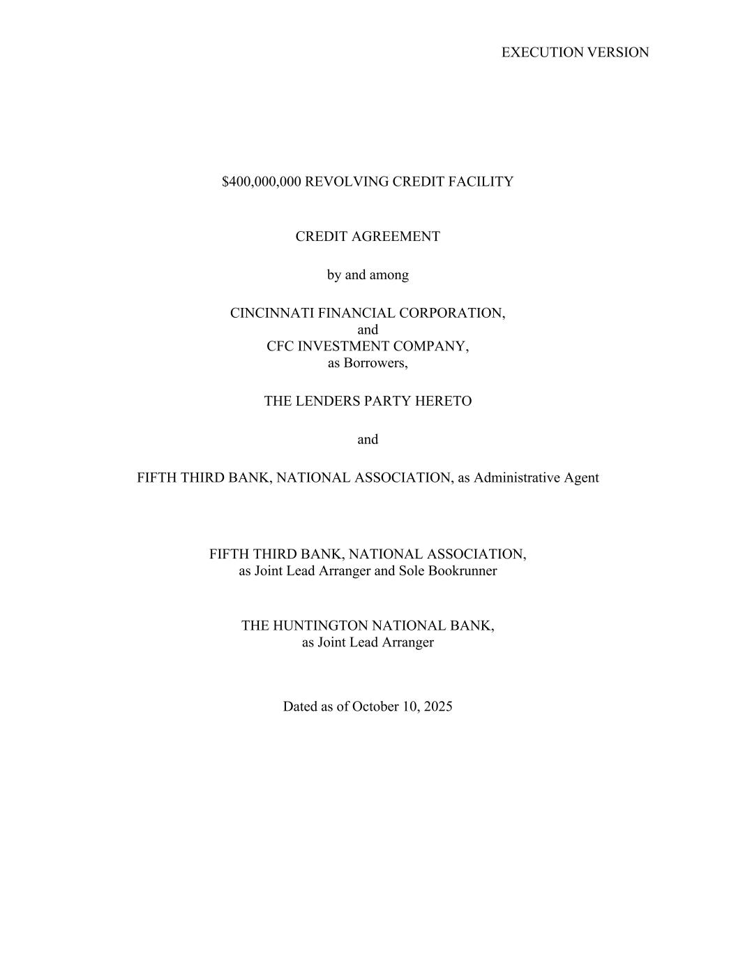 EXECUTION VERSION $400,000,000 REVOLVING CREDIT FACILITY CREDIT AGREEMENT by and among CINCINNATI FINANCIAL CORPORATION, and CFC INVESTMENT COMPANY, as Borrowers, THE LENDERS PARTY HERETO and FIFTH THIRD BANK, NATIONAL ASSOCIATION, as Administrative Agent FIFTH THIRD BANK, NATIONAL ASSOCIATION, as Joint Lead Arranger and Sole Bookrunner THE HUNTINGTON NATIONAL BANK, as Joint Lead Arranger Dated as of October 10, 2025