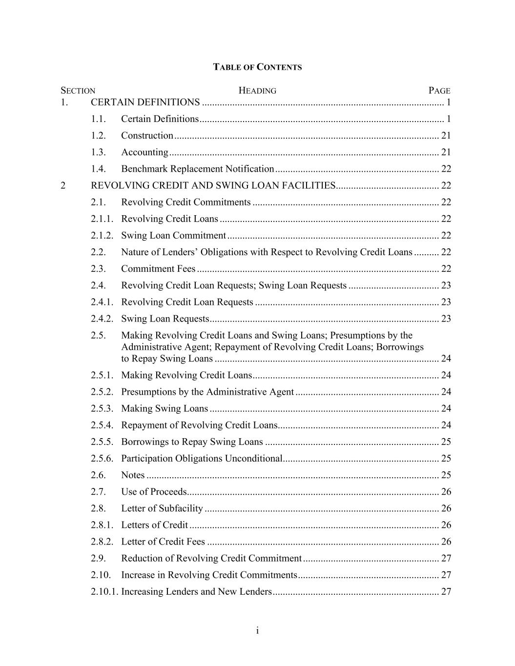i TABLE OF CONTENTS SECTION HEADING PAGE 1. CERTAIN DEFINITIONS ................................................................................................ 1 1.1. Certain Definitions ................................................................................................. 1 1.2. Construction ......................................................................................................... 21 1.3. Accounting ........................................................................................................... 21 1.4. Benchmark Replacement Notification ................................................................. 22 2 REVOLVING CREDIT AND SWING LOAN FACILITIES ......................................... 22 2.1. Revolving Credit Commitments .......................................................................... 22 2.1.1. Revolving Credit Loans ....................................................................................... 22 2.1.2. Swing Loan Commitment .................................................................................... 22 2.2. Nature of Lenders’ Obligations with Respect to Revolving Credit Loans .......... 22 2.3. Commitment Fees ................................................................................................ 22 2.4. Revolving Credit Loan Requests; Swing Loan Requests .................................... 23 2.4.1. Revolving Credit Loan Requests ......................................................................... 23 2.4.2. Swing Loan Requests ........................................................................................... 23 2.5. Making Revolving Credit Loans and Swing Loans; Presumptions by the Administrative Agent; Repayment of Revolving Credit Loans; Borrowings to Repay Swing Loans ......................................................................................... 24 2.5.1. Making Revolving Credit Loans .......................................................................... 24 2.5.2. Presumptions by the Administrative Agent ......................................................... 24 2.5.3. Making Swing Loans ........................................................................................... 24 2.5.4. Repayment of Revolving Credit Loans................................................................ 24 2.5.5. Borrowings to Repay Swing Loans ..................................................................... 25 2.5.6. Participation Obligations Unconditional .............................................................. 25 2.6. Notes .................................................................................................................... 25 2.7. Use of Proceeds .................................................................................................... 26 2.8. Letter of Subfacility ............................................................................................. 26 2.8.1. Letters of Credit ................................................................................................... 26 2.8.2. Letter of Credit Fees ............................................................................................ 26 2.9. Reduction of Revolving Credit Commitment ...................................................... 27 2.10. Increase in Revolving Credit Commitments ........................................................ 27 2.10.1. Increasing Lenders and New Lenders .................................................................. 27