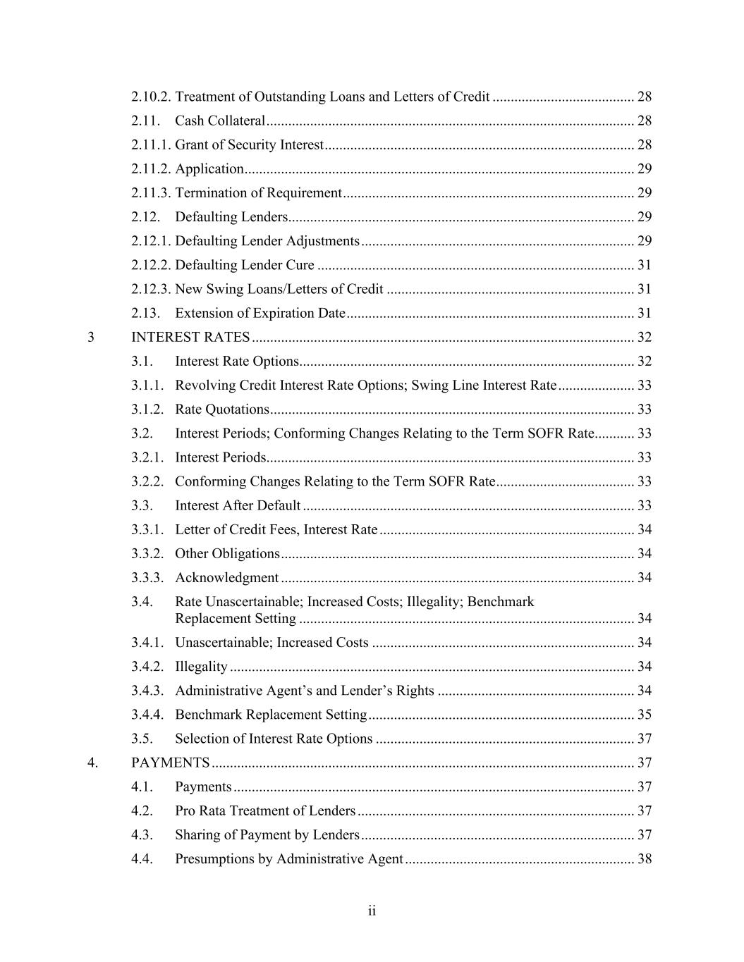 ii 2.10.2. Treatment of Outstanding Loans and Letters of Credit ....................................... 28 2.11. Cash Collateral ..................................................................................................... 28 2.11.1. Grant of Security Interest ..................................................................................... 28 2.11.2. Application ........................................................................................................... 29 2.11.3. Termination of Requirement ................................................................................ 29 2.12. Defaulting Lenders ............................................................................................... 29 2.12.1. Defaulting Lender Adjustments ........................................................................... 29 2.12.2. Defaulting Lender Cure ....................................................................................... 31 2.12.3. New Swing Loans/Letters of Credit .................................................................... 31 2.13. Extension of Expiration Date ............................................................................... 31 3 INTEREST RATES ......................................................................................................... 32 3.1. Interest Rate Options ............................................................................................ 32 3.1.1. Revolving Credit Interest Rate Options; Swing Line Interest Rate ..................... 33 3.1.2. Rate Quotations .................................................................................................... 33 3.2. Interest Periods; Conforming Changes Relating to the Term SOFR Rate ........... 33 3.2.1. Interest Periods..................................................................................................... 33 3.2.2. Conforming Changes Relating to the Term SOFR Rate ...................................... 33 3.3. Interest After Default ........................................................................................... 33 3.3.1. Letter of Credit Fees, Interest Rate ...................................................................... 34 3.3.2. Other Obligations ................................................................................................. 34 3.3.3. Acknowledgment ................................................................................................. 34 3.4. Rate Unascertainable; Increased Costs; Illegality; Benchmark Replacement Setting ............................................................................................ 34 3.4.1. Unascertainable; Increased Costs ........................................................................ 34 3.4.2. Illegality ............................................................................................................... 34 3.4.3. Administrative Agent’s and Lender’s Rights ...................................................... 34 3.4.4. Benchmark Replacement Setting ......................................................................... 35 3.5. Selection of Interest Rate Options ....................................................................... 37 4. PAYMENTS .................................................................................................................... 37 4.1. Payments .............................................................................................................. 37 4.2. Pro Rata Treatment of Lenders ............................................................................ 37 4.3. Sharing of Payment by Lenders ........................................................................... 37 4.4. Presumptions by Administrative Agent ............................................................... 38