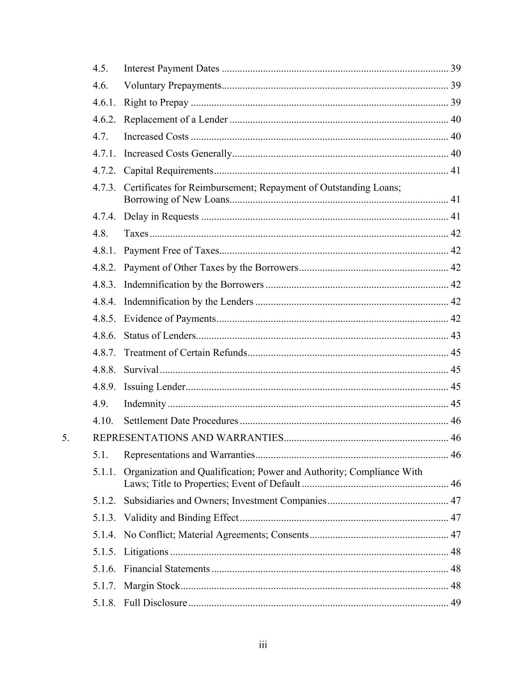iii 4.5. Interest Payment Dates ........................................................................................ 39 4.6. Voluntary Prepayments ........................................................................................ 39 4.6.1. Right to Prepay .................................................................................................... 39 4.6.2. Replacement of a Lender ..................................................................................... 40 4.7. Increased Costs .................................................................................................... 40 4.7.1. Increased Costs Generally .................................................................................... 40 4.7.2. Capital Requirements ........................................................................................... 41 4.7.3. Certificates for Reimbursement; Repayment of Outstanding Loans; Borrowing of New Loans..................................................................................... 41 4.7.4. Delay in Requests ................................................................................................ 41 4.8. Taxes .................................................................................................................... 42 4.8.1. Payment Free of Taxes ......................................................................................... 42 4.8.2. Payment of Other Taxes by the Borrowers .......................................................... 42 4.8.3. Indemnification by the Borrowers ....................................................................... 42 4.8.4. Indemnification by the Lenders ........................................................................... 42 4.8.5. Evidence of Payments .......................................................................................... 42 4.8.6. Status of Lenders .................................................................................................. 43 4.8.7. Treatment of Certain Refunds .............................................................................. 45 4.8.8. Survival ................................................................................................................ 45 4.8.9. Issuing Lender ...................................................................................................... 45 4.9. Indemnity ............................................................................................................. 45 4.10. Settlement Date Procedures ................................................................................. 46 5. REPRESENTATIONS AND WARRANTIES ................................................................ 46 5.1. Representations and Warranties ........................................................................... 46 5.1.1. Organization and Qualification; Power and Authority; Compliance With Laws; Title to Properties; Event of Default ......................................................... 46 5.1.2. Subsidiaries and Owners; Investment Companies ............................................... 47 5.1.3. Validity and Binding Effect ................................................................................. 47 5.1.4. No Conflict; Material Agreements; Consents ...................................................... 47 5.1.5. Litigations ............................................................................................................ 48 5.1.6. Financial Statements ............................................................................................ 48 5.1.7. Margin Stock ........................................................................................................ 48 5.1.8. Full Disclosure ..................................................................................................... 49