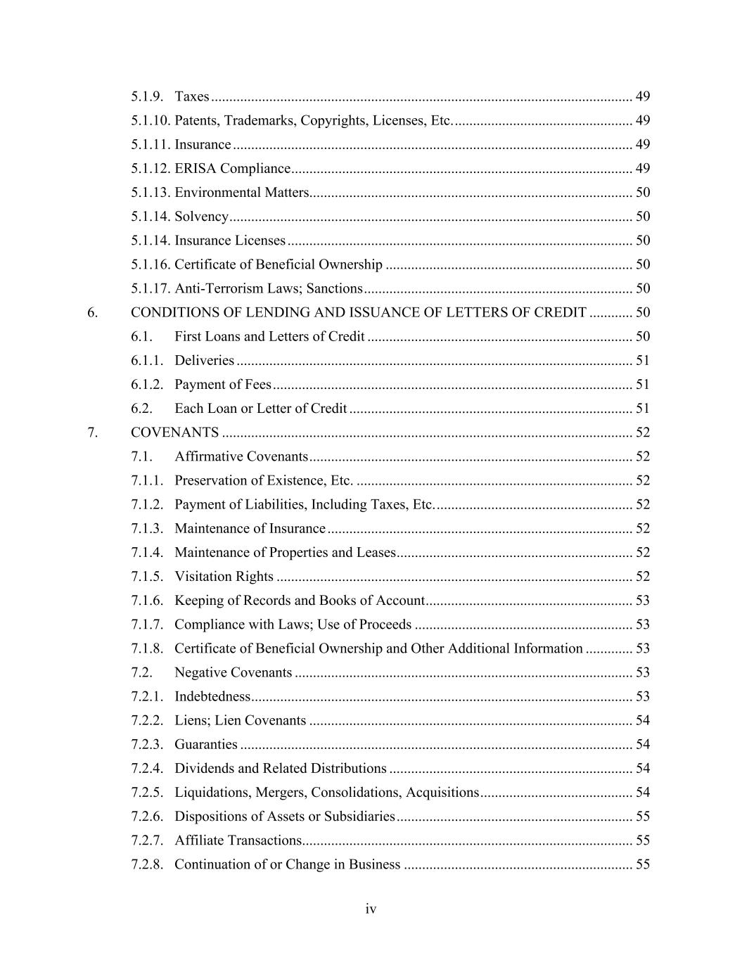 iv 5.1.9. Taxes .................................................................................................................... 49 5.1.10. Patents, Trademarks, Copyrights, Licenses, Etc. ................................................. 49 5.1.11. Insurance .............................................................................................................. 49 5.1.12. ERISA Compliance .............................................................................................. 49 5.1.13. Environmental Matters......................................................................................... 50 5.1.14. Solvency ............................................................................................................... 50 5.1.14. Insurance Licenses ............................................................................................... 50 5.1.16. Certificate of Beneficial Ownership .................................................................... 50 5.1.17. Anti-Terrorism Laws; Sanctions .......................................................................... 50 6. CONDITIONS OF LENDING AND ISSUANCE OF LETTERS OF CREDIT ............ 50 6.1. First Loans and Letters of Credit ......................................................................... 50 6.1.1. Deliveries ............................................................................................................. 51 6.1.2. Payment of Fees ................................................................................................... 51 6.2. Each Loan or Letter of Credit .............................................................................. 51 7. COVENANTS ................................................................................................................. 52 7.1. Affirmative Covenants ......................................................................................... 52 7.1.1. Preservation of Existence, Etc. ............................................................................ 52 7.1.2. Payment of Liabilities, Including Taxes, Etc. ...................................................... 52 7.1.3. Maintenance of Insurance .................................................................................... 52 7.1.4. Maintenance of Properties and Leases ................................................................. 52 7.1.5. Visitation Rights .................................................................................................. 52 7.1.6. Keeping of Records and Books of Account ......................................................... 53 7.1.7. Compliance with Laws; Use of Proceeds ............................................................ 53 7.1.8. Certificate of Beneficial Ownership and Other Additional Information ............. 53 7.2. Negative Covenants ............................................................................................. 53 7.2.1. Indebtedness ......................................................................................................... 53 7.2.2. Liens; Lien Covenants ......................................................................................... 54 7.2.3. Guaranties ............................................................................................................ 54 7.2.4. Dividends and Related Distributions ................................................................... 54 7.2.5. Liquidations, Mergers, Consolidations, Acquisitions .......................................... 54 7.2.6. Dispositions of Assets or Subsidiaries ................................................................. 55 7.2.7. Affiliate Transactions ........................................................................................... 55 7.2.8. Continuation of or Change in Business ............................................................... 55