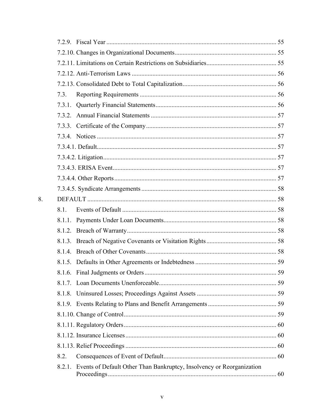 v 7.2.9. Fiscal Year ........................................................................................................... 55 7.2.10. Changes in Organizational Documents ................................................................ 55 7.2.11. Limitations on Certain Restrictions on Subsidiaries ............................................ 55 7.2.12. Anti-Terrorism Laws ........................................................................................... 56 7.2.13. Consolidated Debt to Total Capitalization ........................................................... 56 7.3. Reporting Requirements ...................................................................................... 56 7.3.1. Quarterly Financial Statements ............................................................................ 56 7.3.2. Annual Financial Statements ............................................................................... 57 7.3.3. Certificate of the Company .................................................................................. 57 7.3.4. Notices ................................................................................................................. 57 7.3.4.1. Default................................................................................................................. 57 7.3.4.2. Litigation ............................................................................................................. 57 7.3.4.3. ERISA Event ....................................................................................................... 57 7.3.4.4. Other Reports ...................................................................................................... 57 7.3.4.5. Syndicate Arrangements ..................................................................................... 58 8. DEFAULT ....................................................................................................................... 58 8.1. Events of Default ................................................................................................. 58 8.1.1. Payments Under Loan Documents ....................................................................... 58 8.1.2. Breach of Warranty .............................................................................................. 58 8.1.3. Breach of Negative Covenants or Visitation Rights ............................................ 58 8.1.4. Breach of Other Covenants .................................................................................. 58 8.1.5. Defaults in Other Agreements or Indebtedness ................................................... 59 8.1.6. Final Judgments or Orders ................................................................................... 59 8.1.7. Loan Documents Unenforceable .......................................................................... 59 8.1.8. Uninsured Losses; Proceedings Against Assets .................................................. 59 8.1.9. Events Relating to Plans and Benefit Arrangements ........................................... 59 8.1.10. Change of Control ................................................................................................ 59 8.1.11. Regulatory Orders ................................................................................................ 60 8.1.12. Insurance Licenses ............................................................................................... 60 8.1.13. Relief Proceedings ............................................................................................... 60 8.2. Consequences of Event of Default ....................................................................... 60 8.2.1. Events of Default Other Than Bankruptcy, Insolvency or Reorganization Proceedings .......................................................................................................... 60