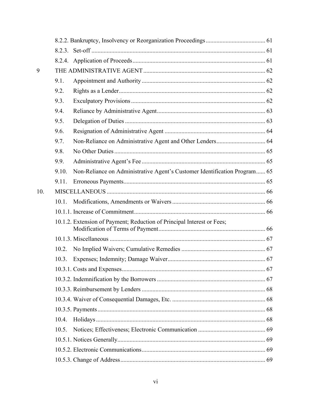 vi 8.2.2. Bankruptcy, Insolvency or Reorganization Proceedings ....................................... 61 8.2.3. Set-off .................................................................................................................. 61 8.2.4. Application of Proceeds ....................................................................................... 61 9 THE ADMINISTRATIVE AGENT ................................................................................ 62 9.1. Appointment and Authority ................................................................................. 62 9.2. Rights as a Lender ................................................................................................ 62 9.3. Exculpatory Provisions ........................................................................................ 62 9.4. Reliance by Administrative Agent ....................................................................... 63 9.5. Delegation of Duties ............................................................................................ 63 9.6. Resignation of Administrative Agent .................................................................. 64 9.7. Non-Reliance on Administrative Agent and Other Lenders ................................ 64 9.8. No Other Duties ................................................................................................... 65 9.9. Administrative Agent’s Fee ................................................................................. 65 9.10. Non-Reliance on Administrative Agent’s Customer Identification Program ...... 65 9.11. Erroneous Payments ............................................................................................. 65 10. MISCELLANEOUS ........................................................................................................ 66 10.1. Modifications, Amendments or Waivers ............................................................. 66 10.1.1. Increase of Commitment ...................................................................................... 66 10.1.2. Extension of Payment; Reduction of Principal Interest or Fees; Modification of Terms of Payment ...................................................................... 66 10.1.3. Miscellaneous ...................................................................................................... 67 10.2. No Implied Waivers; Cumulative Remedies ....................................................... 67 10.3. Expenses; Indemnity; Damage Waiver ................................................................ 67 10.3.1. Costs and Expenses .............................................................................................. 67 10.3.2. Indemnification by the Borrowers ....................................................................... 67 10.3.3. Reimbursement by Lenders ................................................................................. 68 10.3.4. Waiver of Consequential Damages, Etc. ............................................................. 68 10.3.5. Payments .............................................................................................................. 68 10.4. Holidays ............................................................................................................... 68 10.5. Notices; Effectiveness; Electronic Communication ............................................ 69 10.5.1. Notices Generally ................................................................................................. 69 10.5.2. Electronic Communications ................................................................................. 69 10.5.3. Change of Address ............................................................................................... 69