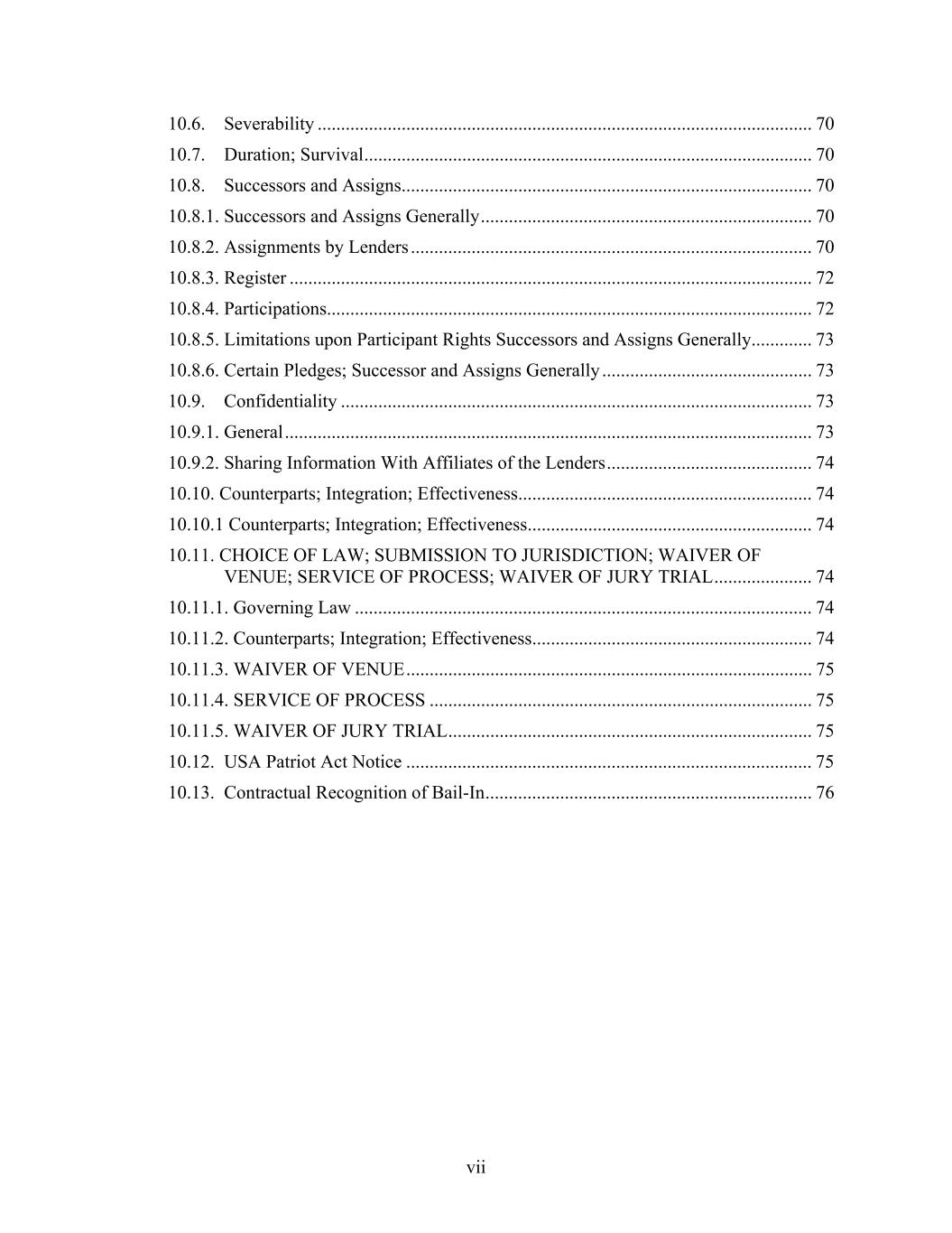 vii 10.6. Severability .......................................................................................................... 70 10.7. Duration; Survival ................................................................................................ 70 10.8. Successors and Assigns ........................................................................................ 70 10.8.1. Successors and Assigns Generally ....................................................................... 70 10.8.2. Assignments by Lenders ...................................................................................... 70 10.8.3. Register ................................................................................................................ 72 10.8.4. Participations........................................................................................................ 72 10.8.5. Limitations upon Participant Rights Successors and Assigns Generally ............. 73 10.8.6. Certain Pledges; Successor and Assigns Generally ............................................. 73 10.9. Confidentiality ..................................................................................................... 73 10.9.1. General ................................................................................................................. 73 10.9.2. Sharing Information With Affiliates of the Lenders ............................................ 74 10.10. Counterparts; Integration; Effectiveness ............................................................... 74 10.10.1 Counterparts; Integration; Effectiveness ............................................................. 74 10.11. CHOICE OF LAW; SUBMISSION TO JURISDICTION; WAIVER OF VENUE; SERVICE OF PROCESS; WAIVER OF JURY TRIAL ..................... 74 10.11.1. Governing Law .................................................................................................. 74 10.11.2. Counterparts; Integration; Effectiveness ............................................................ 74 10.11.3. WAIVER OF VENUE ....................................................................................... 75 10.11.4. SERVICE OF PROCESS .................................................................................. 75 10.11.5. WAIVER OF JURY TRIAL .............................................................................. 75 10.12. USA Patriot Act Notice ....................................................................................... 75 10.13. Contractual Recognition of Bail-In ...................................................................... 76