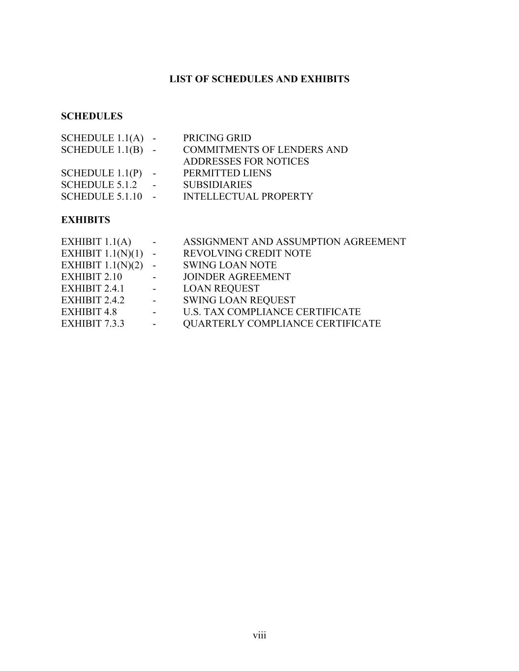 viii LIST OF SCHEDULES AND EXHIBITS SCHEDULES SCHEDULE 1.1(A) - PRICING GRID SCHEDULE 1.1(B) - COMMITMENTS OF LENDERS AND ADDRESSES FOR NOTICES SCHEDULE 1.1(P) - PERMITTED LIENS SCHEDULE 5.1.2 - SUBSIDIARIES SCHEDULE 5.1.10 - INTELLECTUAL PROPERTY EXHIBITS EXHIBIT 1.1(A) - ASSIGNMENT AND ASSUMPTION AGREEMENT EXHIBIT 1.1(N)(1) - REVOLVING CREDIT NOTE EXHIBIT 1.1(N)(2) - SWING LOAN NOTE EXHIBIT 2.10 - JOINDER AGREEMENT EXHIBIT 2.4.1 - LOAN REQUEST EXHIBIT 2.4.2 - SWING LOAN REQUEST EXHIBIT 4.8 - U.S. TAX COMPLIANCE CERTIFICATE EXHIBIT 7.3.3 - QUARTERLY COMPLIANCE CERTIFICATE