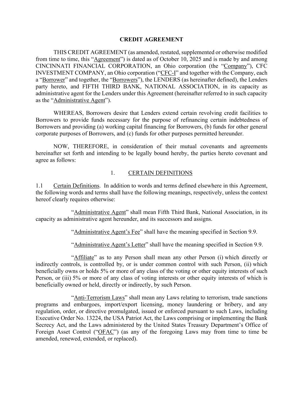 CREDIT AGREEMENT THIS CREDIT AGREEMENT (as amended, restated, supplemented or otherwise modified from time to time, this “Agreement”) is dated as of October 10, 2025 and is made by and among CINCINNATI FINANCIAL CORPORATION, an Ohio corporation (the “Company”), CFC INVESTMENT COMPANY, an Ohio corporation (“CFC-I” and together with the Company, each a “Borrower” and together, the “Borrowers”), the LENDERS (as hereinafter defined), the Lenders party hereto, and FIFTH THIRD BANK, NATIONAL ASSOCIATION, in its capacity as administrative agent for the Lenders under this Agreement (hereinafter referred to in such capacity as the “Administrative Agent”). WHEREAS, Borrowers desire that Lenders extend certain revolving credit facilities to Borrowers to provide funds necessary for the purpose of refinancing certain indebtedness of Borrowers and providing (a) working capital financing for Borrowers, (b) funds for other general corporate purposes of Borrowers, and (c) funds for other purposes permitted hereunder. NOW, THEREFORE, in consideration of their mutual covenants and agreements hereinafter set forth and intending to be legally bound hereby, the parties hereto covenant and agree as follows: 1. CERTAIN DEFINITIONS 1.1 Certain Definitions. In addition to words and terms defined elsewhere in this Agreement, the following words and terms shall have the following meanings, respectively, unless the context hereof clearly requires otherwise: “Administrative Agent” shall mean Fifth Third Bank, National Association, in its capacity as administrative agent hereunder, and its successors and assigns. “Administrative Agent’s Fee” shall have the meaning specified in Section 9.9. “Administrative Agent’s Letter” shall have the meaning specified in Section 9.9. “Affiliate” as to any Person shall mean any other Person (i) which directly or indirectly controls, is controlled by, or is under common control with such Person, (ii) which beneficially owns or holds 5% or more of any class of the voting or other equity interests of such Person, or (iii) 5% or more of any class of voting interests or other equity interests of which is beneficially owned or held, directly or indirectly, by such Person. “Anti-Terrorism Laws” shall mean any Laws relating to terrorism, trade sanctions programs and embargoes, import/export licensing, money laundering or bribery, and any regulation, order, or directive promulgated, issued or enforced pursuant to such Laws, including Executive Order No. 13224, the USA Patriot Act, the Laws comprising or implementing the Bank Secrecy Act, and the Laws administered by the United States Treasury Department’s Office of Foreign Asset Control (“OFAC”) (as any of the foregoing Laws may from time to time be amended, renewed, extended, or replaced).