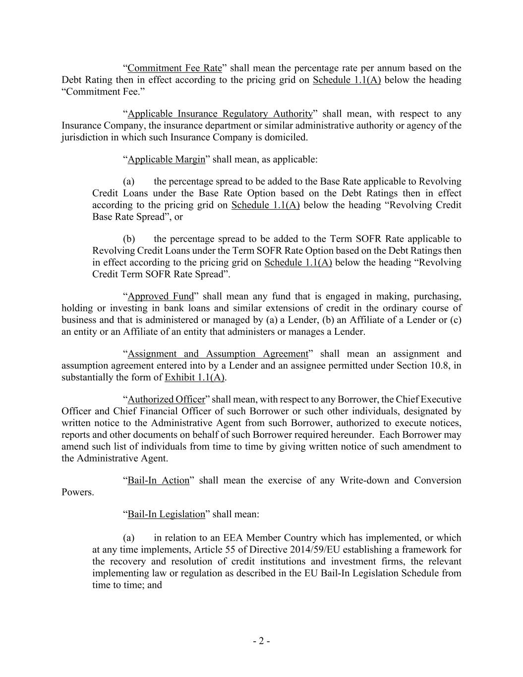 - 2 - “Commitment Fee Rate” shall mean the percentage rate per annum based on the Debt Rating then in effect according to the pricing grid on Schedule 1.1(A) below the heading “Commitment Fee.” “Applicable Insurance Regulatory Authority” shall mean, with respect to any Insurance Company, the insurance department or similar administrative authority or agency of the jurisdiction in which such Insurance Company is domiciled. “Applicable Margin” shall mean, as applicable: (a) the percentage spread to be added to the Base Rate applicable to Revolving Credit Loans under the Base Rate Option based on the Debt Ratings then in effect according to the pricing grid on Schedule 1.1(A) below the heading “Revolving Credit Base Rate Spread”, or (b) the percentage spread to be added to the Term SOFR Rate applicable to Revolving Credit Loans under the Term SOFR Rate Option based on the Debt Ratings then in effect according to the pricing grid on Schedule 1.1(A) below the heading “Revolving Credit Term SOFR Rate Spread”. “Approved Fund” shall mean any fund that is engaged in making, purchasing, holding or investing in bank loans and similar extensions of credit in the ordinary course of business and that is administered or managed by (a) a Lender, (b) an Affiliate of a Lender or (c) an entity or an Affiliate of an entity that administers or manages a Lender. “Assignment and Assumption Agreement” shall mean an assignment and assumption agreement entered into by a Lender and an assignee permitted under Section 10.8, in substantially the form of Exhibit 1.1(A). “Authorized Officer” shall mean, with respect to any Borrower, the Chief Executive Officer and Chief Financial Officer of such Borrower or such other individuals, designated by written notice to the Administrative Agent from such Borrower, authorized to execute notices, reports and other documents on behalf of such Borrower required hereunder. Each Borrower may amend such list of individuals from time to time by giving written notice of such amendment to the Administrative Agent. “Bail-In Action” shall mean the exercise of any Write-down and Conversion Powers. “Bail-In Legislation” shall mean: (a) in relation to an EEA Member Country which has implemented, or which at any time implements, Article 55 of Directive 2014/59/EU establishing a framework for the recovery and resolution of credit institutions and investment firms, the relevant implementing law or regulation as described in the EU Bail-In Legislation Schedule from time to time; and