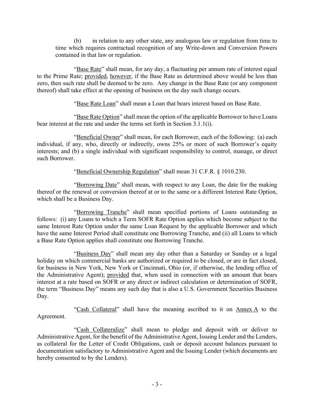 - 3 - (b) in relation to any other state, any analogous law or regulation from time to time which requires contractual recognition of any Write-down and Conversion Powers contained in that law or regulation. “Base Rate” shall mean, for any day, a fluctuating per annum rate of interest equal to the Prime Rate; provided, however, if the Base Rate as determined above would be less than zero, then such rate shall be deemed to be zero. Any change in the Base Rate (or any component thereof) shall take effect at the opening of business on the day such change occurs. “Base Rate Loan” shall mean a Loan that bears interest based on Base Rate. “Base Rate Option” shall mean the option of the applicable Borrower to have Loans bear interest at the rate and under the terms set forth in Section 3.1.1(i). “Beneficial Owner” shall mean, for each Borrower, each of the following: (a) each individual, if any, who, directly or indirectly, owns 25% or more of such Borrower’s equity interests; and (b) a single individual with significant responsibility to control, manage, or direct such Borrower. “Beneficial Ownership Regulation” shall mean 31 C.F.R. § 1010.230. “Borrowing Date” shall mean, with respect to any Loan, the date for the making thereof or the renewal or conversion thereof at or to the same or a different Interest Rate Option, which shall be a Business Day. “Borrowing Tranche” shall mean specified portions of Loans outstanding as follows: (i) any Loans to which a Term SOFR Rate Option applies which become subject to the same Interest Rate Option under the same Loan Request by the applicable Borrower and which have the same Interest Period shall constitute one Borrowing Tranche, and (ii) all Loans to which a Base Rate Option applies shall constitute one Borrowing Tranche. “Business Day” shall mean any day other than a Saturday or Sunday or a legal holiday on which commercial banks are authorized or required to be closed, or are in fact closed, for business in New York, New York or Cincinnati, Ohio (or, if otherwise, the lending office of the Administrative Agent); provided that, when used in connection with an amount that bears interest at a rate based on SOFR or any direct or indirect calculation or determination of SOFR, the term “Business Day” means any such day that is also a U.S. Government Securities Business Day. “Cash Collateral” shall have the meaning ascribed to it on Annex A to the Agreement. “Cash Collateralize” shall mean to pledge and deposit with or deliver to Administrative Agent, for the benefit of the Administrative Agent, Issuing Lender and the Lenders, as collateral for the Letter of Credit Obligations, cash or deposit account balances pursuant to documentation satisfactory to Administrative Agent and the Issuing Lender (which documents are hereby consented to by the Lenders).