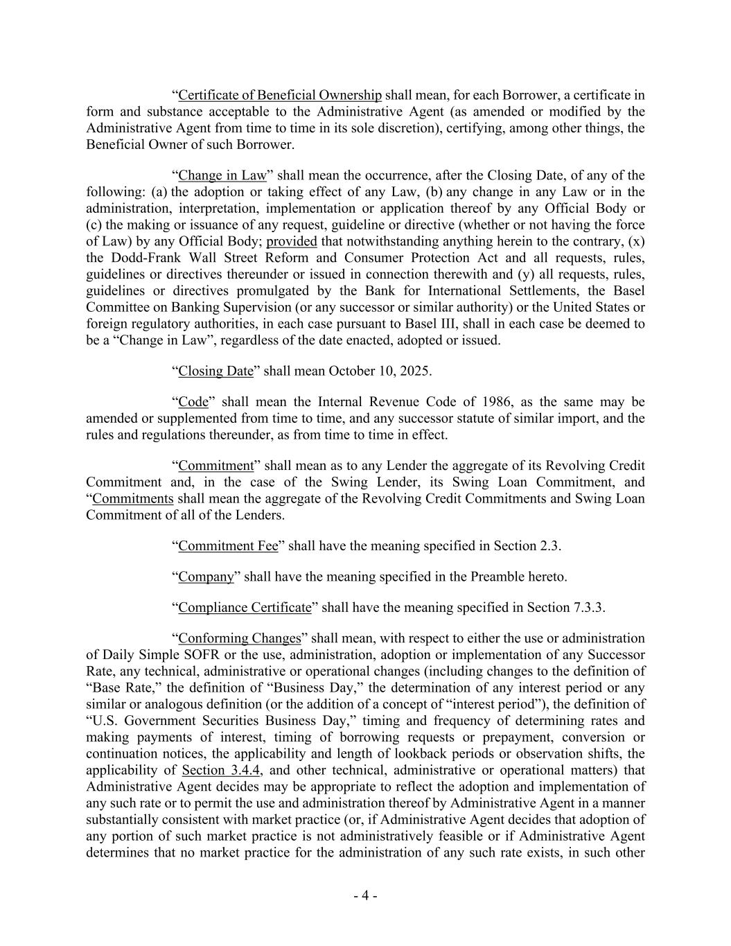 - 4 - “Certificate of Beneficial Ownership shall mean, for each Borrower, a certificate in form and substance acceptable to the Administrative Agent (as amended or modified by the Administrative Agent from time to time in its sole discretion), certifying, among other things, the Beneficial Owner of such Borrower. “Change in Law” shall mean the occurrence, after the Closing Date, of any of the following: (a) the adoption or taking effect of any Law, (b) any change in any Law or in the administration, interpretation, implementation or application thereof by any Official Body or (c) the making or issuance of any request, guideline or directive (whether or not having the force of Law) by any Official Body; provided that notwithstanding anything herein to the contrary, (x) the Dodd-Frank Wall Street Reform and Consumer Protection Act and all requests, rules, guidelines or directives thereunder or issued in connection therewith and (y) all requests, rules, guidelines or directives promulgated by the Bank for International Settlements, the Basel Committee on Banking Supervision (or any successor or similar authority) or the United States or foreign regulatory authorities, in each case pursuant to Basel III, shall in each case be deemed to be a “Change in Law”, regardless of the date enacted, adopted or issued. “Closing Date” shall mean October 10, 2025. “Code” shall mean the Internal Revenue Code of 1986, as the same may be amended or supplemented from time to time, and any successor statute of similar import, and the rules and regulations thereunder, as from time to time in effect. “Commitment” shall mean as to any Lender the aggregate of its Revolving Credit Commitment and, in the case of the Swing Lender, its Swing Loan Commitment, and “Commitments shall mean the aggregate of the Revolving Credit Commitments and Swing Loan Commitment of all of the Lenders. “Commitment Fee” shall have the meaning specified in Section 2.3. “Company” shall have the meaning specified in the Preamble hereto. “Compliance Certificate” shall have the meaning specified in Section 7.3.3. “Conforming Changes” shall mean, with respect to either the use or administration of Daily Simple SOFR or the use, administration, adoption or implementation of any Successor Rate, any technical, administrative or operational changes (including changes to the definition of “Base Rate,” the definition of “Business Day,” the determination of any interest period or any similar or analogous definition (or the addition of a concept of “interest period”), the definition of “U.S. Government Securities Business Day,” timing and frequency of determining rates and making payments of interest, timing of borrowing requests or prepayment, conversion or continuation notices, the applicability and length of lookback periods or observation shifts, the applicability of Section 3.4.4, and other technical, administrative or operational matters) that Administrative Agent decides may be appropriate to reflect the adoption and implementation of any such rate or to permit the use and administration thereof by Administrative Agent in a manner substantially consistent with market practice (or, if Administrative Agent decides that adoption of any portion of such market practice is not administratively feasible or if Administrative Agent determines that no market practice for the administration of any such rate exists, in such other