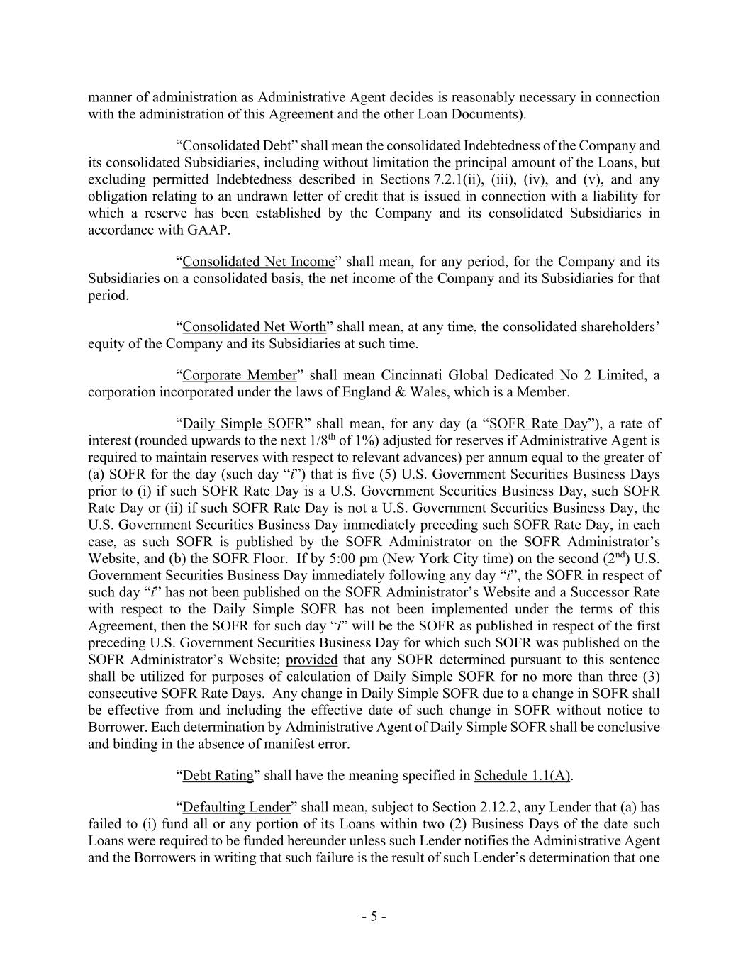 - 5 - manner of administration as Administrative Agent decides is reasonably necessary in connection with the administration of this Agreement and the other Loan Documents). “Consolidated Debt” shall mean the consolidated Indebtedness of the Company and its consolidated Subsidiaries, including without limitation the principal amount of the Loans, but excluding permitted Indebtedness described in Sections 7.2.1(ii), (iii), (iv), and (v), and any obligation relating to an undrawn letter of credit that is issued in connection with a liability for which a reserve has been established by the Company and its consolidated Subsidiaries in accordance with GAAP. “Consolidated Net Income” shall mean, for any period, for the Company and its Subsidiaries on a consolidated basis, the net income of the Company and its Subsidiaries for that period. “Consolidated Net Worth” shall mean, at any time, the consolidated shareholders’ equity of the Company and its Subsidiaries at such time. “Corporate Member” shall mean Cincinnati Global Dedicated No 2 Limited, a corporation incorporated under the laws of England & Wales, which is a Member. “Daily Simple SOFR” shall mean, for any day (a “SOFR Rate Day”), a rate of interest (rounded upwards to the next 1/8th of 1%) adjusted for reserves if Administrative Agent is required to maintain reserves with respect to relevant advances) per annum equal to the greater of (a) SOFR for the day (such day “i”) that is five (5) U.S. Government Securities Business Days prior to (i) if such SOFR Rate Day is a U.S. Government Securities Business Day, such SOFR Rate Day or (ii) if such SOFR Rate Day is not a U.S. Government Securities Business Day, the U.S. Government Securities Business Day immediately preceding such SOFR Rate Day, in each case, as such SOFR is published by the SOFR Administrator on the SOFR Administrator’s Website, and (b) the SOFR Floor. If by 5:00 pm (New York City time) on the second (2nd) U.S. Government Securities Business Day immediately following any day “i”, the SOFR in respect of such day “i” has not been published on the SOFR Administrator’s Website and a Successor Rate with respect to the Daily Simple SOFR has not been implemented under the terms of this Agreement, then the SOFR for such day “i” will be the SOFR as published in respect of the first preceding U.S. Government Securities Business Day for which such SOFR was published on the SOFR Administrator’s Website; provided that any SOFR determined pursuant to this sentence shall be utilized for purposes of calculation of Daily Simple SOFR for no more than three (3) consecutive SOFR Rate Days. Any change in Daily Simple SOFR due to a change in SOFR shall be effective from and including the effective date of such change in SOFR without notice to Borrower. Each determination by Administrative Agent of Daily Simple SOFR shall be conclusive and binding in the absence of manifest error. “Debt Rating” shall have the meaning specified in Schedule 1.1(A). “Defaulting Lender” shall mean, subject to Section 2.12.2, any Lender that (a) has failed to (i) fund all or any portion of its Loans within two (2) Business Days of the date such Loans were required to be funded hereunder unless such Lender notifies the Administrative Agent and the Borrowers in writing that such failure is the result of such Lender’s determination that one