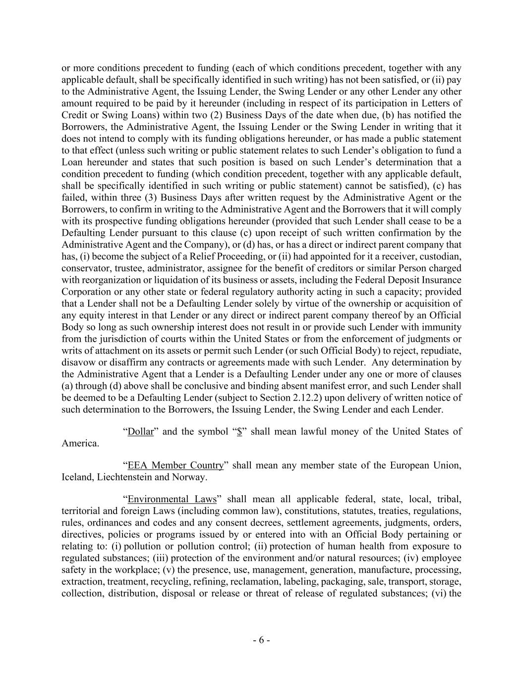 - 6 - or more conditions precedent to funding (each of which conditions precedent, together with any applicable default, shall be specifically identified in such writing) has not been satisfied, or (ii) pay to the Administrative Agent, the Issuing Lender, the Swing Lender or any other Lender any other amount required to be paid by it hereunder (including in respect of its participation in Letters of Credit or Swing Loans) within two (2) Business Days of the date when due, (b) has notified the Borrowers, the Administrative Agent, the Issuing Lender or the Swing Lender in writing that it does not intend to comply with its funding obligations hereunder, or has made a public statement to that effect (unless such writing or public statement relates to such Lender’s obligation to fund a Loan hereunder and states that such position is based on such Lender’s determination that a condition precedent to funding (which condition precedent, together with any applicable default, shall be specifically identified in such writing or public statement) cannot be satisfied), (c) has failed, within three (3) Business Days after written request by the Administrative Agent or the Borrowers, to confirm in writing to the Administrative Agent and the Borrowers that it will comply with its prospective funding obligations hereunder (provided that such Lender shall cease to be a Defaulting Lender pursuant to this clause (c) upon receipt of such written confirmation by the Administrative Agent and the Company), or (d) has, or has a direct or indirect parent company that has, (i) become the subject of a Relief Proceeding, or (ii) had appointed for it a receiver, custodian, conservator, trustee, administrator, assignee for the benefit of creditors or similar Person charged with reorganization or liquidation of its business or assets, including the Federal Deposit Insurance Corporation or any other state or federal regulatory authority acting in such a capacity; provided that a Lender shall not be a Defaulting Lender solely by virtue of the ownership or acquisition of any equity interest in that Lender or any direct or indirect parent company thereof by an Official Body so long as such ownership interest does not result in or provide such Lender with immunity from the jurisdiction of courts within the United States or from the enforcement of judgments or writs of attachment on its assets or permit such Lender (or such Official Body) to reject, repudiate, disavow or disaffirm any contracts or agreements made with such Lender. Any determination by the Administrative Agent that a Lender is a Defaulting Lender under any one or more of clauses (a) through (d) above shall be conclusive and binding absent manifest error, and such Lender shall be deemed to be a Defaulting Lender (subject to Section 2.12.2) upon delivery of written notice of such determination to the Borrowers, the Issuing Lender, the Swing Lender and each Lender. “Dollar” and the symbol “$” shall mean lawful money of the United States of America. “EEA Member Country” shall mean any member state of the European Union, Iceland, Liechtenstein and Norway. “Environmental Laws” shall mean all applicable federal, state, local, tribal, territorial and foreign Laws (including common law), constitutions, statutes, treaties, regulations, rules, ordinances and codes and any consent decrees, settlement agreements, judgments, orders, directives, policies or programs issued by or entered into with an Official Body pertaining or relating to: (i) pollution or pollution control; (ii) protection of human health from exposure to regulated substances; (iii) protection of the environment and/or natural resources; (iv) employee safety in the workplace; (v) the presence, use, management, generation, manufacture, processing, extraction, treatment, recycling, refining, reclamation, labeling, packaging, sale, transport, storage, collection, distribution, disposal or release or threat of release of regulated substances; (vi) the