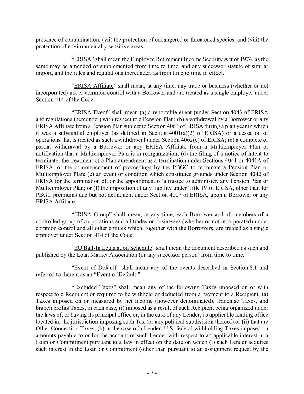 - 7 - presence of contamination; (vii) the protection of endangered or threatened species; and (viii) the protection of environmentally sensitive areas. “ERISA” shall mean the Employee Retirement Income Security Act of 1974, as the same may be amended or supplemented from time to time, and any successor statute of similar import, and the rules and regulations thereunder, as from time to time in effect. “ERISA Affiliate” shall mean, at any time, any trade or business (whether or not incorporated) under common control with a Borrower and are treated as a single employer under Section 414 of the Code. “ERISA Event” shall mean (a) a reportable event (under Section 4043 of ERISA and regulations thereunder) with respect to a Pension Plan; (b) a withdrawal by a Borrower or any ERISA Affiliate from a Pension Plan subject to Section 4063 of ERISA during a plan year in which it was a substantial employer (as defined in Section 4001(a)(2) of ERISA) or a cessation of operations that is treated as such a withdrawal under Section 4062(e) of ERISA; (c) a complete or partial withdrawal by a Borrower or any ERISA Affiliate from a Multiemployer Plan or notification that a Multiemployer Plan is in reorganization; (d) the filing of a notice of intent to terminate, the treatment of a Plan amendment as a termination under Sections 4041 or 4041A of ERISA, or the commencement of proceedings by the PBGC to terminate a Pension Plan or Multiemployer Plan; (e) an event or condition which constitutes grounds under Section 4042 of ERISA for the termination of, or the appointment of a trustee to administer, any Pension Plan or Multiemployer Plan; or (f) the imposition of any liability under Title IV of ERISA, other than for PBGC premiums due but not delinquent under Section 4007 of ERISA, upon a Borrower or any ERISA Affiliate. “ERISA Group” shall mean, at any time, each Borrower and all members of a controlled group of corporations and all trades or businesses (whether or not incorporated) under common control and all other entities which, together with the Borrowers, are treated as a single employer under Section 414 of the Code. “EU Bail-In Legislation Schedule” shall mean the document described as such and published by the Loan Market Association (or any successor person) from time to time. “Event of Default” shall mean any of the events described in Section 8.1 and referred to therein as an “Event of Default.” “Excluded Taxes” shall mean any of the following Taxes imposed on or with respect to a Recipient or required to be withheld or deducted from a payment to a Recipient, (a) Taxes imposed on or measured by net income (however denominated), franchise Taxes, and branch profits Taxes, in each case, (i) imposed as a result of such Recipient being organized under the laws of, or having its principal office or, in the case of any Lender, its applicable lending office located in, the jurisdiction imposing such Tax (or any political subdivision thereof) or (ii) that are Other Connection Taxes, (b) in the case of a Lender, U.S. federal withholding Taxes imposed on amounts payable to or for the account of such Lender with respect to an applicable interest in a Loan or Commitment pursuant to a law in effect on the date on which (i) such Lender acquires such interest in the Loan or Commitment (other than pursuant to an assignment request by the
