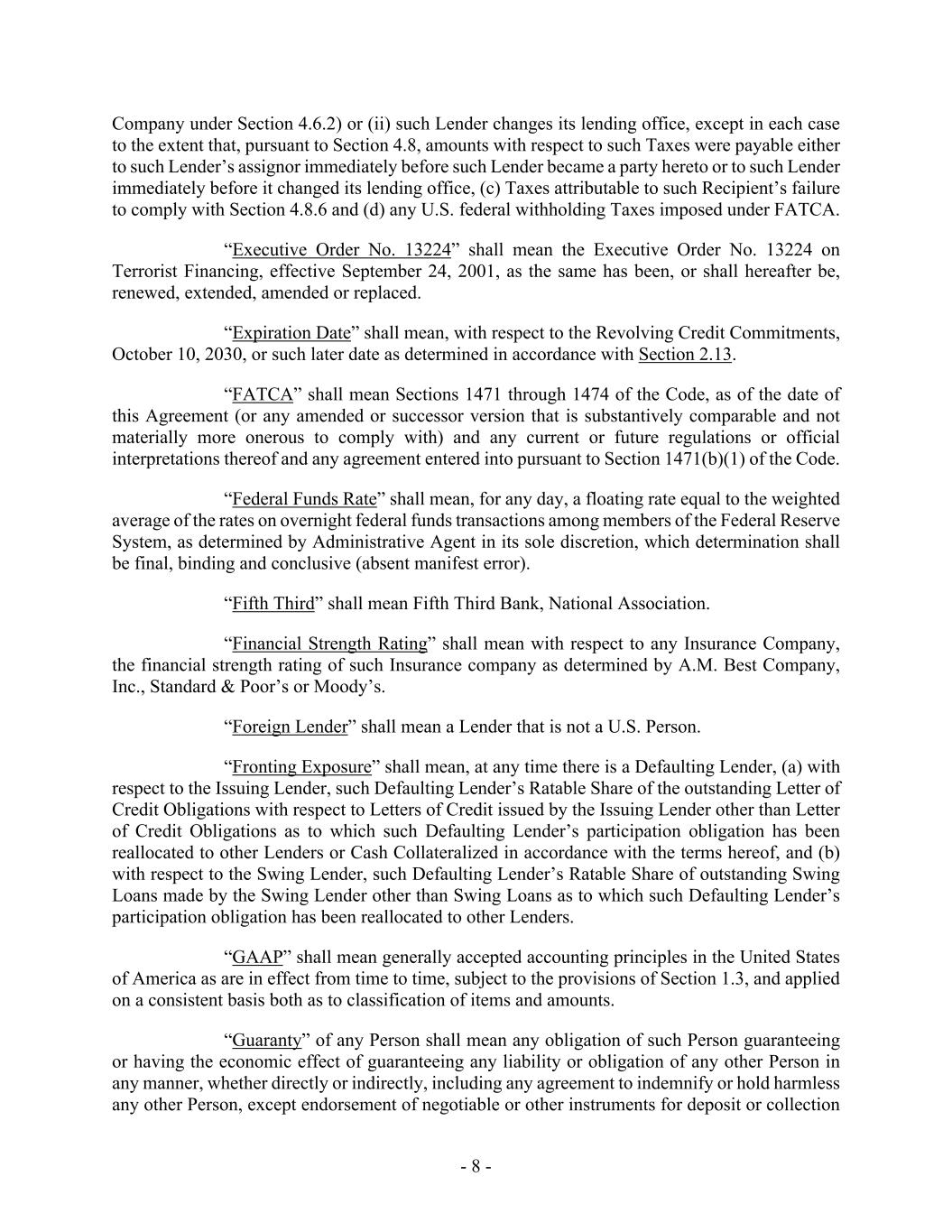 - 8 - Company under Section 4.6.2) or (ii) such Lender changes its lending office, except in each case to the extent that, pursuant to Section 4.8, amounts with respect to such Taxes were payable either to such Lender’s assignor immediately before such Lender became a party hereto or to such Lender immediately before it changed its lending office, (c) Taxes attributable to such Recipient’s failure to comply with Section 4.8.6 and (d) any U.S. federal withholding Taxes imposed under FATCA. “Executive Order No. 13224” shall mean the Executive Order No. 13224 on Terrorist Financing, effective September 24, 2001, as the same has been, or shall hereafter be, renewed, extended, amended or replaced. “Expiration Date” shall mean, with respect to the Revolving Credit Commitments, October 10, 2030, or such later date as determined in accordance with Section 2.13. “FATCA” shall mean Sections 1471 through 1474 of the Code, as of the date of this Agreement (or any amended or successor version that is substantively comparable and not materially more onerous to comply with) and any current or future regulations or official interpretations thereof and any agreement entered into pursuant to Section 1471(b)(1) of the Code. “Federal Funds Rate” shall mean, for any day, a floating rate equal to the weighted average of the rates on overnight federal funds transactions among members of the Federal Reserve System, as determined by Administrative Agent in its sole discretion, which determination shall be final, binding and conclusive (absent manifest error). “Fifth Third” shall mean Fifth Third Bank, National Association. “Financial Strength Rating” shall mean with respect to any Insurance Company, the financial strength rating of such Insurance company as determined by A.M. Best Company, Inc., Standard & Poor’s or Moody’s. “Foreign Lender” shall mean a Lender that is not a U.S. Person. “Fronting Exposure” shall mean, at any time there is a Defaulting Lender, (a) with respect to the Issuing Lender, such Defaulting Lender’s Ratable Share of the outstanding Letter of Credit Obligations with respect to Letters of Credit issued by the Issuing Lender other than Letter of Credit Obligations as to which such Defaulting Lender’s participation obligation has been reallocated to other Lenders or Cash Collateralized in accordance with the terms hereof, and (b) with respect to the Swing Lender, such Defaulting Lender’s Ratable Share of outstanding Swing Loans made by the Swing Lender other than Swing Loans as to which such Defaulting Lender’s participation obligation has been reallocated to other Lenders. “GAAP” shall mean generally accepted accounting principles in the United States of America as are in effect from time to time, subject to the provisions of Section 1.3, and applied on a consistent basis both as to classification of items and amounts. “Guaranty” of any Person shall mean any obligation of such Person guaranteeing or having the economic effect of guaranteeing any liability or obligation of any other Person in any manner, whether directly or indirectly, including any agreement to indemnify or hold harmless any other Person, except endorsement of negotiable or other instruments for deposit or collection