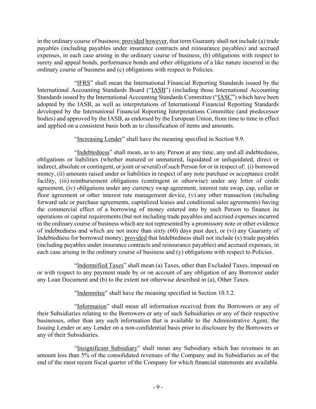 - 9 - in the ordinary course of business; provided however, that term Guaranty shall not include (a) trade payables (including payables under insurance contracts and reinsurance payables) and accrued expenses, in each case arising in the ordinary course of business, (b) obligations with respect to surety and appeal bonds, performance bonds and other obligations of a like nature incurred in the ordinary course of business and (c) obligations with respect to Policies. “IFRS” shall mean the International Financial Reporting Standards issued by the International Accounting Standards Board (“IASB”) (including those International Accounting Standards issued by the International Accounting Standards Committee (“IASC”) which have been adopted by the IASB, as well as interpretations of International Financial Reporting Standards developed by the International Financial Reporting Interpretations Committee (and predecessor bodies) and approved by the IASB, as endorsed by the European Union, from time to time in effect and applied on a consistent basis both as to classification of items and amounts. “Increasing Lender” shall have the meaning specified in Section 9.9. “Indebtedness” shall mean, as to any Person at any time, any and all indebtedness, obligations or liabilities (whether matured or unmatured, liquidated or unliquidated, direct or indirect, absolute or contingent, or joint or several) of such Person for or in respect of: (i) borrowed money, (ii) amounts raised under or liabilities in respect of any note purchase or acceptance credit facility, (iii) reimbursement obligations (contingent or otherwise) under any letter of credit agreement, (iv) obligations under any currency swap agreement, interest rate swap, cap, collar or floor agreement or other interest rate management device, (v) any other transaction (including forward sale or purchase agreements, capitalized leases and conditional sales agreements) having the commercial effect of a borrowing of money entered into by such Person to finance its operations or capital requirements (but not including trade payables and accrued expenses incurred in the ordinary course of business which are not represented by a promissory note or other evidence of indebtedness and which are not more than sixty (60) days past due), or (vi) any Guaranty of Indebtedness for borrowed money; provided that Indebtedness shall not include (x) trade payables (including payables under insurance contracts and reinsurance payables) and accrued expenses, in each case arising in the ordinary course of business and (y) obligations with respect to Policies. “Indemnified Taxes” shall mean (a) Taxes, other than Excluded Taxes, imposed on or with respect to any payment made by or on account of any obligation of any Borrower under any Loan Document and (b) to the extent not otherwise described in (a), Other Taxes. “Indemnitee” shall have the meaning specified in Section 10.3.2. “Information” shall mean all information received from the Borrowers or any of their Subsidiaries relating to the Borrowers or any of such Subsidiaries or any of their respective businesses, other than any such information that is available to the Administrative Agent, the Issuing Lender or any Lender on a non-confidential basis prior to disclosure by the Borrowers or any of their Subsidiaries. “Insignificant Subsidiary” shall mean any Subsidiary which has revenues in an amount less than 5% of the consolidated revenues of the Company and its Subsidiaries as of the end of the most recent fiscal quarter of the Company for which financial statements are available.