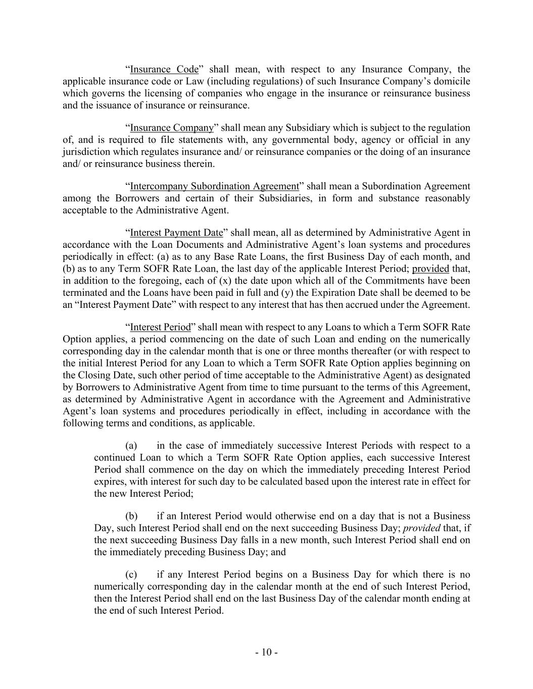 - 10 - “Insurance Code” shall mean, with respect to any Insurance Company, the applicable insurance code or Law (including regulations) of such Insurance Company’s domicile which governs the licensing of companies who engage in the insurance or reinsurance business and the issuance of insurance or reinsurance. “Insurance Company” shall mean any Subsidiary which is subject to the regulation of, and is required to file statements with, any governmental body, agency or official in any jurisdiction which regulates insurance and/ or reinsurance companies or the doing of an insurance and/ or reinsurance business therein. “Intercompany Subordination Agreement” shall mean a Subordination Agreement among the Borrowers and certain of their Subsidiaries, in form and substance reasonably acceptable to the Administrative Agent. “Interest Payment Date” shall mean, all as determined by Administrative Agent in accordance with the Loan Documents and Administrative Agent’s loan systems and procedures periodically in effect: (a) as to any Base Rate Loans, the first Business Day of each month, and (b) as to any Term SOFR Rate Loan, the last day of the applicable Interest Period; provided that, in addition to the foregoing, each of (x) the date upon which all of the Commitments have been terminated and the Loans have been paid in full and (y) the Expiration Date shall be deemed to be an “Interest Payment Date” with respect to any interest that has then accrued under the Agreement. “Interest Period” shall mean with respect to any Loans to which a Term SOFR Rate Option applies, a period commencing on the date of such Loan and ending on the numerically corresponding day in the calendar month that is one or three months thereafter (or with respect to the initial Interest Period for any Loan to which a Term SOFR Rate Option applies beginning on the Closing Date, such other period of time acceptable to the Administrative Agent) as designated by Borrowers to Administrative Agent from time to time pursuant to the terms of this Agreement, as determined by Administrative Agent in accordance with the Agreement and Administrative Agent’s loan systems and procedures periodically in effect, including in accordance with the following terms and conditions, as applicable. (a) in the case of immediately successive Interest Periods with respect to a continued Loan to which a Term SOFR Rate Option applies, each successive Interest Period shall commence on the day on which the immediately preceding Interest Period expires, with interest for such day to be calculated based upon the interest rate in effect for the new Interest Period; (b) if an Interest Period would otherwise end on a day that is not a Business Day, such Interest Period shall end on the next succeeding Business Day; provided that, if the next succeeding Business Day falls in a new month, such Interest Period shall end on the immediately preceding Business Day; and (c) if any Interest Period begins on a Business Day for which there is no numerically corresponding day in the calendar month at the end of such Interest Period, then the Interest Period shall end on the last Business Day of the calendar month ending at the end of such Interest Period.