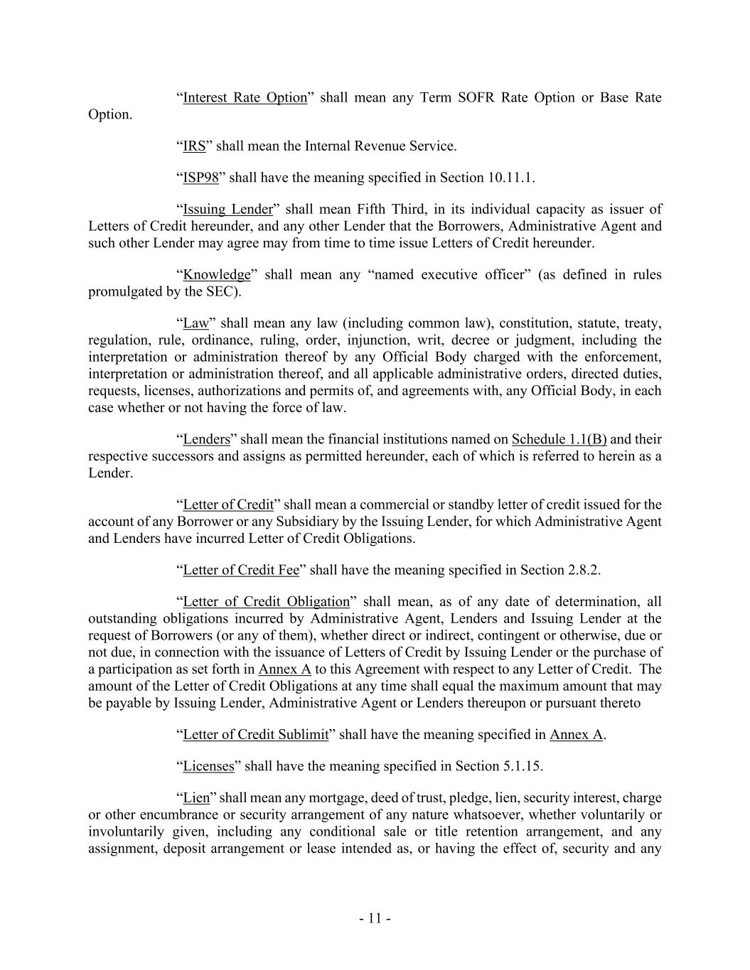 - 11 - “Interest Rate Option” shall mean any Term SOFR Rate Option or Base Rate Option. “IRS” shall mean the Internal Revenue Service. “ISP98” shall have the meaning specified in Section 10.11.1. “Issuing Lender” shall mean Fifth Third, in its individual capacity as issuer of Letters of Credit hereunder, and any other Lender that the Borrowers, Administrative Agent and such other Lender may agree may from time to time issue Letters of Credit hereunder. “Knowledge” shall mean any “named executive officer” (as defined in rules promulgated by the SEC). “Law” shall mean any law (including common law), constitution, statute, treaty, regulation, rule, ordinance, ruling, order, injunction, writ, decree or judgment, including the interpretation or administration thereof by any Official Body charged with the enforcement, interpretation or administration thereof, and all applicable administrative orders, directed duties, requests, licenses, authorizations and permits of, and agreements with, any Official Body, in each case whether or not having the force of law. “Lenders” shall mean the financial institutions named on Schedule 1.1(B) and their respective successors and assigns as permitted hereunder, each of which is referred to herein as a Lender. “Letter of Credit” shall mean a commercial or standby letter of credit issued for the account of any Borrower or any Subsidiary by the Issuing Lender, for which Administrative Agent and Lenders have incurred Letter of Credit Obligations. “Letter of Credit Fee” shall have the meaning specified in Section 2.8.2. “Letter of Credit Obligation” shall mean, as of any date of determination, all outstanding obligations incurred by Administrative Agent, Lenders and Issuing Lender at the request of Borrowers (or any of them), whether direct or indirect, contingent or otherwise, due or not due, in connection with the issuance of Letters of Credit by Issuing Lender or the purchase of a participation as set forth in Annex A to this Agreement with respect to any Letter of Credit. The amount of the Letter of Credit Obligations at any time shall equal the maximum amount that may be payable by Issuing Lender, Administrative Agent or Lenders thereupon or pursuant thereto “Letter of Credit Sublimit” shall have the meaning specified in Annex A. “Licenses” shall have the meaning specified in Section 5.1.15. “Lien” shall mean any mortgage, deed of trust, pledge, lien, security interest, charge or other encumbrance or security arrangement of any nature whatsoever, whether voluntarily or involuntarily given, including any conditional sale or title retention arrangement, and any assignment, deposit arrangement or lease intended as, or having the effect of, security and any