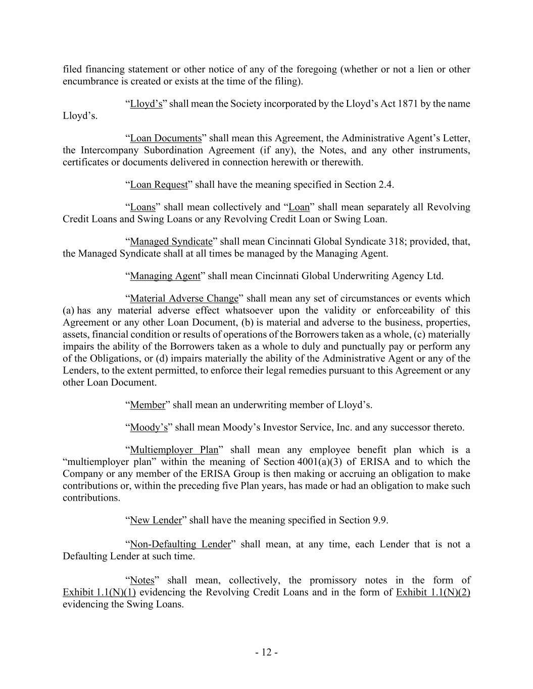 - 12 - filed financing statement or other notice of any of the foregoing (whether or not a lien or other encumbrance is created or exists at the time of the filing). “Lloyd’s” shall mean the Society incorporated by the Lloyd’s Act 1871 by the name Lloyd’s. “Loan Documents” shall mean this Agreement, the Administrative Agent’s Letter, the Intercompany Subordination Agreement (if any), the Notes, and any other instruments, certificates or documents delivered in connection herewith or therewith. “Loan Request” shall have the meaning specified in Section 2.4. “Loans” shall mean collectively and “Loan” shall mean separately all Revolving Credit Loans and Swing Loans or any Revolving Credit Loan or Swing Loan. “Managed Syndicate” shall mean Cincinnati Global Syndicate 318; provided, that, the Managed Syndicate shall at all times be managed by the Managing Agent. “Managing Agent” shall mean Cincinnati Global Underwriting Agency Ltd. “Material Adverse Change” shall mean any set of circumstances or events which (a) has any material adverse effect whatsoever upon the validity or enforceability of this Agreement or any other Loan Document, (b) is material and adverse to the business, properties, assets, financial condition or results of operations of the Borrowers taken as a whole, (c) materially impairs the ability of the Borrowers taken as a whole to duly and punctually pay or perform any of the Obligations, or (d) impairs materially the ability of the Administrative Agent or any of the Lenders, to the extent permitted, to enforce their legal remedies pursuant to this Agreement or any other Loan Document. “Member” shall mean an underwriting member of Lloyd’s. “Moody’s” shall mean Moody’s Investor Service, Inc. and any successor thereto. “Multiemployer Plan” shall mean any employee benefit plan which is a “multiemployer plan” within the meaning of Section 4001(a)(3) of ERISA and to which the Company or any member of the ERISA Group is then making or accruing an obligation to make contributions or, within the preceding five Plan years, has made or had an obligation to make such contributions. “New Lender” shall have the meaning specified in Section 9.9. “Non-Defaulting Lender” shall mean, at any time, each Lender that is not a Defaulting Lender at such time. “Notes” shall mean, collectively, the promissory notes in the form of Exhibit 1.1(N)(1) evidencing the Revolving Credit Loans and in the form of Exhibit 1.1(N)(2) evidencing the Swing Loans.