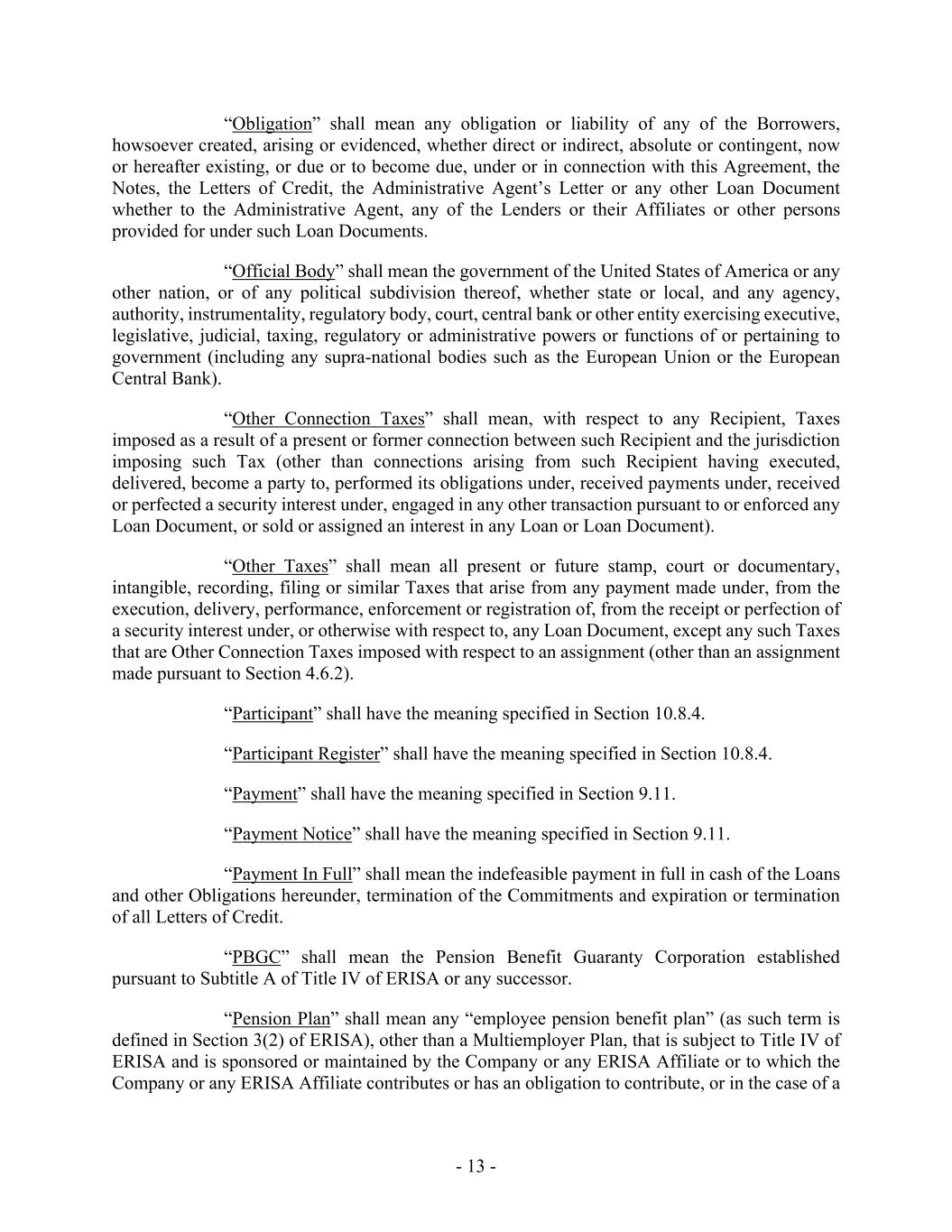 - 13 - “Obligation” shall mean any obligation or liability of any of the Borrowers, howsoever created, arising or evidenced, whether direct or indirect, absolute or contingent, now or hereafter existing, or due or to become due, under or in connection with this Agreement, the Notes, the Letters of Credit, the Administrative Agent’s Letter or any other Loan Document whether to the Administrative Agent, any of the Lenders or their Affiliates or other persons provided for under such Loan Documents. “Official Body” shall mean the government of the United States of America or any other nation, or of any political subdivision thereof, whether state or local, and any agency, authority, instrumentality, regulatory body, court, central bank or other entity exercising executive, legislative, judicial, taxing, regulatory or administrative powers or functions of or pertaining to government (including any supra-national bodies such as the European Union or the European Central Bank). “Other Connection Taxes” shall mean, with respect to any Recipient, Taxes imposed as a result of a present or former connection between such Recipient and the jurisdiction imposing such Tax (other than connections arising from such Recipient having executed, delivered, become a party to, performed its obligations under, received payments under, received or perfected a security interest under, engaged in any other transaction pursuant to or enforced any Loan Document, or sold or assigned an interest in any Loan or Loan Document). “Other Taxes” shall mean all present or future stamp, court or documentary, intangible, recording, filing or similar Taxes that arise from any payment made under, from the execution, delivery, performance, enforcement or registration of, from the receipt or perfection of a security interest under, or otherwise with respect to, any Loan Document, except any such Taxes that are Other Connection Taxes imposed with respect to an assignment (other than an assignment made pursuant to Section 4.6.2). “Participant” shall have the meaning specified in Section 10.8.4. “Participant Register” shall have the meaning specified in Section 10.8.4. “Payment” shall have the meaning specified in Section 9.11. “Payment Notice” shall have the meaning specified in Section 9.11. “Payment In Full” shall mean the indefeasible payment in full in cash of the Loans and other Obligations hereunder, termination of the Commitments and expiration or termination of all Letters of Credit. “PBGC” shall mean the Pension Benefit Guaranty Corporation established pursuant to Subtitle A of Title IV of ERISA or any successor. “Pension Plan” shall mean any “employee pension benefit plan” (as such term is defined in Section 3(2) of ERISA), other than a Multiemployer Plan, that is subject to Title IV of ERISA and is sponsored or maintained by the Company or any ERISA Affiliate or to which the Company or any ERISA Affiliate contributes or has an obligation to contribute, or in the case of a