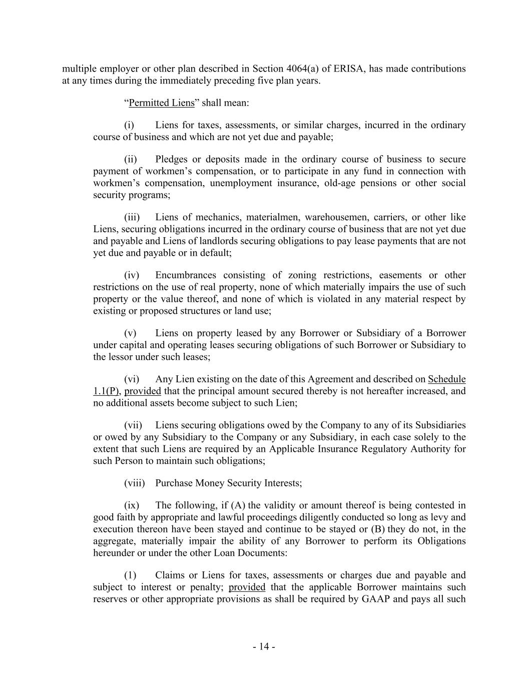 - 14 - multiple employer or other plan described in Section 4064(a) of ERISA, has made contributions at any times during the immediately preceding five plan years. “Permitted Liens” shall mean: (i) Liens for taxes, assessments, or similar charges, incurred in the ordinary course of business and which are not yet due and payable; (ii) Pledges or deposits made in the ordinary course of business to secure payment of workmen’s compensation, or to participate in any fund in connection with workmen’s compensation, unemployment insurance, old-age pensions or other social security programs; (iii) Liens of mechanics, materialmen, warehousemen, carriers, or other like Liens, securing obligations incurred in the ordinary course of business that are not yet due and payable and Liens of landlords securing obligations to pay lease payments that are not yet due and payable or in default; (iv) Encumbrances consisting of zoning restrictions, easements or other restrictions on the use of real property, none of which materially impairs the use of such property or the value thereof, and none of which is violated in any material respect by existing or proposed structures or land use; (v) Liens on property leased by any Borrower or Subsidiary of a Borrower under capital and operating leases securing obligations of such Borrower or Subsidiary to the lessor under such leases; (vi) Any Lien existing on the date of this Agreement and described on Schedule 1.1(P), provided that the principal amount secured thereby is not hereafter increased, and no additional assets become subject to such Lien; (vii) Liens securing obligations owed by the Company to any of its Subsidiaries or owed by any Subsidiary to the Company or any Subsidiary, in each case solely to the extent that such Liens are required by an Applicable Insurance Regulatory Authority for such Person to maintain such obligations; (viii) Purchase Money Security Interests; (ix) The following, if (A) the validity or amount thereof is being contested in good faith by appropriate and lawful proceedings diligently conducted so long as levy and execution thereon have been stayed and continue to be stayed or (B) they do not, in the aggregate, materially impair the ability of any Borrower to perform its Obligations hereunder or under the other Loan Documents: (1) Claims or Liens for taxes, assessments or charges due and payable and subject to interest or penalty; provided that the applicable Borrower maintains such reserves or other appropriate provisions as shall be required by GAAP and pays all such
