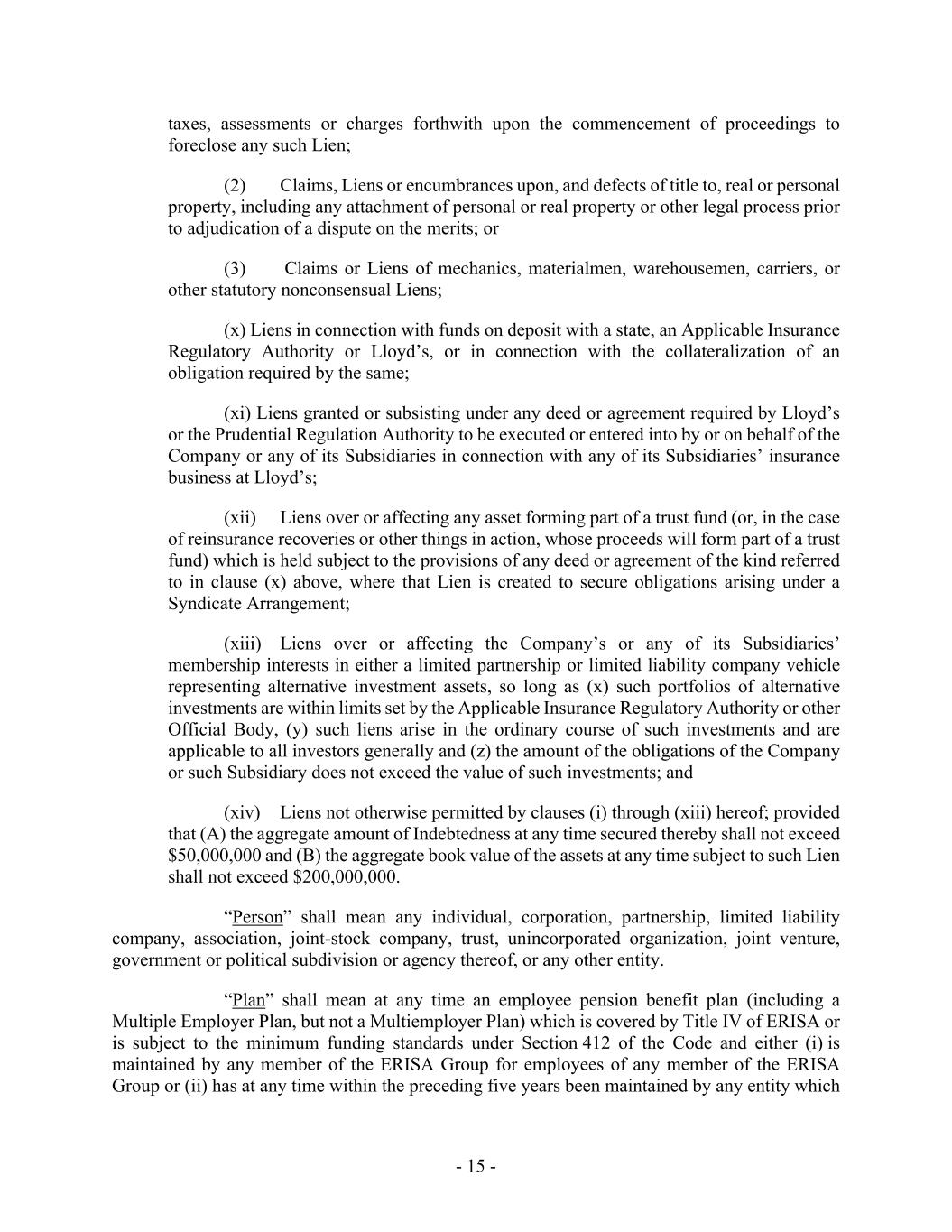 - 15 - taxes, assessments or charges forthwith upon the commencement of proceedings to foreclose any such Lien; (2) Claims, Liens or encumbrances upon, and defects of title to, real or personal property, including any attachment of personal or real property or other legal process prior to adjudication of a dispute on the merits; or (3) Claims or Liens of mechanics, materialmen, warehousemen, carriers, or other statutory nonconsensual Liens; (x) Liens in connection with funds on deposit with a state, an Applicable Insurance Regulatory Authority or Lloyd’s, or in connection with the collateralization of an obligation required by the same; (xi) Liens granted or subsisting under any deed or agreement required by Lloyd’s or the Prudential Regulation Authority to be executed or entered into by or on behalf of the Company or any of its Subsidiaries in connection with any of its Subsidiaries’ insurance business at Lloyd’s; (xii) Liens over or affecting any asset forming part of a trust fund (or, in the case of reinsurance recoveries or other things in action, whose proceeds will form part of a trust fund) which is held subject to the provisions of any deed or agreement of the kind referred to in clause (x) above, where that Lien is created to secure obligations arising under a Syndicate Arrangement; (xiii) Liens over or affecting the Company’s or any of its Subsidiaries’ membership interests in either a limited partnership or limited liability company vehicle representing alternative investment assets, so long as (x) such portfolios of alternative investments are within limits set by the Applicable Insurance Regulatory Authority or other Official Body, (y) such liens arise in the ordinary course of such investments and are applicable to all investors generally and (z) the amount of the obligations of the Company or such Subsidiary does not exceed the value of such investments; and (xiv) Liens not otherwise permitted by clauses (i) through (xiii) hereof; provided that (A) the aggregate amount of Indebtedness at any time secured thereby shall not exceed $50,000,000 and (B) the aggregate book value of the assets at any time subject to such Lien shall not exceed $200,000,000. “Person” shall mean any individual, corporation, partnership, limited liability company, association, joint-stock company, trust, unincorporated organization, joint venture, government or political subdivision or agency thereof, or any other entity. “Plan” shall mean at any time an employee pension benefit plan (including a Multiple Employer Plan, but not a Multiemployer Plan) which is covered by Title IV of ERISA or is subject to the minimum funding standards under Section 412 of the Code and either (i) is maintained by any member of the ERISA Group for employees of any member of the ERISA Group or (ii) has at any time within the preceding five years been maintained by any entity which