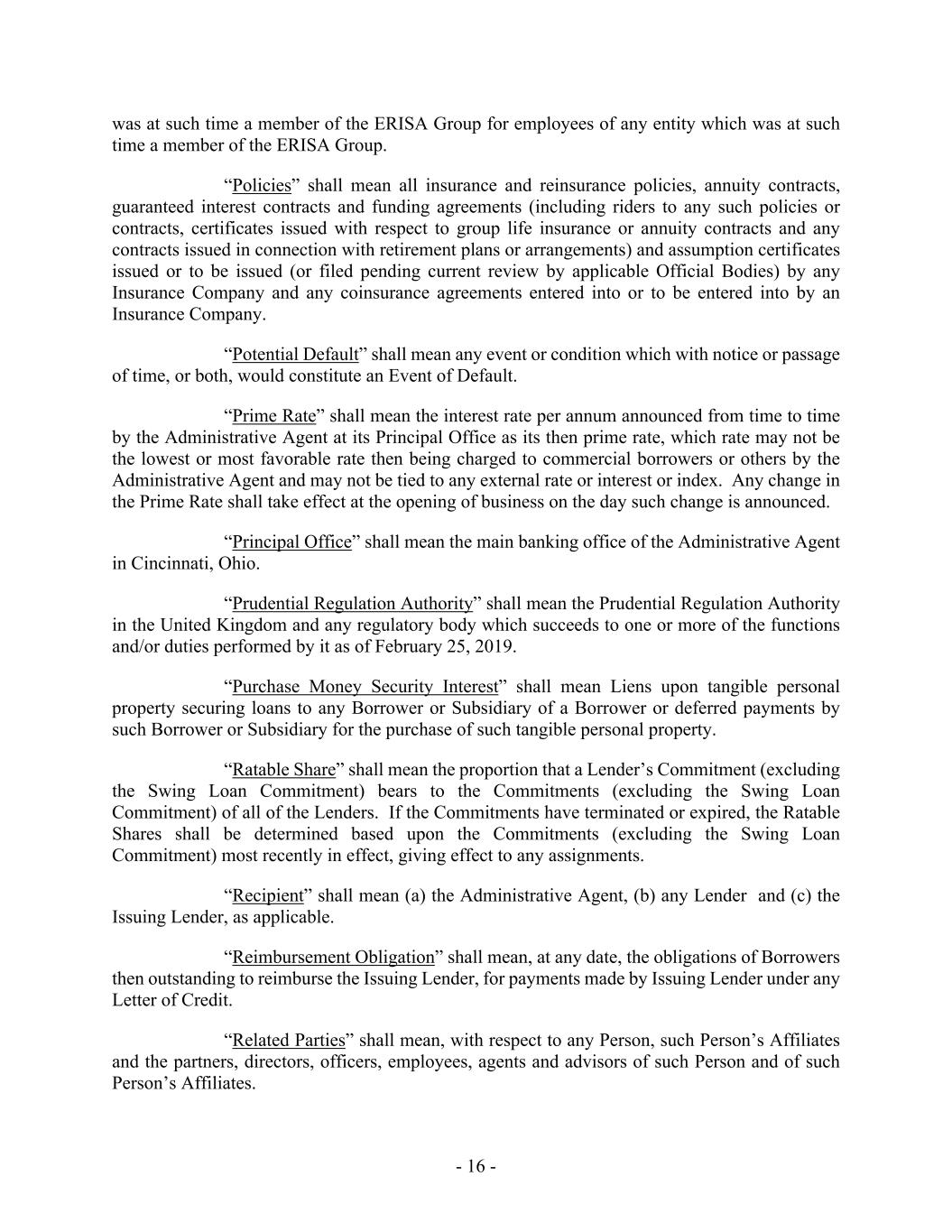 - 16 - was at such time a member of the ERISA Group for employees of any entity which was at such time a member of the ERISA Group. “Policies” shall mean all insurance and reinsurance policies, annuity contracts, guaranteed interest contracts and funding agreements (including riders to any such policies or contracts, certificates issued with respect to group life insurance or annuity contracts and any contracts issued in connection with retirement plans or arrangements) and assumption certificates issued or to be issued (or filed pending current review by applicable Official Bodies) by any Insurance Company and any coinsurance agreements entered into or to be entered into by an Insurance Company. “Potential Default” shall mean any event or condition which with notice or passage of time, or both, would constitute an Event of Default. “Prime Rate” shall mean the interest rate per annum announced from time to time by the Administrative Agent at its Principal Office as its then prime rate, which rate may not be the lowest or most favorable rate then being charged to commercial borrowers or others by the Administrative Agent and may not be tied to any external rate or interest or index. Any change in the Prime Rate shall take effect at the opening of business on the day such change is announced. “Principal Office” shall mean the main banking office of the Administrative Agent in Cincinnati, Ohio. “Prudential Regulation Authority” shall mean the Prudential Regulation Authority in the United Kingdom and any regulatory body which succeeds to one or more of the functions and/or duties performed by it as of February 25, 2019. “Purchase Money Security Interest” shall mean Liens upon tangible personal property securing loans to any Borrower or Subsidiary of a Borrower or deferred payments by such Borrower or Subsidiary for the purchase of such tangible personal property. “Ratable Share” shall mean the proportion that a Lender’s Commitment (excluding the Swing Loan Commitment) bears to the Commitments (excluding the Swing Loan Commitment) of all of the Lenders. If the Commitments have terminated or expired, the Ratable Shares shall be determined based upon the Commitments (excluding the Swing Loan Commitment) most recently in effect, giving effect to any assignments. “Recipient” shall mean (a) the Administrative Agent, (b) any Lender and (c) the Issuing Lender, as applicable. “Reimbursement Obligation” shall mean, at any date, the obligations of Borrowers then outstanding to reimburse the Issuing Lender, for payments made by Issuing Lender under any Letter of Credit. “Related Parties” shall mean, with respect to any Person, such Person’s Affiliates and the partners, directors, officers, employees, agents and advisors of such Person and of such Person’s Affiliates.