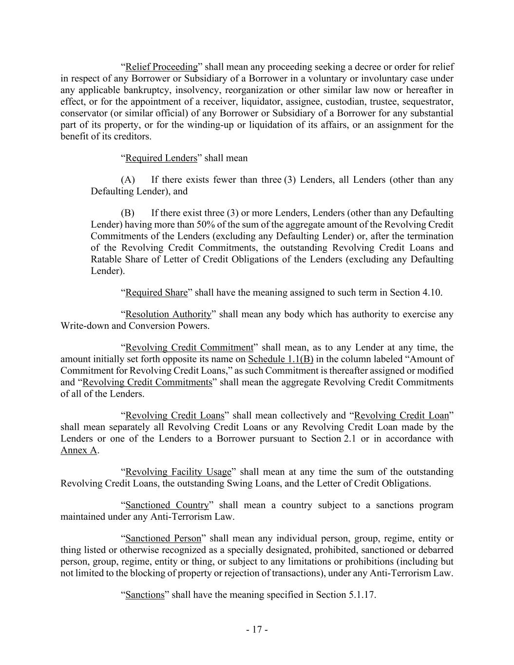- 17 - “Relief Proceeding” shall mean any proceeding seeking a decree or order for relief in respect of any Borrower or Subsidiary of a Borrower in a voluntary or involuntary case under any applicable bankruptcy, insolvency, reorganization or other similar law now or hereafter in effect, or for the appointment of a receiver, liquidator, assignee, custodian, trustee, sequestrator, conservator (or similar official) of any Borrower or Subsidiary of a Borrower for any substantial part of its property, or for the winding-up or liquidation of its affairs, or an assignment for the benefit of its creditors. “Required Lenders” shall mean (A) If there exists fewer than three (3) Lenders, all Lenders (other than any Defaulting Lender), and (B) If there exist three (3) or more Lenders, Lenders (other than any Defaulting Lender) having more than 50% of the sum of the aggregate amount of the Revolving Credit Commitments of the Lenders (excluding any Defaulting Lender) or, after the termination of the Revolving Credit Commitments, the outstanding Revolving Credit Loans and Ratable Share of Letter of Credit Obligations of the Lenders (excluding any Defaulting Lender). “Required Share” shall have the meaning assigned to such term in Section 4.10. “Resolution Authority” shall mean any body which has authority to exercise any Write-down and Conversion Powers. “Revolving Credit Commitment” shall mean, as to any Lender at any time, the amount initially set forth opposite its name on Schedule 1.1(B) in the column labeled “Amount of Commitment for Revolving Credit Loans,” as such Commitment is thereafter assigned or modified and “Revolving Credit Commitments” shall mean the aggregate Revolving Credit Commitments of all of the Lenders. “Revolving Credit Loans” shall mean collectively and “Revolving Credit Loan” shall mean separately all Revolving Credit Loans or any Revolving Credit Loan made by the Lenders or one of the Lenders to a Borrower pursuant to Section 2.1 or in accordance with Annex A. “Revolving Facility Usage” shall mean at any time the sum of the outstanding Revolving Credit Loans, the outstanding Swing Loans, and the Letter of Credit Obligations. “Sanctioned Country” shall mean a country subject to a sanctions program maintained under any Anti-Terrorism Law. “Sanctioned Person” shall mean any individual person, group, regime, entity or thing listed or otherwise recognized as a specially designated, prohibited, sanctioned or debarred person, group, regime, entity or thing, or subject to any limitations or prohibitions (including but not limited to the blocking of property or rejection of transactions), under any Anti-Terrorism Law. “Sanctions” shall have the meaning specified in Section 5.1.17.