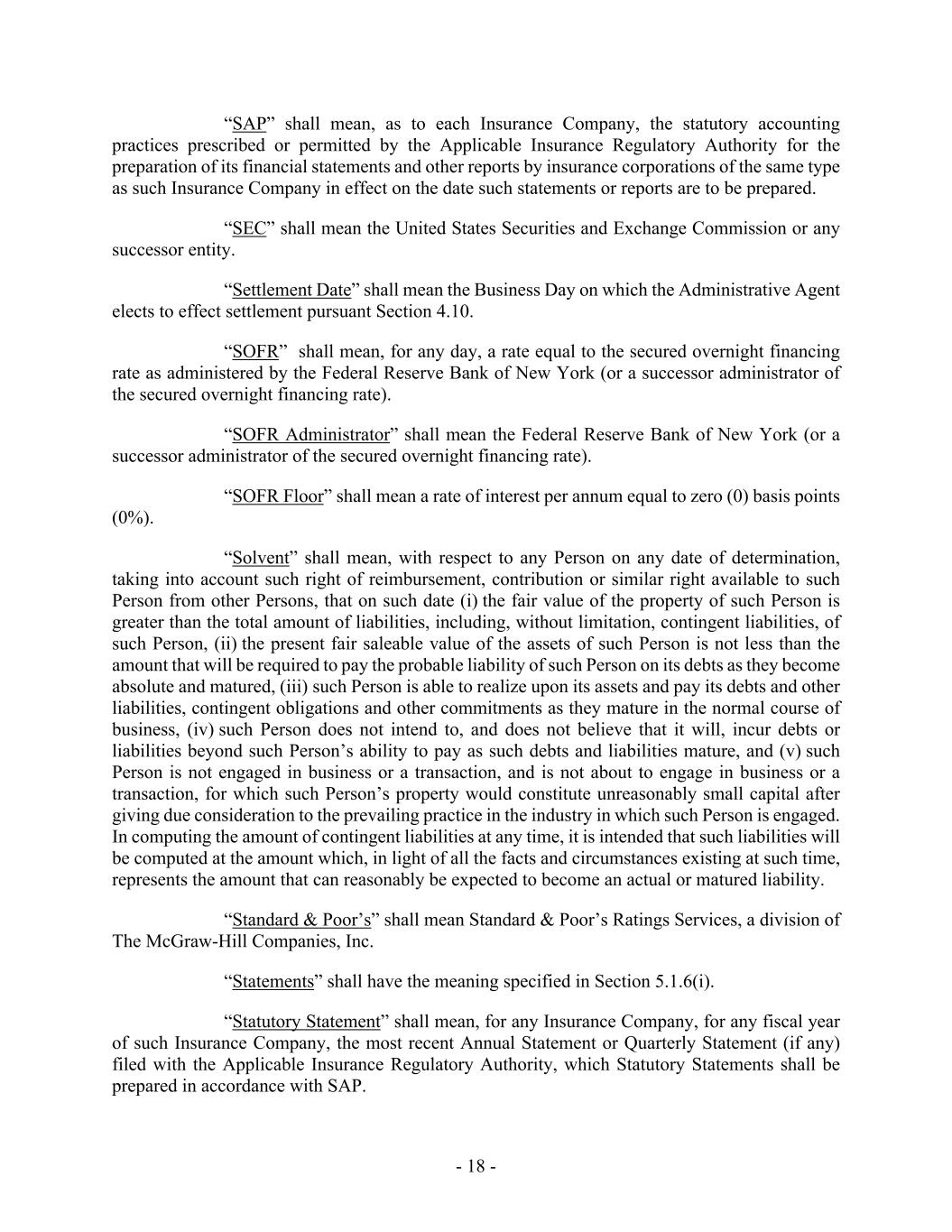 - 18 - “SAP” shall mean, as to each Insurance Company, the statutory accounting practices prescribed or permitted by the Applicable Insurance Regulatory Authority for the preparation of its financial statements and other reports by insurance corporations of the same type as such Insurance Company in effect on the date such statements or reports are to be prepared. “SEC” shall mean the United States Securities and Exchange Commission or any successor entity. “Settlement Date” shall mean the Business Day on which the Administrative Agent elects to effect settlement pursuant Section 4.10. “SOFR” shall mean, for any day, a rate equal to the secured overnight financing rate as administered by the Federal Reserve Bank of New York (or a successor administrator of the secured overnight financing rate). “SOFR Administrator” shall mean the Federal Reserve Bank of New York (or a successor administrator of the secured overnight financing rate). “SOFR Floor” shall mean a rate of interest per annum equal to zero (0) basis points (0%). “Solvent” shall mean, with respect to any Person on any date of determination, taking into account such right of reimbursement, contribution or similar right available to such Person from other Persons, that on such date (i) the fair value of the property of such Person is greater than the total amount of liabilities, including, without limitation, contingent liabilities, of such Person, (ii) the present fair saleable value of the assets of such Person is not less than the amount that will be required to pay the probable liability of such Person on its debts as they become absolute and matured, (iii) such Person is able to realize upon its assets and pay its debts and other liabilities, contingent obligations and other commitments as they mature in the normal course of business, (iv) such Person does not intend to, and does not believe that it will, incur debts or liabilities beyond such Person’s ability to pay as such debts and liabilities mature, and (v) such Person is not engaged in business or a transaction, and is not about to engage in business or a transaction, for which such Person’s property would constitute unreasonably small capital after giving due consideration to the prevailing practice in the industry in which such Person is engaged. In computing the amount of contingent liabilities at any time, it is intended that such liabilities will be computed at the amount which, in light of all the facts and circumstances existing at such time, represents the amount that can reasonably be expected to become an actual or matured liability. “Standard & Poor’s” shall mean Standard & Poor’s Ratings Services, a division of The McGraw-Hill Companies, Inc. “Statements” shall have the meaning specified in Section 5.1.6(i). “Statutory Statement” shall mean, for any Insurance Company, for any fiscal year of such Insurance Company, the most recent Annual Statement or Quarterly Statement (if any) filed with the Applicable Insurance Regulatory Authority, which Statutory Statements shall be prepared in accordance with SAP.