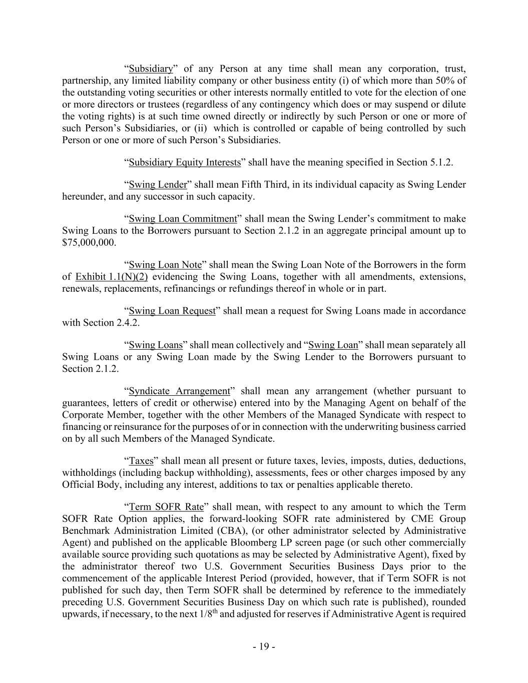 - 19 - “Subsidiary” of any Person at any time shall mean any corporation, trust, partnership, any limited liability company or other business entity (i) of which more than 50% of the outstanding voting securities or other interests normally entitled to vote for the election of one or more directors or trustees (regardless of any contingency which does or may suspend or dilute the voting rights) is at such time owned directly or indirectly by such Person or one or more of such Person’s Subsidiaries, or (ii) which is controlled or capable of being controlled by such Person or one or more of such Person’s Subsidiaries. “Subsidiary Equity Interests” shall have the meaning specified in Section 5.1.2. “Swing Lender” shall mean Fifth Third, in its individual capacity as Swing Lender hereunder, and any successor in such capacity. “Swing Loan Commitment” shall mean the Swing Lender’s commitment to make Swing Loans to the Borrowers pursuant to Section 2.1.2 in an aggregate principal amount up to $75,000,000. “Swing Loan Note” shall mean the Swing Loan Note of the Borrowers in the form of Exhibit 1.1(N)(2) evidencing the Swing Loans, together with all amendments, extensions, renewals, replacements, refinancings or refundings thereof in whole or in part. “Swing Loan Request” shall mean a request for Swing Loans made in accordance with Section 2.4.2. “Swing Loans” shall mean collectively and “Swing Loan” shall mean separately all Swing Loans or any Swing Loan made by the Swing Lender to the Borrowers pursuant to Section 2.1.2. “Syndicate Arrangement” shall mean any arrangement (whether pursuant to guarantees, letters of credit or otherwise) entered into by the Managing Agent on behalf of the Corporate Member, together with the other Members of the Managed Syndicate with respect to financing or reinsurance for the purposes of or in connection with the underwriting business carried on by all such Members of the Managed Syndicate. “Taxes” shall mean all present or future taxes, levies, imposts, duties, deductions, withholdings (including backup withholding), assessments, fees or other charges imposed by any Official Body, including any interest, additions to tax or penalties applicable thereto. “Term SOFR Rate” shall mean, with respect to any amount to which the Term SOFR Rate Option applies, the forward-looking SOFR rate administered by CME Group Benchmark Administration Limited (CBA), (or other administrator selected by Administrative Agent) and published on the applicable Bloomberg LP screen page (or such other commercially available source providing such quotations as may be selected by Administrative Agent), fixed by the administrator thereof two U.S. Government Securities Business Days prior to the commencement of the applicable Interest Period (provided, however, that if Term SOFR is not published for such day, then Term SOFR shall be determined by reference to the immediately preceding U.S. Government Securities Business Day on which such rate is published), rounded upwards, if necessary, to the next 1/8th and adjusted for reserves if Administrative Agent is required