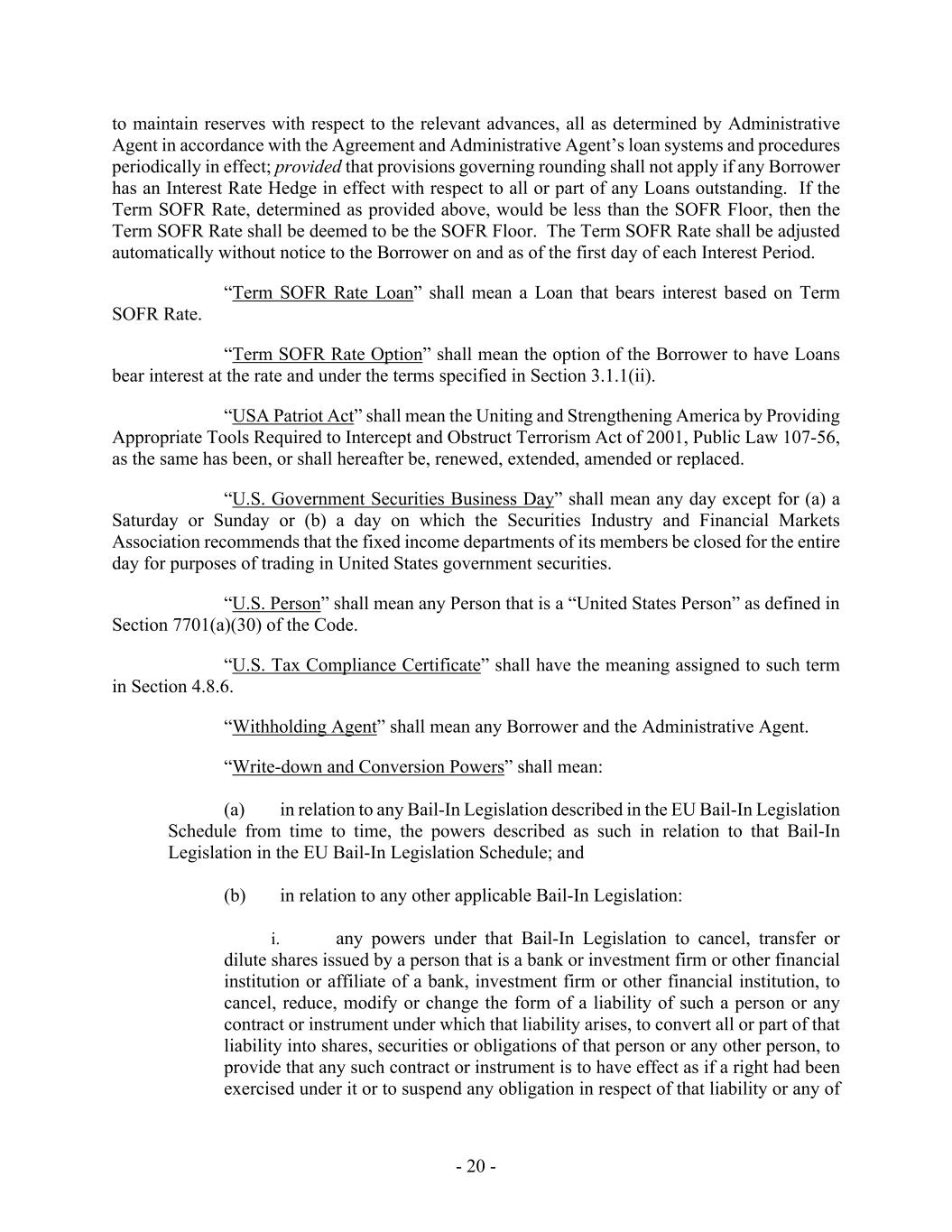 - 20 - to maintain reserves with respect to the relevant advances, all as determined by Administrative Agent in accordance with the Agreement and Administrative Agent’s loan systems and procedures periodically in effect; provided that provisions governing rounding shall not apply if any Borrower has an Interest Rate Hedge in effect with respect to all or part of any Loans outstanding. If the Term SOFR Rate, determined as provided above, would be less than the SOFR Floor, then the Term SOFR Rate shall be deemed to be the SOFR Floor. The Term SOFR Rate shall be adjusted automatically without notice to the Borrower on and as of the first day of each Interest Period. “Term SOFR Rate Loan” shall mean a Loan that bears interest based on Term SOFR Rate. “Term SOFR Rate Option” shall mean the option of the Borrower to have Loans bear interest at the rate and under the terms specified in Section 3.1.1(ii). “USA Patriot Act” shall mean the Uniting and Strengthening America by Providing Appropriate Tools Required to Intercept and Obstruct Terrorism Act of 2001, Public Law 107-56, as the same has been, or shall hereafter be, renewed, extended, amended or replaced. “U.S. Government Securities Business Day” shall mean any day except for (a) a Saturday or Sunday or (b) a day on which the Securities Industry and Financial Markets Association recommends that the fixed income departments of its members be closed for the entire day for purposes of trading in United States government securities. “U.S. Person” shall mean any Person that is a “United States Person” as defined in Section 7701(a)(30) of the Code. “U.S. Tax Compliance Certificate” shall have the meaning assigned to such term in Section 4.8.6. “Withholding Agent” shall mean any Borrower and the Administrative Agent. “Write-down and Conversion Powers” shall mean: (a) in relation to any Bail-In Legislation described in the EU Bail-In Legislation Schedule from time to time, the powers described as such in relation to that Bail-In Legislation in the EU Bail-In Legislation Schedule; and (b) in relation to any other applicable Bail-In Legislation: i. any powers under that Bail-In Legislation to cancel, transfer or dilute shares issued by a person that is a bank or investment firm or other financial institution or affiliate of a bank, investment firm or other financial institution, to cancel, reduce, modify or change the form of a liability of such a person or any contract or instrument under which that liability arises, to convert all or part of that liability into shares, securities or obligations of that person or any other person, to provide that any such contract or instrument is to have effect as if a right had been exercised under it or to suspend any obligation in respect of that liability or any of