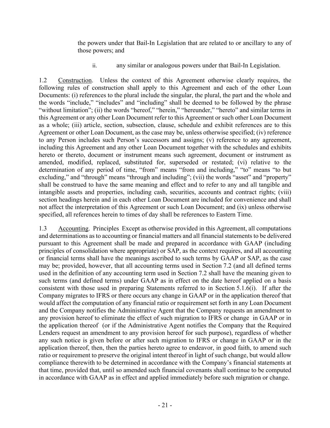 - 21 - the powers under that Bail-In Legislation that are related to or ancillary to any of those powers; and ii. any similar or analogous powers under that Bail-In Legislation. 1.2 Construction. Unless the context of this Agreement otherwise clearly requires, the following rules of construction shall apply to this Agreement and each of the other Loan Documents: (i) references to the plural include the singular, the plural, the part and the whole and the words “include,” “includes” and “including” shall be deemed to be followed by the phrase “without limitation”; (ii) the words “hereof,” “herein,” “hereunder,” “hereto” and similar terms in this Agreement or any other Loan Document refer to this Agreement or such other Loan Document as a whole; (iii) article, section, subsection, clause, schedule and exhibit references are to this Agreement or other Loan Document, as the case may be, unless otherwise specified; (iv) reference to any Person includes such Person’s successors and assigns; (v) reference to any agreement, including this Agreement and any other Loan Document together with the schedules and exhibits hereto or thereto, document or instrument means such agreement, document or instrument as amended, modified, replaced, substituted for, superseded or restated; (vi) relative to the determination of any period of time, “from” means “from and including,” “to” means “to but excluding,” and “through” means “through and including”; (vii) the words “asset” and “property” shall be construed to have the same meaning and effect and to refer to any and all tangible and intangible assets and properties, including cash, securities, accounts and contract rights; (viii) section headings herein and in each other Loan Document are included for convenience and shall not affect the interpretation of this Agreement or such Loan Document; and (ix) unless otherwise specified, all references herein to times of day shall be references to Eastern Time. 1.3 Accounting. Principles Except as otherwise provided in this Agreement, all computations and determinations as to accounting or financial matters and all financial statements to be delivered pursuant to this Agreement shall be made and prepared in accordance with GAAP (including principles of consolidation where appropriate) or SAP, as the context requires, and all accounting or financial terms shall have the meanings ascribed to such terms by GAAP or SAP, as the case may be; provided, however, that all accounting terms used in Section 7.2 (and all defined terms used in the definition of any accounting term used in Section 7.2 shall have the meaning given to such terms (and defined terms) under GAAP as in effect on the date hereof applied on a basis consistent with those used in preparing Statements referred to in Section 5.1.6(i). If after the Company migrates to IFRS or there occurs any change in GAAP or in the application thereof that would affect the computation of any financial ratio or requirement set forth in any Loan Document and the Company notifies the Administrative Agent that the Company requests an amendment to any provision hereof to eliminate the effect of such migration to IFRS or change in GAAP or in the application thereof (or if the Administrative Agent notifies the Company that the Required Lenders request an amendment to any provision hereof for such purpose), regardless of whether any such notice is given before or after such migration to IFRS or change in GAAP or in the application thereof, then, then the parties hereto agree to endeavor, in good faith, to amend such ratio or requirement to preserve the original intent thereof in light of such change, but would allow compliance therewith to be determined in accordance with the Company’s financial statements at that time, provided that, until so amended such financial covenants shall continue to be computed in accordance with GAAP as in effect and applied immediately before such migration or change.