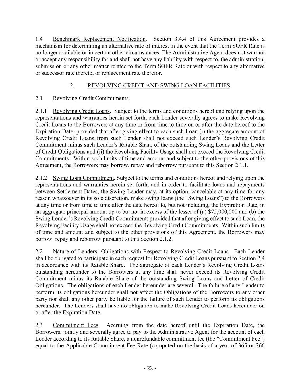 - 22 - 1.4 Benchmark Replacement Notification. Section 3.4.4 of this Agreement provides a mechanism for determining an alternative rate of interest in the event that the Term SOFR Rate is no longer available or in certain other circumstances. The Administrative Agent does not warrant or accept any responsibility for and shall not have any liability with respect to, the administration, submission or any other matter related to the Term SOFR Rate or with respect to any alternative or successor rate thereto, or replacement rate therefor. 2. REVOLVING CREDIT AND SWING LOAN FACILITIES 2.1 Revolving Credit Commitments. 2.1.1 Revolving Credit Loans. Subject to the terms and conditions hereof and relying upon the representations and warranties herein set forth, each Lender severally agrees to make Revolving Credit Loans to the Borrowers at any time or from time to time on or after the date hereof to the Expiration Date; provided that after giving effect to each such Loan (i) the aggregate amount of Revolving Credit Loans from such Lender shall not exceed such Lender’s Revolving Credit Commitment minus such Lender’s Ratable Share of the outstanding Swing Loans and the Letter of Credit Obligations and (ii) the Revolving Facility Usage shall not exceed the Revolving Credit Commitments. Within such limits of time and amount and subject to the other provisions of this Agreement, the Borrowers may borrow, repay and reborrow pursuant to this Section 2.1.1. 2.1.2 Swing Loan Commitment. Subject to the terms and conditions hereof and relying upon the representations and warranties herein set forth, and in order to facilitate loans and repayments between Settlement Dates, the Swing Lender may, at its option, cancelable at any time for any reason whatsoever in its sole discretion, make swing loans (the “Swing Loans”) to the Borrowers at any time or from time to time after the date hereof to, but not including, the Expiration Date, in an aggregate principal amount up to but not in excess of the lesser of (a) $75,000,000 and (b) the Swing Lender’s Revolving Credit Commitment; provided that after giving effect to such Loan, the Revolving Facility Usage shall not exceed the Revolving Credit Commitments. Within such limits of time and amount and subject to the other provisions of this Agreement, the Borrowers may borrow, repay and reborrow pursuant to this Section 2.1.2. 2.2 Nature of Lenders’ Obligations with Respect to Revolving Credit Loans. Each Lender shall be obligated to participate in each request for Revolving Credit Loans pursuant to Section 2.4 in accordance with its Ratable Share. The aggregate of each Lender’s Revolving Credit Loans outstanding hereunder to the Borrowers at any time shall never exceed its Revolving Credit Commitment minus its Ratable Share of the outstanding Swing Loans and Letter of Credit Obligations. The obligations of each Lender hereunder are several. The failure of any Lender to perform its obligations hereunder shall not affect the Obligations of the Borrowers to any other party nor shall any other party be liable for the failure of such Lender to perform its obligations hereunder. The Lenders shall have no obligation to make Revolving Credit Loans hereunder on or after the Expiration Date. 2.3 Commitment Fees. Accruing from the date hereof until the Expiration Date, the Borrowers, jointly and severally agree to pay to the Administrative Agent for the account of each Lender according to its Ratable Share, a nonrefundable commitment fee (the “Commitment Fee”) equal to the Applicable Commitment Fee Rate (computed on the basis of a year of 365 or 366
