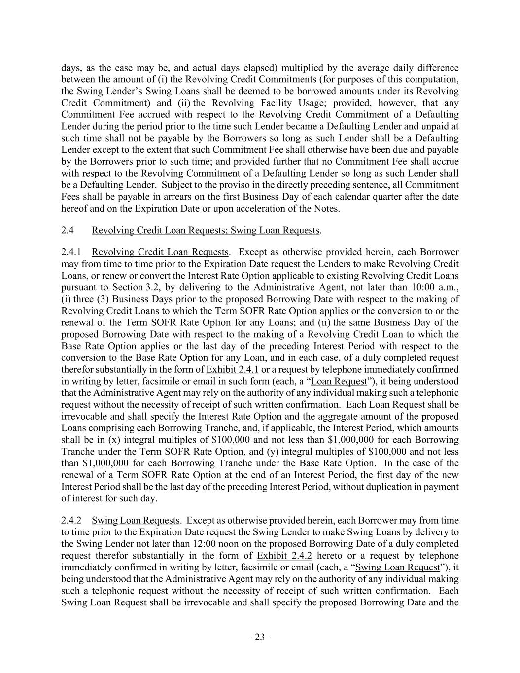 - 23 - days, as the case may be, and actual days elapsed) multiplied by the average daily difference between the amount of (i) the Revolving Credit Commitments (for purposes of this computation, the Swing Lender’s Swing Loans shall be deemed to be borrowed amounts under its Revolving Credit Commitment) and (ii) the Revolving Facility Usage; provided, however, that any Commitment Fee accrued with respect to the Revolving Credit Commitment of a Defaulting Lender during the period prior to the time such Lender became a Defaulting Lender and unpaid at such time shall not be payable by the Borrowers so long as such Lender shall be a Defaulting Lender except to the extent that such Commitment Fee shall otherwise have been due and payable by the Borrowers prior to such time; and provided further that no Commitment Fee shall accrue with respect to the Revolving Commitment of a Defaulting Lender so long as such Lender shall be a Defaulting Lender. Subject to the proviso in the directly preceding sentence, all Commitment Fees shall be payable in arrears on the first Business Day of each calendar quarter after the date hereof and on the Expiration Date or upon acceleration of the Notes. 2.4 Revolving Credit Loan Requests; Swing Loan Requests. 2.4.1 Revolving Credit Loan Requests. Except as otherwise provided herein, each Borrower may from time to time prior to the Expiration Date request the Lenders to make Revolving Credit Loans, or renew or convert the Interest Rate Option applicable to existing Revolving Credit Loans pursuant to Section 3.2, by delivering to the Administrative Agent, not later than 10:00 a.m., (i) three (3) Business Days prior to the proposed Borrowing Date with respect to the making of Revolving Credit Loans to which the Term SOFR Rate Option applies or the conversion to or the renewal of the Term SOFR Rate Option for any Loans; and (ii) the same Business Day of the proposed Borrowing Date with respect to the making of a Revolving Credit Loan to which the Base Rate Option applies or the last day of the preceding Interest Period with respect to the conversion to the Base Rate Option for any Loan, and in each case, of a duly completed request therefor substantially in the form of Exhibit 2.4.1 or a request by telephone immediately confirmed in writing by letter, facsimile or email in such form (each, a “Loan Request”), it being understood that the Administrative Agent may rely on the authority of any individual making such a telephonic request without the necessity of receipt of such written confirmation. Each Loan Request shall be irrevocable and shall specify the Interest Rate Option and the aggregate amount of the proposed Loans comprising each Borrowing Tranche, and, if applicable, the Interest Period, which amounts shall be in (x) integral multiples of $100,000 and not less than $1,000,000 for each Borrowing Tranche under the Term SOFR Rate Option, and (y) integral multiples of $100,000 and not less than $1,000,000 for each Borrowing Tranche under the Base Rate Option. In the case of the renewal of a Term SOFR Rate Option at the end of an Interest Period, the first day of the new Interest Period shall be the last day of the preceding Interest Period, without duplication in payment of interest for such day. 2.4.2 Swing Loan Requests. Except as otherwise provided herein, each Borrower may from time to time prior to the Expiration Date request the Swing Lender to make Swing Loans by delivery to the Swing Lender not later than 12:00 noon on the proposed Borrowing Date of a duly completed request therefor substantially in the form of Exhibit 2.4.2 hereto or a request by telephone immediately confirmed in writing by letter, facsimile or email (each, a “Swing Loan Request”), it being understood that the Administrative Agent may rely on the authority of any individual making such a telephonic request without the necessity of receipt of such written confirmation. Each Swing Loan Request shall be irrevocable and shall specify the proposed Borrowing Date and the