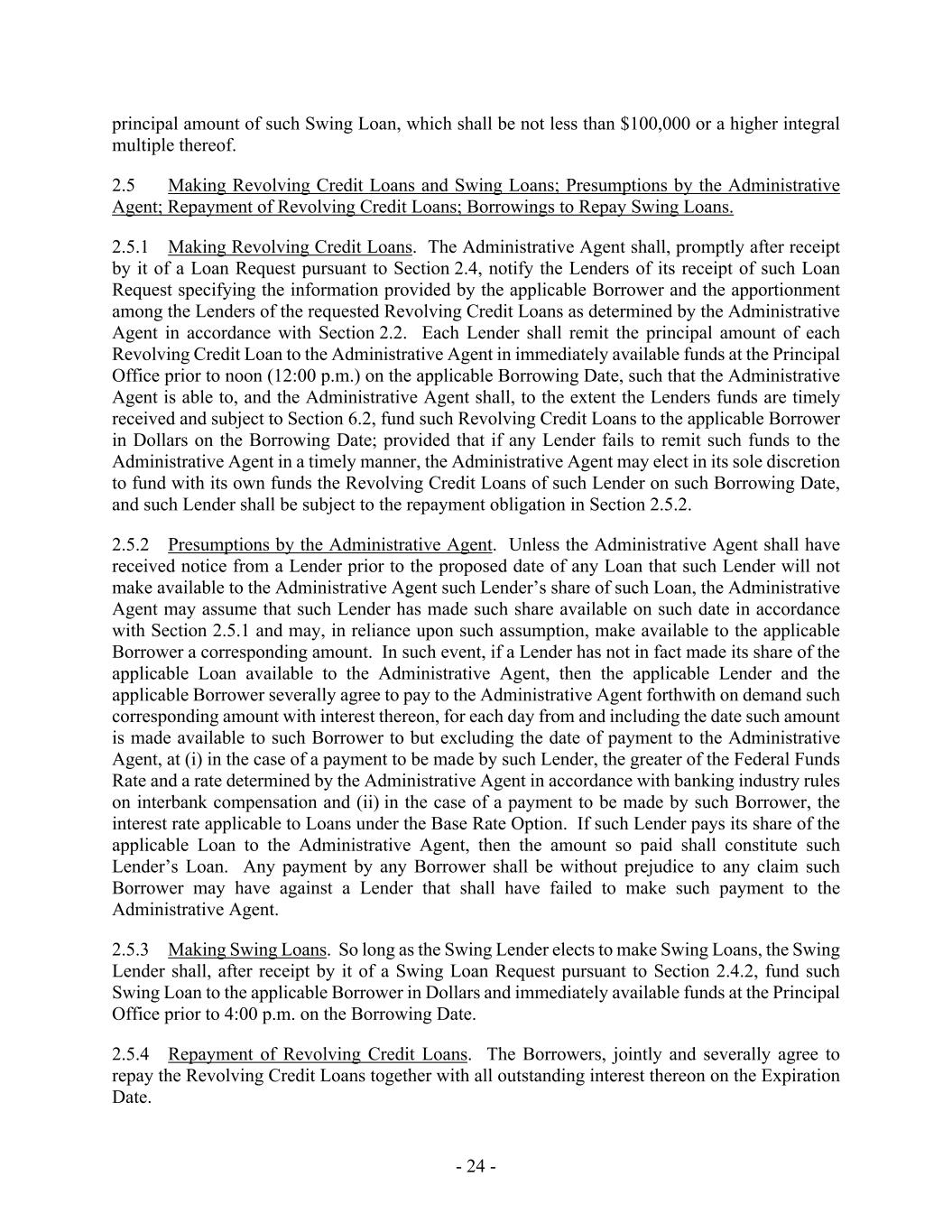 - 24 - principal amount of such Swing Loan, which shall be not less than $100,000 or a higher integral multiple thereof. 2.5 Making Revolving Credit Loans and Swing Loans; Presumptions by the Administrative Agent; Repayment of Revolving Credit Loans; Borrowings to Repay Swing Loans. 2.5.1 Making Revolving Credit Loans. The Administrative Agent shall, promptly after receipt by it of a Loan Request pursuant to Section 2.4, notify the Lenders of its receipt of such Loan Request specifying the information provided by the applicable Borrower and the apportionment among the Lenders of the requested Revolving Credit Loans as determined by the Administrative Agent in accordance with Section 2.2. Each Lender shall remit the principal amount of each Revolving Credit Loan to the Administrative Agent in immediately available funds at the Principal Office prior to noon (12:00 p.m.) on the applicable Borrowing Date, such that the Administrative Agent is able to, and the Administrative Agent shall, to the extent the Lenders funds are timely received and subject to Section 6.2, fund such Revolving Credit Loans to the applicable Borrower in Dollars on the Borrowing Date; provided that if any Lender fails to remit such funds to the Administrative Agent in a timely manner, the Administrative Agent may elect in its sole discretion to fund with its own funds the Revolving Credit Loans of such Lender on such Borrowing Date, and such Lender shall be subject to the repayment obligation in Section 2.5.2. 2.5.2 Presumptions by the Administrative Agent. Unless the Administrative Agent shall have received notice from a Lender prior to the proposed date of any Loan that such Lender will not make available to the Administrative Agent such Lender’s share of such Loan, the Administrative Agent may assume that such Lender has made such share available on such date in accordance with Section 2.5.1 and may, in reliance upon such assumption, make available to the applicable Borrower a corresponding amount. In such event, if a Lender has not in fact made its share of the applicable Loan available to the Administrative Agent, then the applicable Lender and the applicable Borrower severally agree to pay to the Administrative Agent forthwith on demand such corresponding amount with interest thereon, for each day from and including the date such amount is made available to such Borrower to but excluding the date of payment to the Administrative Agent, at (i) in the case of a payment to be made by such Lender, the greater of the Federal Funds Rate and a rate determined by the Administrative Agent in accordance with banking industry rules on interbank compensation and (ii) in the case of a payment to be made by such Borrower, the interest rate applicable to Loans under the Base Rate Option. If such Lender pays its share of the applicable Loan to the Administrative Agent, then the amount so paid shall constitute such Lender’s Loan. Any payment by any Borrower shall be without prejudice to any claim such Borrower may have against a Lender that shall have failed to make such payment to the Administrative Agent. 2.5.3 Making Swing Loans. So long as the Swing Lender elects to make Swing Loans, the Swing Lender shall, after receipt by it of a Swing Loan Request pursuant to Section 2.4.2, fund such Swing Loan to the applicable Borrower in Dollars and immediately available funds at the Principal Office prior to 4:00 p.m. on the Borrowing Date. 2.5.4 Repayment of Revolving Credit Loans. The Borrowers, jointly and severally agree to repay the Revolving Credit Loans together with all outstanding interest thereon on the Expiration Date.