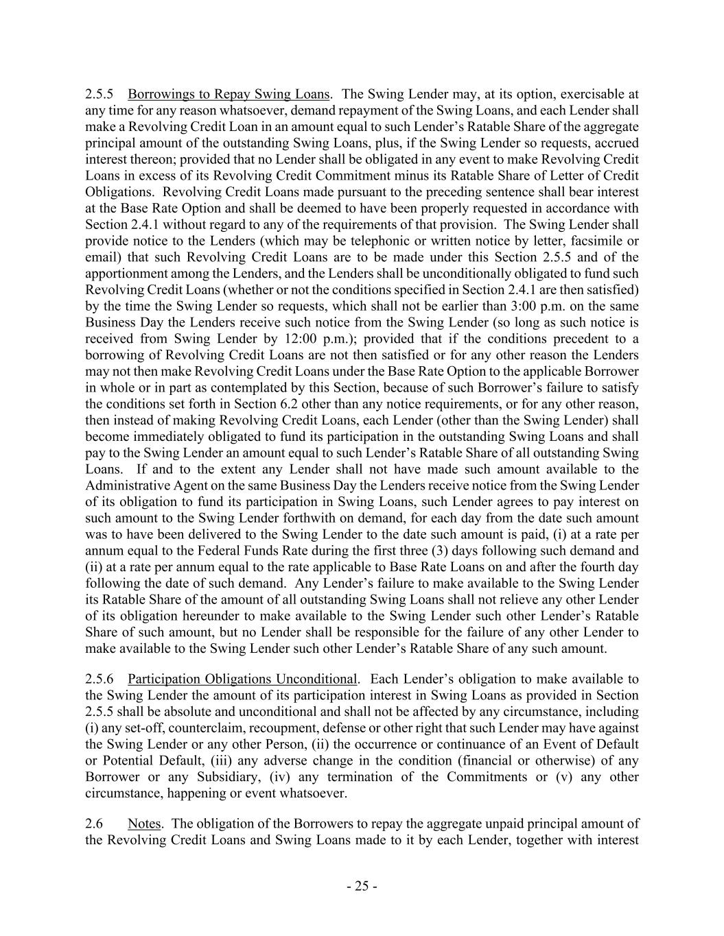 - 25 - 2.5.5 Borrowings to Repay Swing Loans. The Swing Lender may, at its option, exercisable at any time for any reason whatsoever, demand repayment of the Swing Loans, and each Lender shall make a Revolving Credit Loan in an amount equal to such Lender’s Ratable Share of the aggregate principal amount of the outstanding Swing Loans, plus, if the Swing Lender so requests, accrued interest thereon; provided that no Lender shall be obligated in any event to make Revolving Credit Loans in excess of its Revolving Credit Commitment minus its Ratable Share of Letter of Credit Obligations. Revolving Credit Loans made pursuant to the preceding sentence shall bear interest at the Base Rate Option and shall be deemed to have been properly requested in accordance with Section 2.4.1 without regard to any of the requirements of that provision. The Swing Lender shall provide notice to the Lenders (which may be telephonic or written notice by letter, facsimile or email) that such Revolving Credit Loans are to be made under this Section 2.5.5 and of the apportionment among the Lenders, and the Lenders shall be unconditionally obligated to fund such Revolving Credit Loans (whether or not the conditions specified in Section 2.4.1 are then satisfied) by the time the Swing Lender so requests, which shall not be earlier than 3:00 p.m. on the same Business Day the Lenders receive such notice from the Swing Lender (so long as such notice is received from Swing Lender by 12:00 p.m.); provided that if the conditions precedent to a borrowing of Revolving Credit Loans are not then satisfied or for any other reason the Lenders may not then make Revolving Credit Loans under the Base Rate Option to the applicable Borrower in whole or in part as contemplated by this Section, because of such Borrower’s failure to satisfy the conditions set forth in Section 6.2 other than any notice requirements, or for any other reason, then instead of making Revolving Credit Loans, each Lender (other than the Swing Lender) shall become immediately obligated to fund its participation in the outstanding Swing Loans and shall pay to the Swing Lender an amount equal to such Lender’s Ratable Share of all outstanding Swing Loans. If and to the extent any Lender shall not have made such amount available to the Administrative Agent on the same Business Day the Lenders receive notice from the Swing Lender of its obligation to fund its participation in Swing Loans, such Lender agrees to pay interest on such amount to the Swing Lender forthwith on demand, for each day from the date such amount was to have been delivered to the Swing Lender to the date such amount is paid, (i) at a rate per annum equal to the Federal Funds Rate during the first three (3) days following such demand and (ii) at a rate per annum equal to the rate applicable to Base Rate Loans on and after the fourth day following the date of such demand. Any Lender’s failure to make available to the Swing Lender its Ratable Share of the amount of all outstanding Swing Loans shall not relieve any other Lender of its obligation hereunder to make available to the Swing Lender such other Lender’s Ratable Share of such amount, but no Lender shall be responsible for the failure of any other Lender to make available to the Swing Lender such other Lender’s Ratable Share of any such amount. 2.5.6 Participation Obligations Unconditional. Each Lender’s obligation to make available to the Swing Lender the amount of its participation interest in Swing Loans as provided in Section 2.5.5 shall be absolute and unconditional and shall not be affected by any circumstance, including (i) any set-off, counterclaim, recoupment, defense or other right that such Lender may have against the Swing Lender or any other Person, (ii) the occurrence or continuance of an Event of Default or Potential Default, (iii) any adverse change in the condition (financial or otherwise) of any Borrower or any Subsidiary, (iv) any termination of the Commitments or (v) any other circumstance, happening or event whatsoever. 2.6 Notes. The obligation of the Borrowers to repay the aggregate unpaid principal amount of the Revolving Credit Loans and Swing Loans made to it by each Lender, together with interest