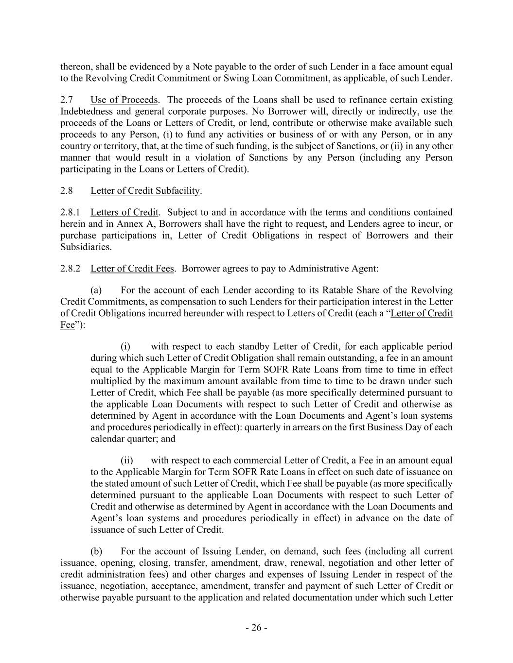 - 26 - thereon, shall be evidenced by a Note payable to the order of such Lender in a face amount equal to the Revolving Credit Commitment or Swing Loan Commitment, as applicable, of such Lender. 2.7 Use of Proceeds. The proceeds of the Loans shall be used to refinance certain existing Indebtedness and general corporate purposes. No Borrower will, directly or indirectly, use the proceeds of the Loans or Letters of Credit, or lend, contribute or otherwise make available such proceeds to any Person, (i) to fund any activities or business of or with any Person, or in any country or territory, that, at the time of such funding, is the subject of Sanctions, or (ii) in any other manner that would result in a violation of Sanctions by any Person (including any Person participating in the Loans or Letters of Credit). 2.8 Letter of Credit Subfacility. 2.8.1 Letters of Credit. Subject to and in accordance with the terms and conditions contained herein and in Annex A, Borrowers shall have the right to request, and Lenders agree to incur, or purchase participations in, Letter of Credit Obligations in respect of Borrowers and their Subsidiaries. 2.8.2 Letter of Credit Fees. Borrower agrees to pay to Administrative Agent: (a) For the account of each Lender according to its Ratable Share of the Revolving Credit Commitments, as compensation to such Lenders for their participation interest in the Letter of Credit Obligations incurred hereunder with respect to Letters of Credit (each a “Letter of Credit Fee”): (i) with respect to each standby Letter of Credit, for each applicable period during which such Letter of Credit Obligation shall remain outstanding, a fee in an amount equal to the Applicable Margin for Term SOFR Rate Loans from time to time in effect multiplied by the maximum amount available from time to time to be drawn under such Letter of Credit, which Fee shall be payable (as more specifically determined pursuant to the applicable Loan Documents with respect to such Letter of Credit and otherwise as determined by Agent in accordance with the Loan Documents and Agent’s loan systems and procedures periodically in effect): quarterly in arrears on the first Business Day of each calendar quarter; and (ii) with respect to each commercial Letter of Credit, a Fee in an amount equal to the Applicable Margin for Term SOFR Rate Loans in effect on such date of issuance on the stated amount of such Letter of Credit, which Fee shall be payable (as more specifically determined pursuant to the applicable Loan Documents with respect to such Letter of Credit and otherwise as determined by Agent in accordance with the Loan Documents and Agent’s loan systems and procedures periodically in effect) in advance on the date of issuance of such Letter of Credit. (b) For the account of Issuing Lender, on demand, such fees (including all current issuance, opening, closing, transfer, amendment, draw, renewal, negotiation and other letter of credit administration fees) and other charges and expenses of Issuing Lender in respect of the issuance, negotiation, acceptance, amendment, transfer and payment of such Letter of Credit or otherwise payable pursuant to the application and related documentation under which such Letter