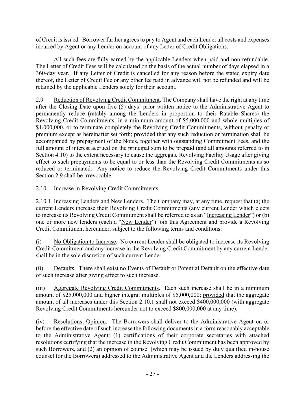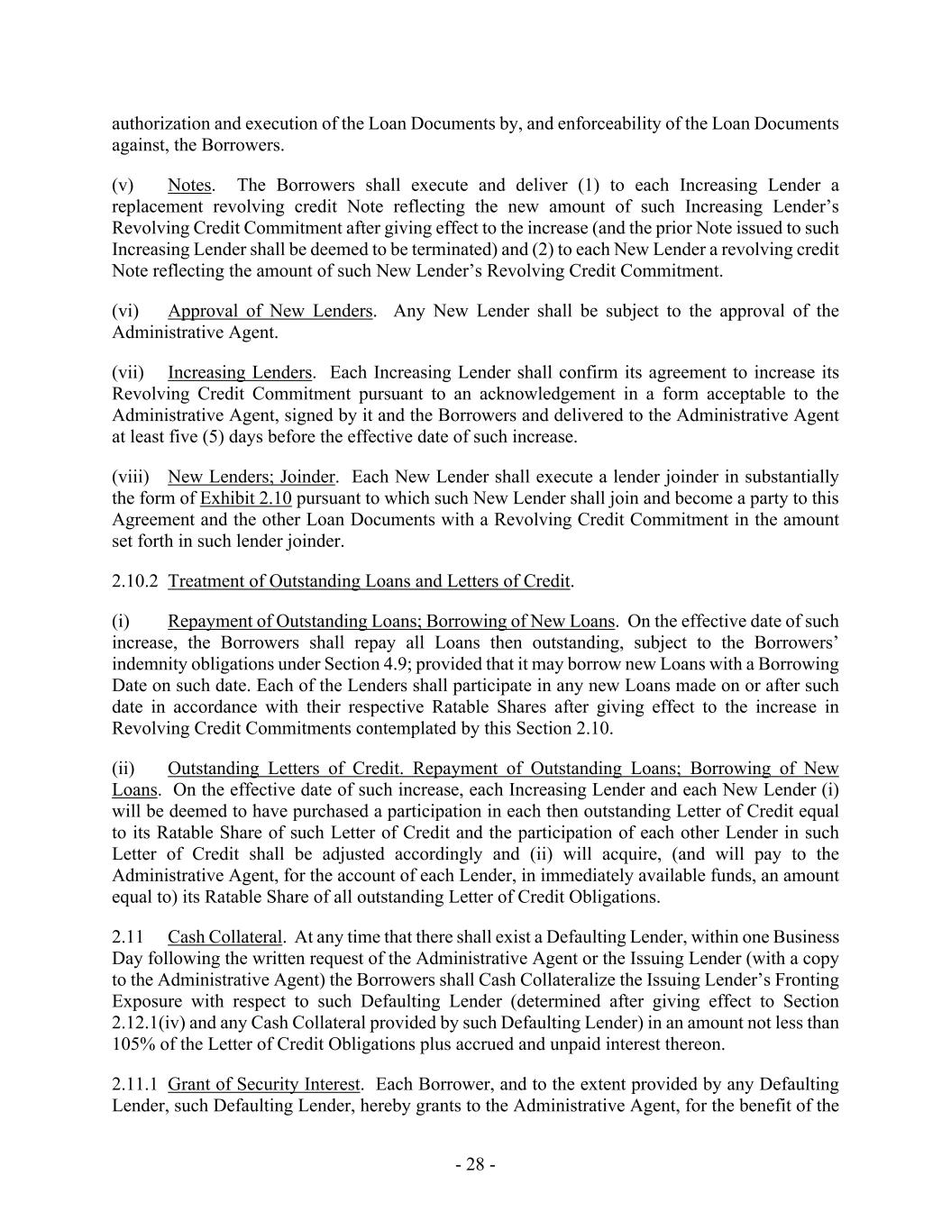 - 28 - authorization and execution of the Loan Documents by, and enforceability of the Loan Documents against, the Borrowers. (v) Notes. The Borrowers shall execute and deliver (1) to each Increasing Lender a replacement revolving credit Note reflecting the new amount of such Increasing Lender’s Revolving Credit Commitment after giving effect to the increase (and the prior Note issued to such Increasing Lender shall be deemed to be terminated) and (2) to each New Lender a revolving credit Note reflecting the amount of such New Lender’s Revolving Credit Commitment. (vi) Approval of New Lenders. Any New Lender shall be subject to the approval of the Administrative Agent. (vii) Increasing Lenders. Each Increasing Lender shall confirm its agreement to increase its Revolving Credit Commitment pursuant to an acknowledgement in a form acceptable to the Administrative Agent, signed by it and the Borrowers and delivered to the Administrative Agent at least five (5) days before the effective date of such increase. (viii) New Lenders; Joinder. Each New Lender shall execute a lender joinder in substantially the form of Exhibit 2.10 pursuant to which such New Lender shall join and become a party to this Agreement and the other Loan Documents with a Revolving Credit Commitment in the amount set forth in such lender joinder. 2.10.2 Treatment of Outstanding Loans and Letters of Credit. (i) Repayment of Outstanding Loans; Borrowing of New Loans. On the effective date of such increase, the Borrowers shall repay all Loans then outstanding, subject to the Borrowers’ indemnity obligations under Section 4.9; provided that it may borrow new Loans with a Borrowing Date on such date. Each of the Lenders shall participate in any new Loans made on or after such date in accordance with their respective Ratable Shares after giving effect to the increase in Revolving Credit Commitments contemplated by this Section 2.10. (ii) Outstanding Letters of Credit. Repayment of Outstanding Loans; Borrowing of New Loans. On the effective date of such increase, each Increasing Lender and each New Lender (i) will be deemed to have purchased a participation in each then outstanding Letter of Credit equal to its Ratable Share of such Letter of Credit and the participation of each other Lender in such Letter of Credit shall be adjusted accordingly and (ii) will acquire, (and will pay to the Administrative Agent, for the account of each Lender, in immediately available funds, an amount equal to) its Ratable Share of all outstanding Letter of Credit Obligations. 2.11 Cash Collateral. At any time that there shall exist a Defaulting Lender, within one Business Day following the written request of the Administrative Agent or the Issuing Lender (with a copy to the Administrative Agent) the Borrowers shall Cash Collateralize the Issuing Lender’s Fronting Exposure with respect to such Defaulting Lender (determined after giving effect to Section 2.12.1(iv) and any Cash Collateral provided by such Defaulting Lender) in an amount not less than 105% of the Letter of Credit Obligations plus accrued and unpaid interest thereon. 2.11.1 Grant of Security Interest. Each Borrower, and to the extent provided by any Defaulting Lender, such Defaulting Lender, hereby grants to the Administrative Agent, for the benefit of the