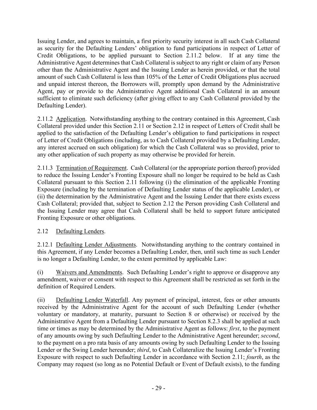 - 29 - Issuing Lender, and agrees to maintain, a first priority security interest in all such Cash Collateral as security for the Defaulting Lenders’ obligation to fund participations in respect of Letter of Credit Obligations, to be applied pursuant to Section 2.11.2 below. If at any time the Administrative Agent determines that Cash Collateral is subject to any right or claim of any Person other than the Administrative Agent and the Issuing Lender as herein provided, or that the total amount of such Cash Collateral is less than 105% of the Letter of Credit Obligations plus accrued and unpaid interest thereon, the Borrowers will, promptly upon demand by the Administrative Agent, pay or provide to the Administrative Agent additional Cash Collateral in an amount sufficient to eliminate such deficiency (after giving effect to any Cash Collateral provided by the Defaulting Lender). 2.11.2 Application. Notwithstanding anything to the contrary contained in this Agreement, Cash Collateral provided under this Section 2.11 or Section 2.12 in respect of Letters of Credit shall be applied to the satisfaction of the Defaulting Lender’s obligation to fund participations in respect of Letter of Credit Obligations (including, as to Cash Collateral provided by a Defaulting Lender, any interest accrued on such obligation) for which the Cash Collateral was so provided, prior to any other application of such property as may otherwise be provided for herein. 2.11.3 Termination of Requirement. Cash Collateral (or the appropriate portion thereof) provided to reduce the Issuing Lender’s Fronting Exposure shall no longer be required to be held as Cash Collateral pursuant to this Section 2.11 following (i) the elimination of the applicable Fronting Exposure (including by the termination of Defaulting Lender status of the applicable Lender), or (ii) the determination by the Administrative Agent and the Issuing Lender that there exists excess Cash Collateral; provided that, subject to Section 2.12 the Person providing Cash Collateral and the Issuing Lender may agree that Cash Collateral shall be held to support future anticipated Fronting Exposure or other obligations. 2.12 Defaulting Lenders. 2.12.1 Defaulting Lender Adjustments. Notwithstanding anything to the contrary contained in this Agreement, if any Lender becomes a Defaulting Lender, then, until such time as such Lender is no longer a Defaulting Lender, to the extent permitted by applicable Law: (i) Waivers and Amendments. Such Defaulting Lender’s right to approve or disapprove any amendment, waiver or consent with respect to this Agreement shall be restricted as set forth in the definition of Required Lenders. (ii) Defaulting Lender Waterfall. Any payment of principal, interest, fees or other amounts received by the Administrative Agent for the account of such Defaulting Lender (whether voluntary or mandatory, at maturity, pursuant to Section 8 or otherwise) or received by the Administrative Agent from a Defaulting Lender pursuant to Section 8.2.3 shall be applied at such time or times as may be determined by the Administrative Agent as follows: first, to the payment of any amounts owing by such Defaulting Lender to the Administrative Agent hereunder; second, to the payment on a pro rata basis of any amounts owing by such Defaulting Lender to the Issuing Lender or the Swing Lender hereunder; third, to Cash Collateralize the Issuing Lender’s Fronting Exposure with respect to such Defaulting Lender in accordance with Section 2.11; fourth, as the Company may request (so long as no Potential Default or Event of Default exists), to the funding