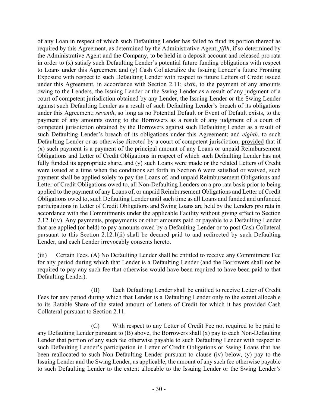 - 30 - of any Loan in respect of which such Defaulting Lender has failed to fund its portion thereof as required by this Agreement, as determined by the Administrative Agent; fifth, if so determined by the Administrative Agent and the Company, to be held in a deposit account and released pro rata in order to (x) satisfy such Defaulting Lender’s potential future funding obligations with respect to Loans under this Agreement and (y) Cash Collateralize the Issuing Lender’s future Fronting Exposure with respect to such Defaulting Lender with respect to future Letters of Credit issued under this Agreement, in accordance with Section 2.11; sixth, to the payment of any amounts owing to the Lenders, the Issuing Lender or the Swing Lender as a result of any judgment of a court of competent jurisdiction obtained by any Lender, the Issuing Lender or the Swing Lender against such Defaulting Lender as a result of such Defaulting Lender’s breach of its obligations under this Agreement; seventh, so long as no Potential Default or Event of Default exists, to the payment of any amounts owing to the Borrowers as a result of any judgment of a court of competent jurisdiction obtained by the Borrowers against such Defaulting Lender as a result of such Defaulting Lender’s breach of its obligations under this Agreement; and eighth, to such Defaulting Lender or as otherwise directed by a court of competent jurisdiction; provided that if (x) such payment is a payment of the principal amount of any Loans or unpaid Reimbursement Obligations and Letter of Credit Obligations in respect of which such Defaulting Lender has not fully funded its appropriate share, and (y) such Loans were made or the related Letters of Credit were issued at a time when the conditions set forth in Section 6 were satisfied or waived, such payment shall be applied solely to pay the Loans of, and unpaid Reimbursement Obligations and Letter of Credit Obligations owed to, all Non-Defaulting Lenders on a pro rata basis prior to being applied to the payment of any Loans of, or unpaid Reimbursement Obligations and Letter of Credit Obligations owed to, such Defaulting Lender until such time as all Loans and funded and unfunded participations in Letter of Credit Obligations and Swing Loans are held by the Lenders pro rata in accordance with the Commitments under the applicable Facility without giving effect to Section 2.12.1(iv). Any payments, prepayments or other amounts paid or payable to a Defaulting Lender that are applied (or held) to pay amounts owed by a Defaulting Lender or to post Cash Collateral pursuant to this Section 2.12.1(ii) shall be deemed paid to and redirected by such Defaulting Lender, and each Lender irrevocably consents hereto. (iii) Certain Fees. (A) No Defaulting Lender shall be entitled to receive any Commitment Fee for any period during which that Lender is a Defaulting Lender (and the Borrowers shall not be required to pay any such fee that otherwise would have been required to have been paid to that Defaulting Lender). (B) Each Defaulting Lender shall be entitled to receive Letter of Credit Fees for any period during which that Lender is a Defaulting Lender only to the extent allocable to its Ratable Share of the stated amount of Letters of Credit for which it has provided Cash Collateral pursuant to Section 2.11. (C) With respect to any Letter of Credit Fee not required to be paid to any Defaulting Lender pursuant to (B) above, the Borrowers shall (x) pay to each Non-Defaulting Lender that portion of any such fee otherwise payable to such Defaulting Lender with respect to such Defaulting Lender’s participation in Letter of Credit Obligations or Swing Loans that has been reallocated to such Non-Defaulting Lender pursuant to clause (iv) below, (y) pay to the Issuing Lender and the Swing Lender, as applicable, the amount of any such fee otherwise payable to such Defaulting Lender to the extent allocable to the Issuing Lender or the Swing Lender’s