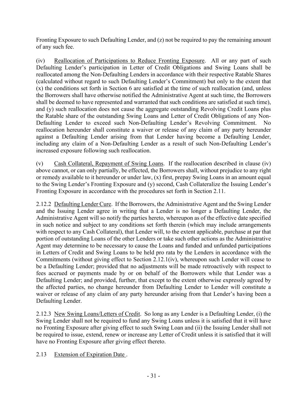 - 31 - Fronting Exposure to such Defaulting Lender, and (z) not be required to pay the remaining amount of any such fee. (iv) Reallocation of Participations to Reduce Fronting Exposure. All or any part of such Defaulting Lender’s participation in Letter of Credit Obligations and Swing Loans shall be reallocated among the Non-Defaulting Lenders in accordance with their respective Ratable Shares (calculated without regard to such Defaulting Lender’s Commitment) but only to the extent that (x) the conditions set forth in Section 6 are satisfied at the time of such reallocation (and, unless the Borrowers shall have otherwise notified the Administrative Agent at such time, the Borrowers shall be deemed to have represented and warranted that such conditions are satisfied at such time), and (y) such reallocation does not cause the aggregate outstanding Revolving Credit Loans plus the Ratable share of the outstanding Swing Loans and Letter of Credit Obligations of any Non- Defaulting Lender to exceed such Non-Defaulting Lender’s Revolving Commitment. No reallocation hereunder shall constitute a waiver or release of any claim of any party hereunder against a Defaulting Lender arising from that Lender having become a Defaulting Lender, including any claim of a Non-Defaulting Lender as a result of such Non-Defaulting Lender’s increased exposure following such reallocation. (v) Cash Collateral, Repayment of Swing Loans. If the reallocation described in clause (iv) above cannot, or can only partially, be effected, the Borrowers shall, without prejudice to any right or remedy available to it hereunder or under law, (x) first, prepay Swing Loans in an amount equal to the Swing Lender’s Fronting Exposure and (y) second, Cash Collateralize the Issuing Lender’s Fronting Exposure in accordance with the procedures set forth in Section 2.11. 2.12.2 Defaulting Lender Cure. If the Borrowers, the Administrative Agent and the Swing Lender and the Issuing Lender agree in writing that a Lender is no longer a Defaulting Lender, the Administrative Agent will so notify the parties hereto, whereupon as of the effective date specified in such notice and subject to any conditions set forth therein (which may include arrangements with respect to any Cash Collateral), that Lender will, to the extent applicable, purchase at par that portion of outstanding Loans of the other Lenders or take such other actions as the Administrative Agent may determine to be necessary to cause the Loans and funded and unfunded participations in Letters of Credit and Swing Loans to be held pro rata by the Lenders in accordance with the Commitments (without giving effect to Section 2.12.1(iv), whereupon such Lender will cease to be a Defaulting Lender; provided that no adjustments will be made retroactively with respect to fees accrued or payments made by or on behalf of the Borrowers while that Lender was a Defaulting Lender; and provided, further, that except to the extent otherwise expressly agreed by the affected parties, no change hereunder from Defaulting Lender to Lender will constitute a waiver or release of any claim of any party hereunder arising from that Lender’s having been a Defaulting Lender. 2.12.3 New Swing Loans/Letters of Credit. So long as any Lender is a Defaulting Lender, (i) the Swing Lender shall not be required to fund any Swing Loans unless it is satisfied that it will have no Fronting Exposure after giving effect to such Swing Loan and (ii) the Issuing Lender shall not be required to issue, extend, renew or increase any Letter of Credit unless it is satisfied that it will have no Fronting Exposure after giving effect thereto. 2.13 Extension of Expiration Date .