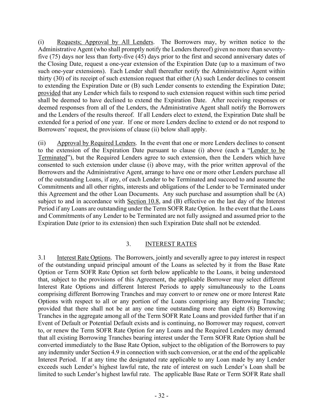 - 32 - (i) Requests; Approval by All Lenders. The Borrowers may, by written notice to the Administrative Agent (who shall promptly notify the Lenders thereof) given no more than seventy- five (75) days nor less than forty-five (45) days prior to the first and second anniversary dates of the Closing Date, request a one-year extension of the Expiration Date (up to a maximum of two such one-year extensions). Each Lender shall thereafter notify the Administrative Agent within thirty (30) of its receipt of such extension request that either (A) such Lender declines to consent to extending the Expiration Date or (B) such Lender consents to extending the Expiration Date; provided that any Lender which fails to respond to such extension request within such time period shall be deemed to have declined to extend the Expiration Date. After receiving responses or deemed responses from all of the Lenders, the Administrative Agent shall notify the Borrowers and the Lenders of the results thereof. If all Lenders elect to extend, the Expiration Date shall be extended for a period of one year. If one or more Lenders decline to extend or do not respond to Borrowers’ request, the provisions of clause (ii) below shall apply. (ii) Approval by Required Lenders. In the event that one or more Lenders declines to consent to the extension of the Expiration Date pursuant to clause (i) above (each a “Lender to be Terminated”), but the Required Lenders agree to such extension, then the Lenders which have consented to such extension under clause (i) above may, with the prior written approval of the Borrowers and the Administrative Agent, arrange to have one or more other Lenders purchase all of the outstanding Loans, if any, of each Lender to be Terminated and succeed to and assume the Commitments and all other rights, interests and obligations of the Lender to be Terminated under this Agreement and the other Loan Documents. Any such purchase and assumption shall be (A) subject to and in accordance with Section 10.8, and (B) effective on the last day of the Interest Period if any Loans are outstanding under the Term SOFR Rate Option. In the event that the Loans and Commitments of any Lender to be Terminated are not fully assigned and assumed prior to the Expiration Date (prior to its extension) then such Expiration Date shall not be extended. 3. INTEREST RATES 3.1 Interest Rate Options. The Borrowers, jointly and severally agree to pay interest in respect of the outstanding unpaid principal amount of the Loans as selected by it from the Base Rate Option or Term SOFR Rate Option set forth below applicable to the Loans, it being understood that, subject to the provisions of this Agreement, the applicable Borrower may select different Interest Rate Options and different Interest Periods to apply simultaneously to the Loans comprising different Borrowing Tranches and may convert to or renew one or more Interest Rate Options with respect to all or any portion of the Loans comprising any Borrowing Tranche; provided that there shall not be at any one time outstanding more than eight (8) Borrowing Tranches in the aggregate among all of the Term SOFR Rate Loans and provided further that if an Event of Default or Potential Default exists and is continuing, no Borrower may request, convert to, or renew the Term SOFR Rate Option for any Loans and the Required Lenders may demand that all existing Borrowing Tranches bearing interest under the Term SOFR Rate Option shall be converted immediately to the Base Rate Option, subject to the obligation of the Borrowers to pay any indemnity under Section 4.9 in connection with such conversion, or at the end of the applicable Interest Period. If at any time the designated rate applicable to any Loan made by any Lender exceeds such Lender’s highest lawful rate, the rate of interest on such Lender’s Loan shall be limited to such Lender’s highest lawful rate. The applicable Base Rate or Term SOFR Rate shall