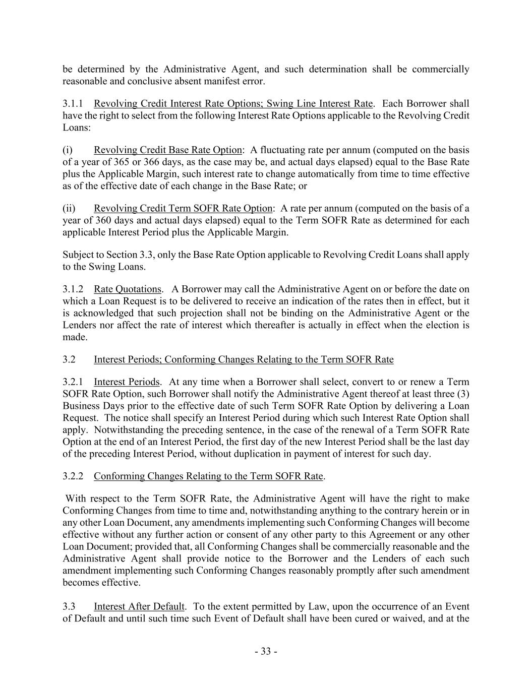 - 33 - be determined by the Administrative Agent, and such determination shall be commercially reasonable and conclusive absent manifest error. 3.1.1 Revolving Credit Interest Rate Options; Swing Line Interest Rate. Each Borrower shall have the right to select from the following Interest Rate Options applicable to the Revolving Credit Loans: (i) Revolving Credit Base Rate Option: A fluctuating rate per annum (computed on the basis of a year of 365 or 366 days, as the case may be, and actual days elapsed) equal to the Base Rate plus the Applicable Margin, such interest rate to change automatically from time to time effective as of the effective date of each change in the Base Rate; or (ii) Revolving Credit Term SOFR Rate Option: A rate per annum (computed on the basis of a year of 360 days and actual days elapsed) equal to the Term SOFR Rate as determined for each applicable Interest Period plus the Applicable Margin. Subject to Section 3.3, only the Base Rate Option applicable to Revolving Credit Loans shall apply to the Swing Loans. 3.1.2 Rate Quotations. A Borrower may call the Administrative Agent on or before the date on which a Loan Request is to be delivered to receive an indication of the rates then in effect, but it is acknowledged that such projection shall not be binding on the Administrative Agent or the Lenders nor affect the rate of interest which thereafter is actually in effect when the election is made. 3.2 Interest Periods; Conforming Changes Relating to the Term SOFR Rate 3.2.1 Interest Periods. At any time when a Borrower shall select, convert to or renew a Term SOFR Rate Option, such Borrower shall notify the Administrative Agent thereof at least three (3) Business Days prior to the effective date of such Term SOFR Rate Option by delivering a Loan Request. The notice shall specify an Interest Period during which such Interest Rate Option shall apply. Notwithstanding the preceding sentence, in the case of the renewal of a Term SOFR Rate Option at the end of an Interest Period, the first day of the new Interest Period shall be the last day of the preceding Interest Period, without duplication in payment of interest for such day. 3.2.2 Conforming Changes Relating to the Term SOFR Rate. With respect to the Term SOFR Rate, the Administrative Agent will have the right to make Conforming Changes from time to time and, notwithstanding anything to the contrary herein or in any other Loan Document, any amendments implementing such Conforming Changes will become effective without any further action or consent of any other party to this Agreement or any other Loan Document; provided that, all Conforming Changes shall be commercially reasonable and the Administrative Agent shall provide notice to the Borrower and the Lenders of each such amendment implementing such Conforming Changes reasonably promptly after such amendment becomes effective. 3.3 Interest After Default. To the extent permitted by Law, upon the occurrence of an Event of Default and until such time such Event of Default shall have been cured or waived, and at the