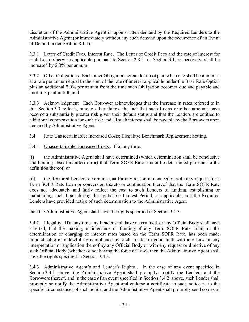 - 34 - discretion of the Administrative Agent or upon written demand by the Required Lenders to the Administrative Agent (or immediately without any such demand upon the occurrence of an Event of Default under Section 8.1.1): 3.3.1 Letter of Credit Fees, Interest Rate. The Letter of Credit Fees and the rate of interest for each Loan otherwise applicable pursuant to Section 2.8.2 or Section 3.1, respectively, shall be increased by 2.0% per annum; 3.3.2 Other Obligations. Each other Obligation hereunder if not paid when due shall bear interest at a rate per annum equal to the sum of the rate of interest applicable under the Base Rate Option plus an additional 2.0% per annum from the time such Obligation becomes due and payable and until it is paid in full; and 3.3.3 Acknowledgment. Each Borrower acknowledges that the increase in rates referred to in this Section 3.3 reflects, among other things, the fact that such Loans or other amounts have become a substantially greater risk given their default status and that the Lenders are entitled to additional compensation for such risk; and all such interest shall be payable by the Borrowers upon demand by Administrative Agent. 3.4 Rate Unascertainable; Increased Costs; Illegality; Benchmark Replacement Setting. 3.4.1 Unascertainable; Increased Costs . If at any time: (i) the Administrative Agent shall have determined (which determination shall be conclusive and binding absent manifest error) that Term SOFR Rate cannot be determined pursuant to the definition thereof; or (ii) the Required Lenders determine that for any reason in connection with any request for a Term SOFR Rate Loan or conversion thereto or continuation thereof that the Term SOFR Rate does not adequately and fairly reflect the cost to such Lenders of funding, establishing or maintaining such Loan during the applicable Interest Period, as applicable, and the Required Lenders have provided notice of such determination to the Administrative Agent then the Administrative Agent shall have the rights specified in Section 3.4.3. 3.4.2 Illegality. If at any time any Lender shall have determined, or any Official Body shall have asserted, that the making, maintenance or funding of any Term SOFR Rate Loan, or the determination or charging of interest rates based on the Term SOFR Rate, has been made impracticable or unlawful by compliance by such Lender in good faith with any Law or any interpretation or application thereof by any Official Body or with any request or directive of any such Official Body (whether or not having the force of Law), then the Administrative Agent shall have the rights specified in Section 3.4.3. 3.4.3 Administrative Agent’s and Lender’s Rights . In the case of any event specified in Section 3.4.1 above, the Administrative Agent shall promptly notify the Lenders and the Borrowers thereof, and in the case of an event specified in Section 3.4.2 above, such Lender shall promptly so notify the Administrative Agent and endorse a certificate to such notice as to the specific circumstances of such notice, and the Administrative Agent shall promptly send copies of